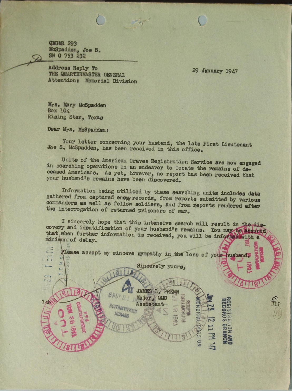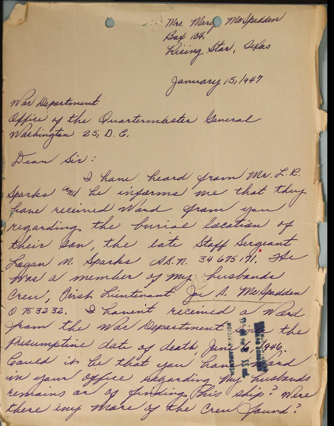 is from Mrs. Mary McSpadden to the War Department. She had learned from the family of SSgt Logan Sparks his burial location. A reply dated 29 January 1947 from the Office of the Quartermaster General ( OQMG ), informed Mrs. McSpadden that her husband's remains have not been recovered. |
