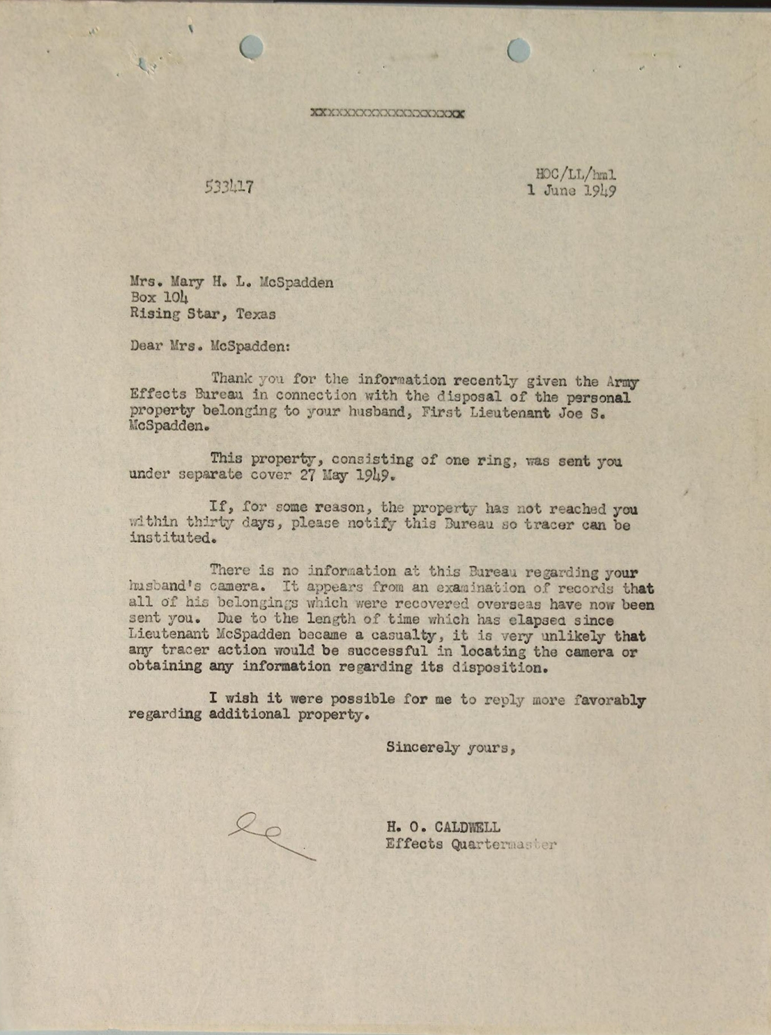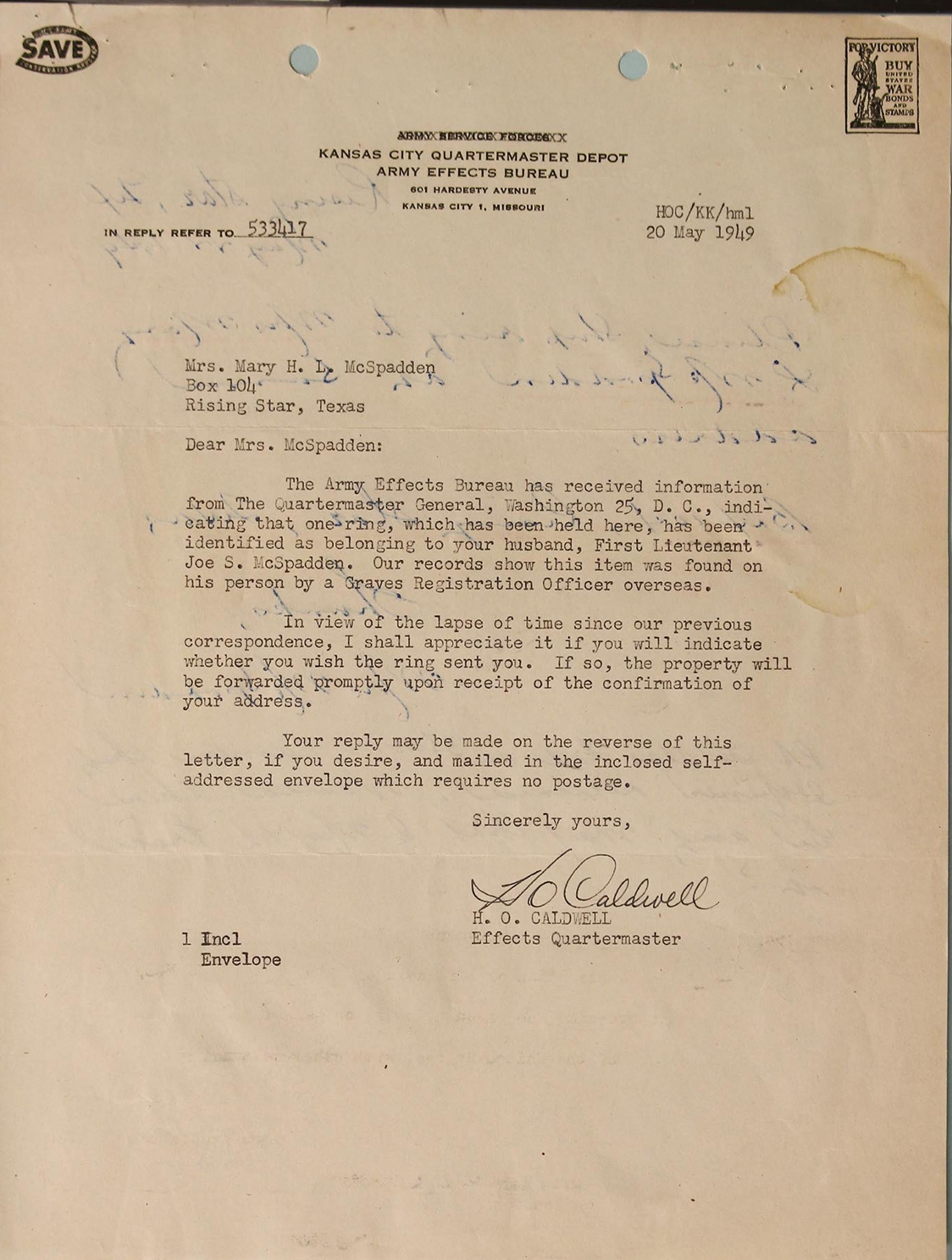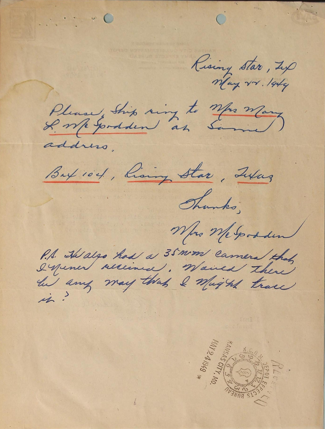 In May 1949, a letter from the Kansas City Quartermaster Depot