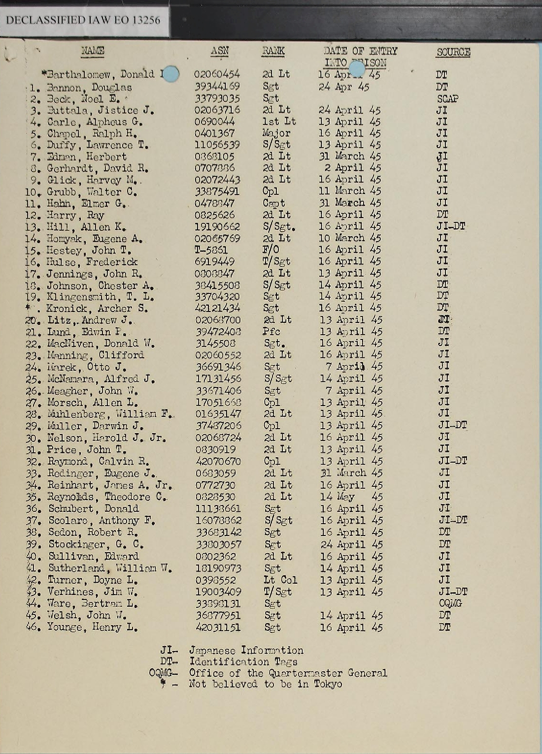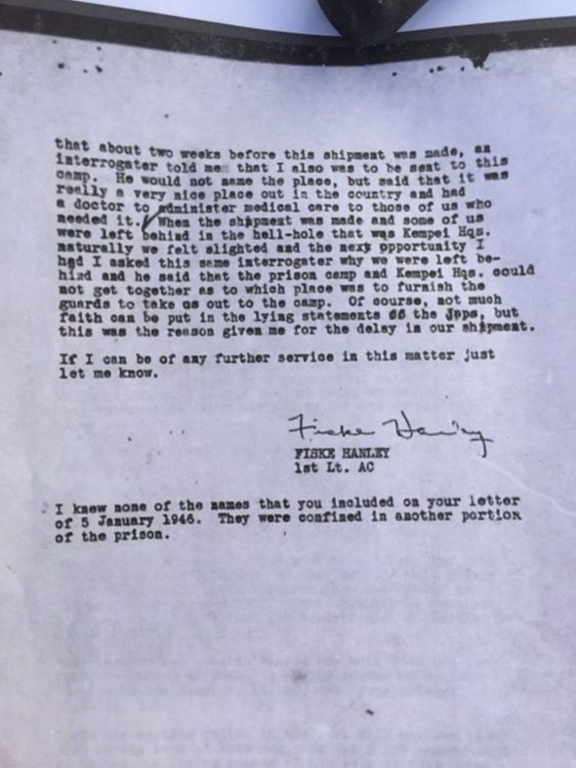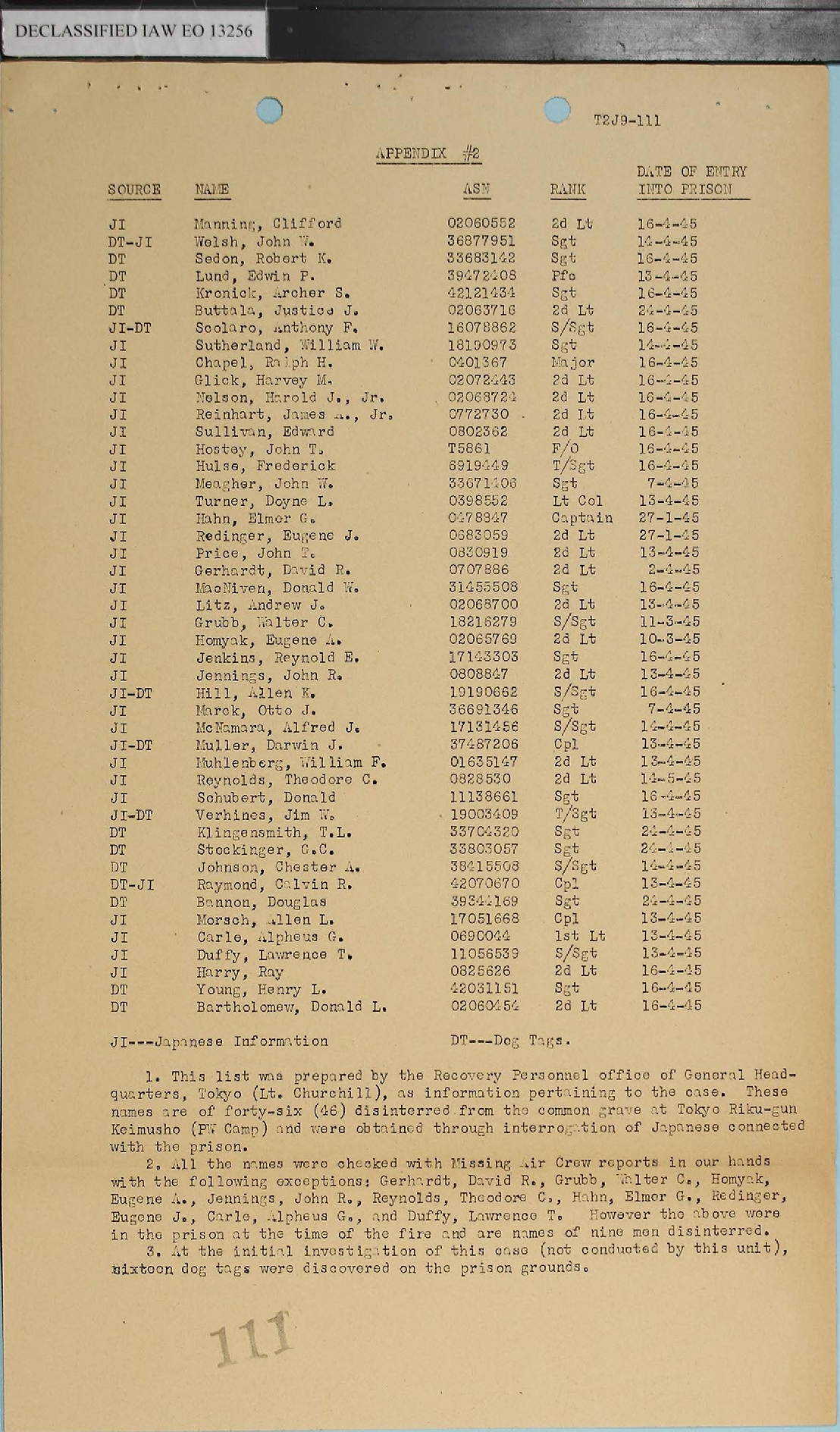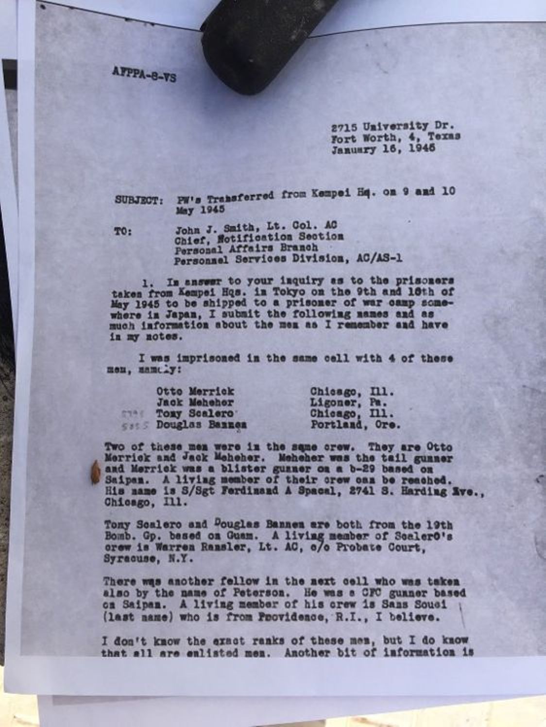 of the remains recovered at the Tokyo Military Prison. At the bottom is a letter written by 1st Lt Fiske Hanley with names of some of the men confined in the Tokyo Kempei Tai Headquarters jail . |