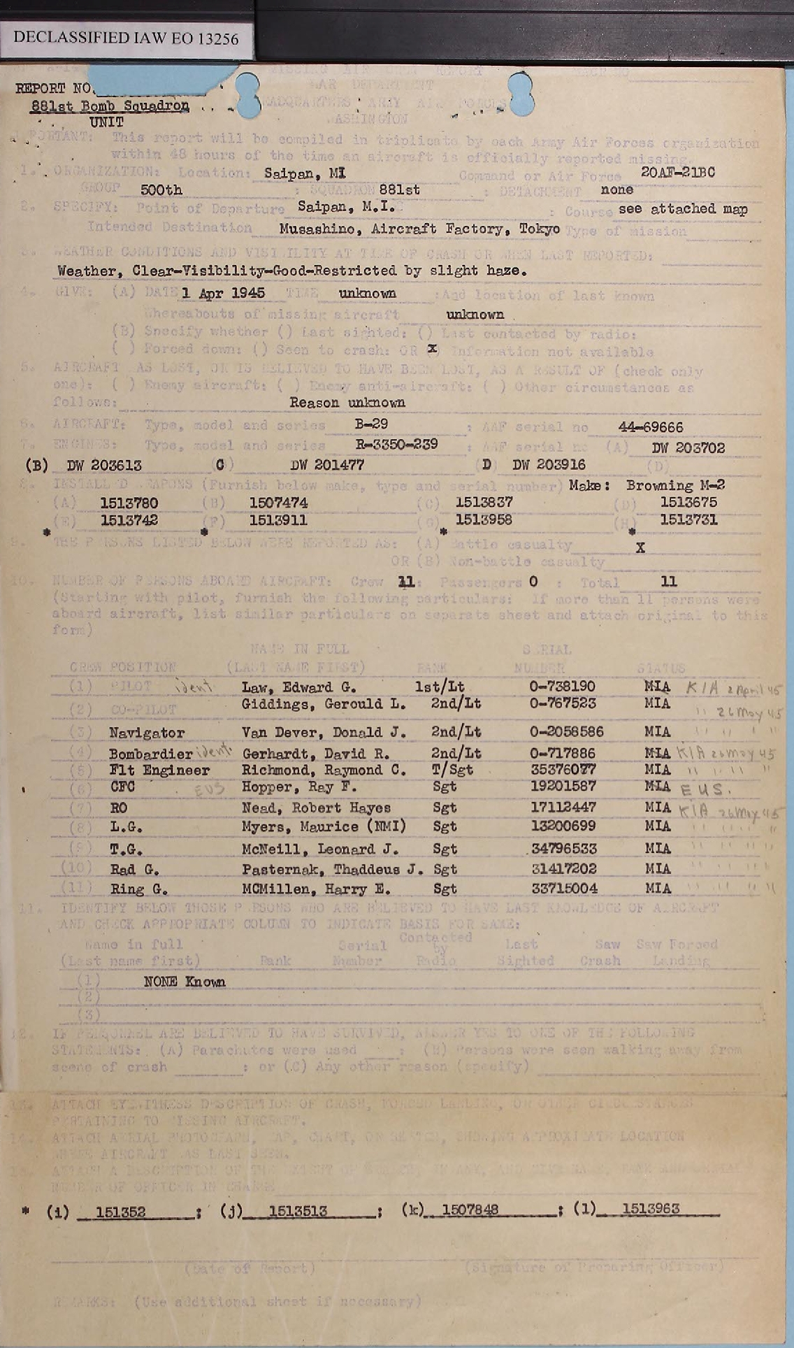 The first document is the Missing Air Crew Report found in Sgt Myers'