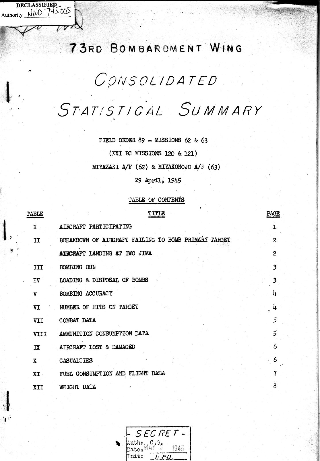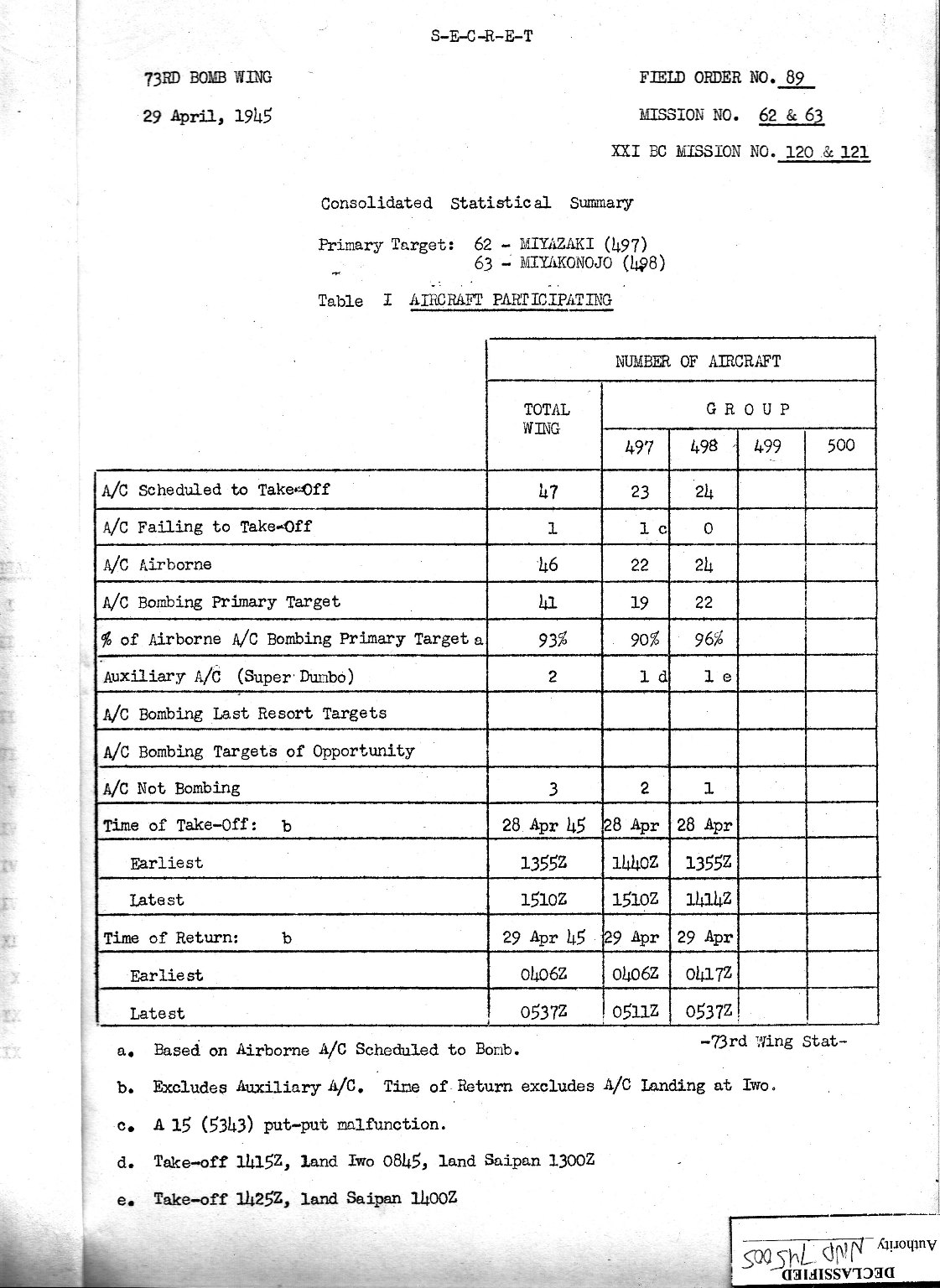 73rd Bomb Wing Field Order 89 is for Missions 62 and 63