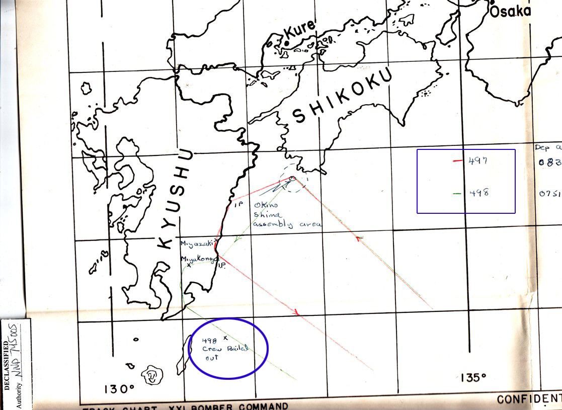 Outlined with a blue oval is the location where other B-29s saw T-4