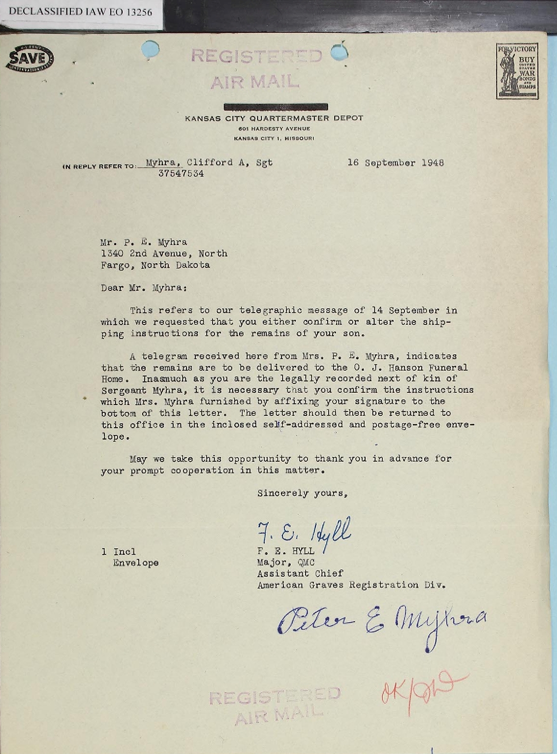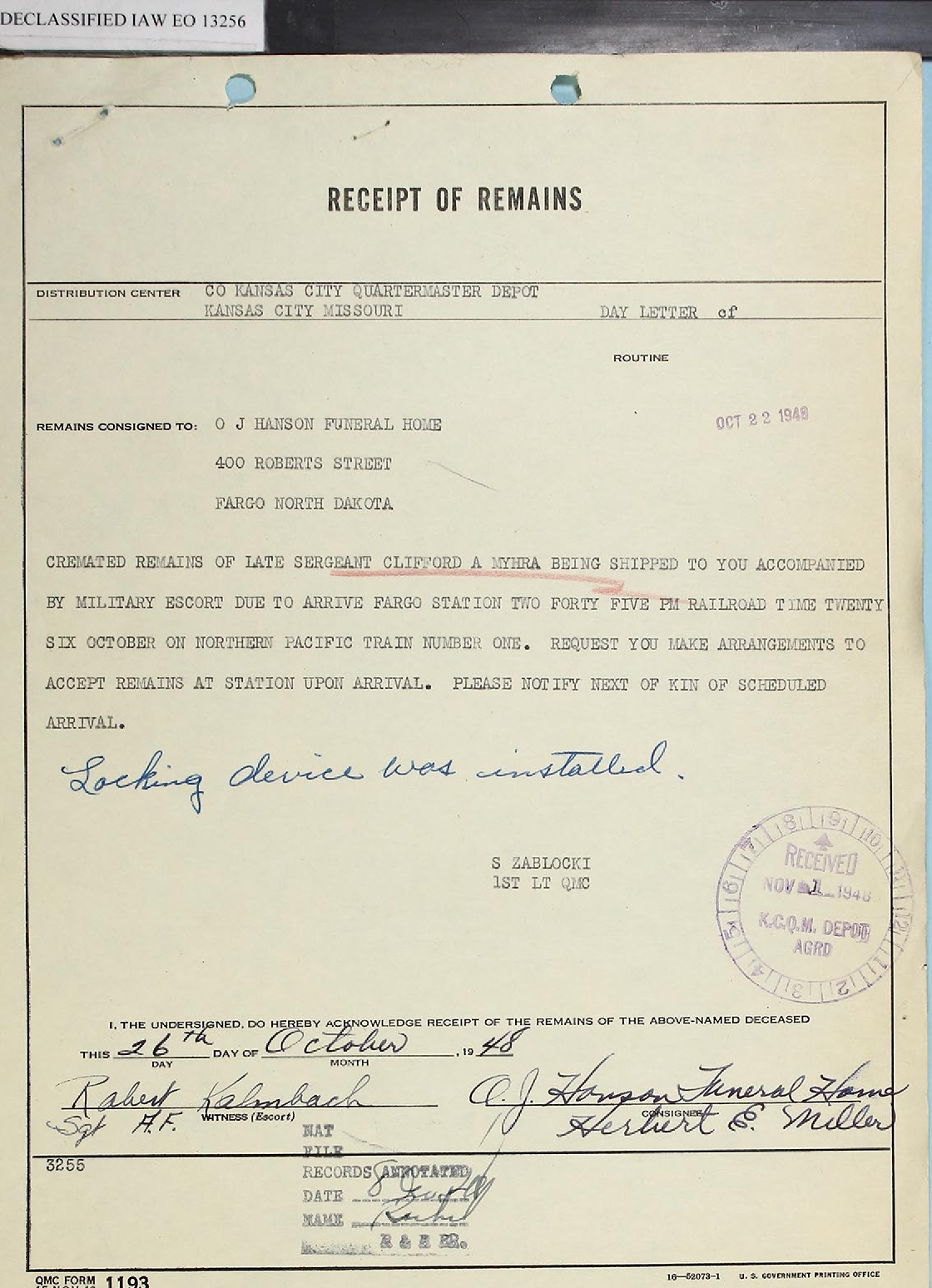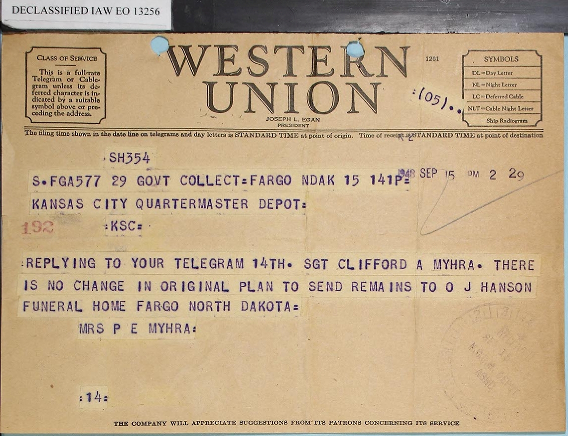 Sgt Myhra's remains are to be delivered to the O.J. Hanson Funeral Home. At the bottom of the page is the document titled Receipt of Remains |