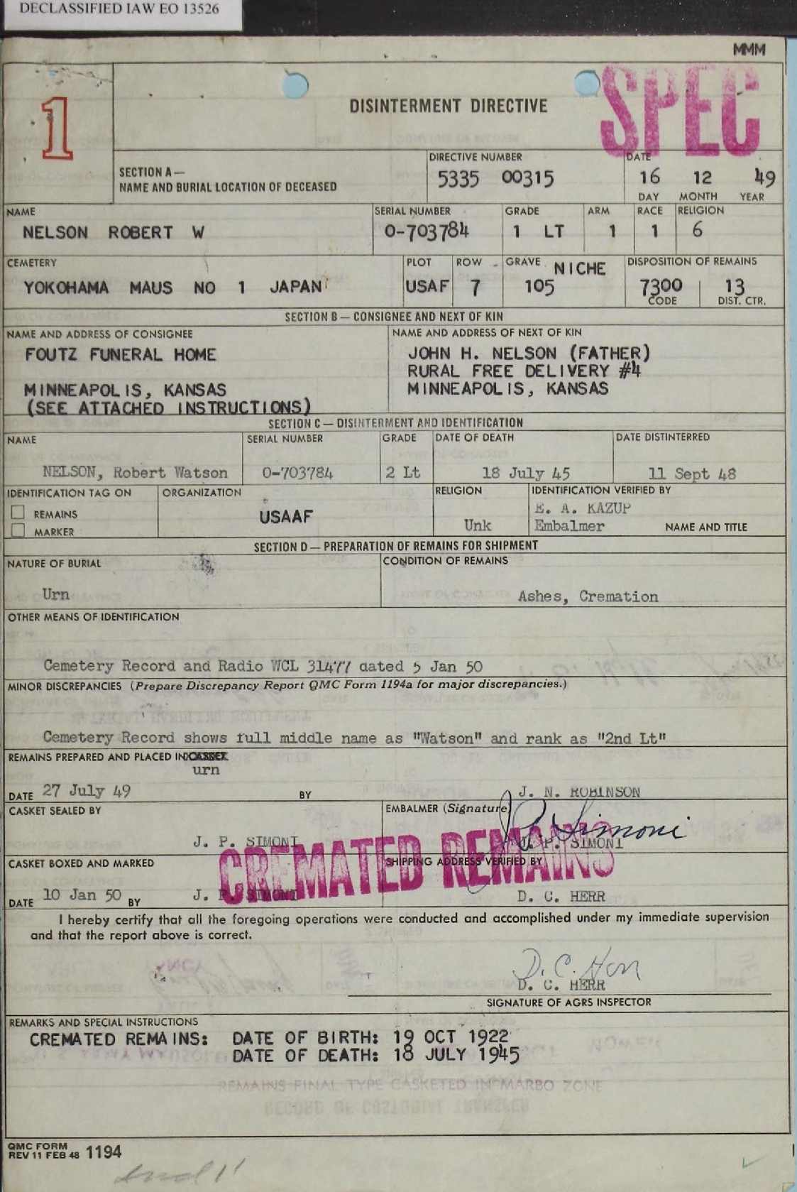 On this page you will find Lt Nelson's DISINTERMENT