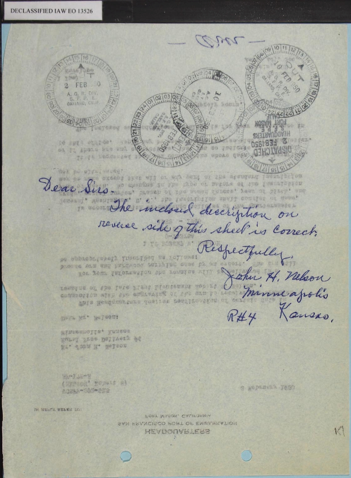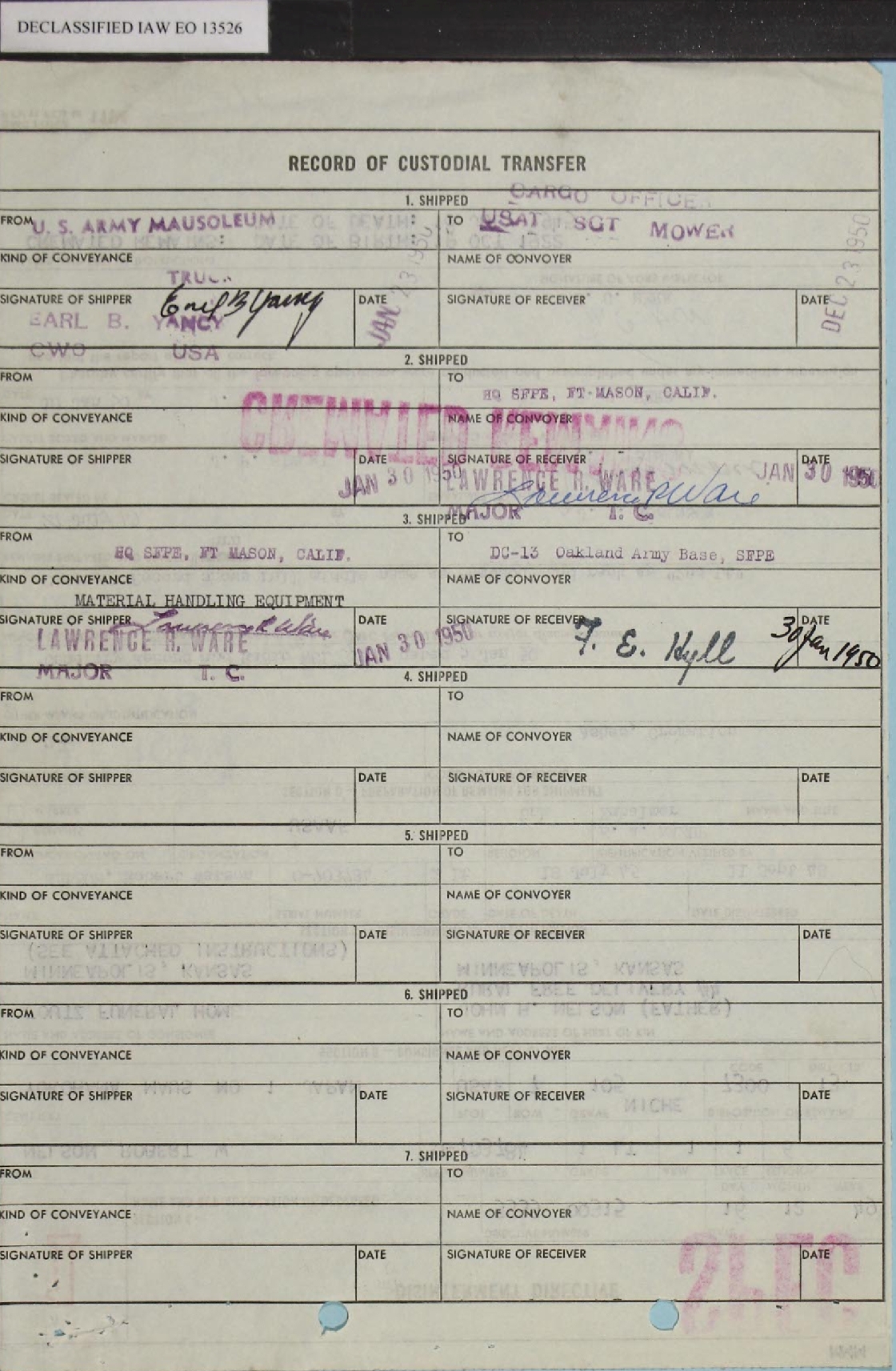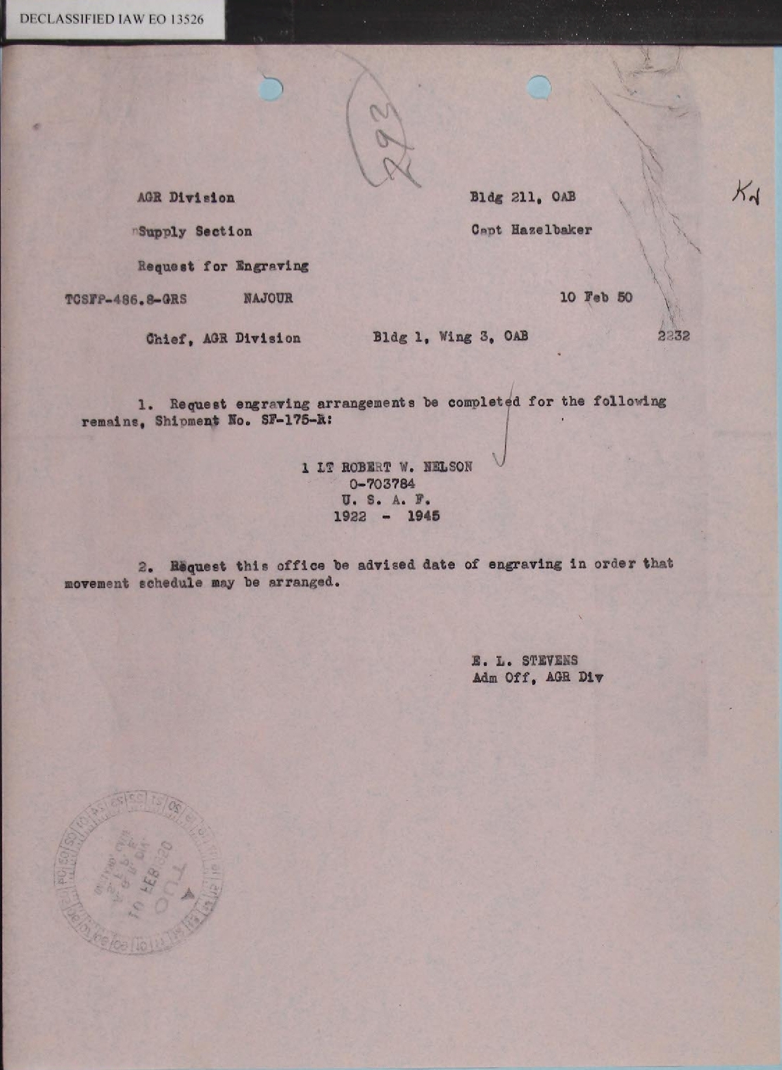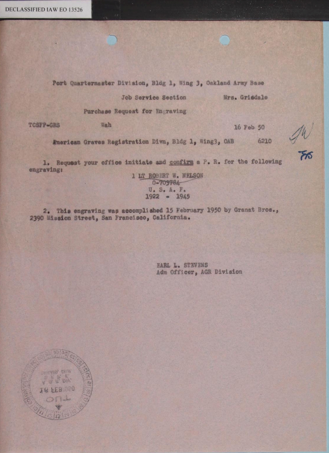 RECORD OF CUSTODIAL TRANSFER. The dates in these two documents are a bit confusing but his remains did arrive at Fort Mason on 30 January 1950. Lt Nelson's cremated remains were placed in an urn that had been engraved in San Francisco. The final four documents on this page concern the approval and wording of the engraving which was completed on 15 February 1950. |