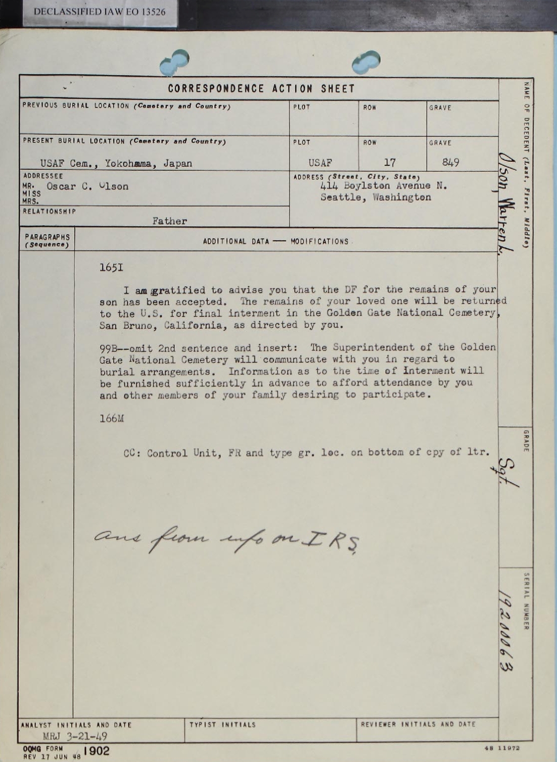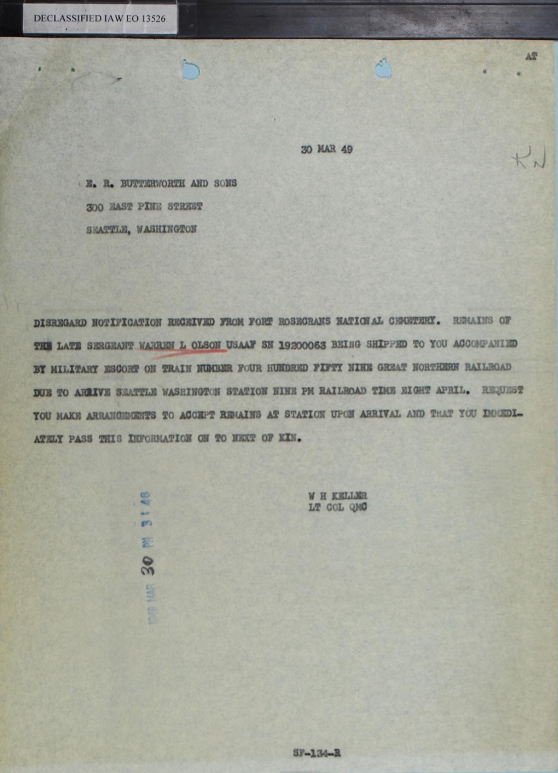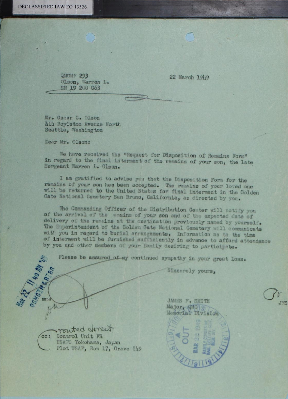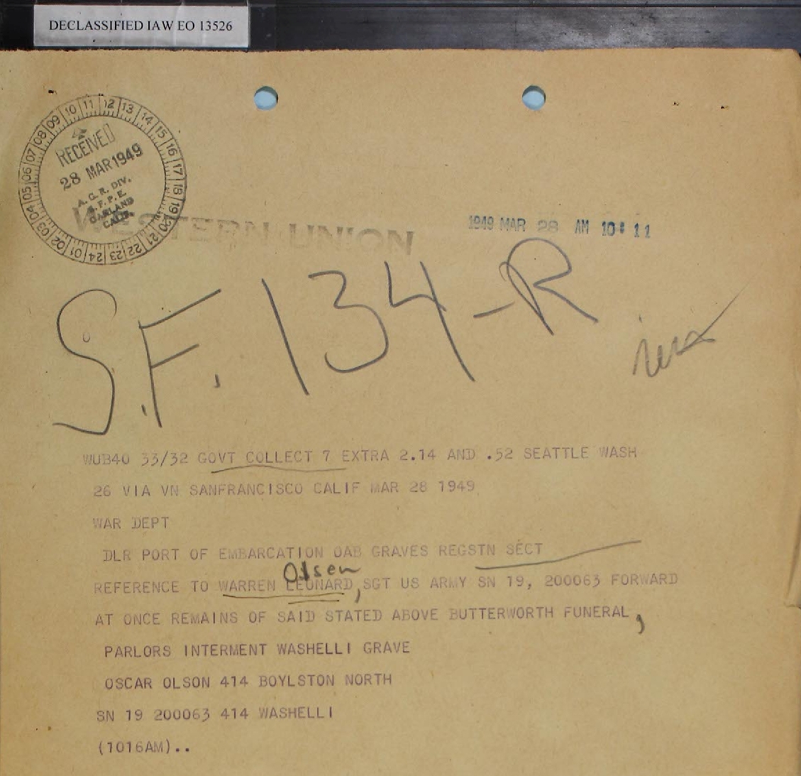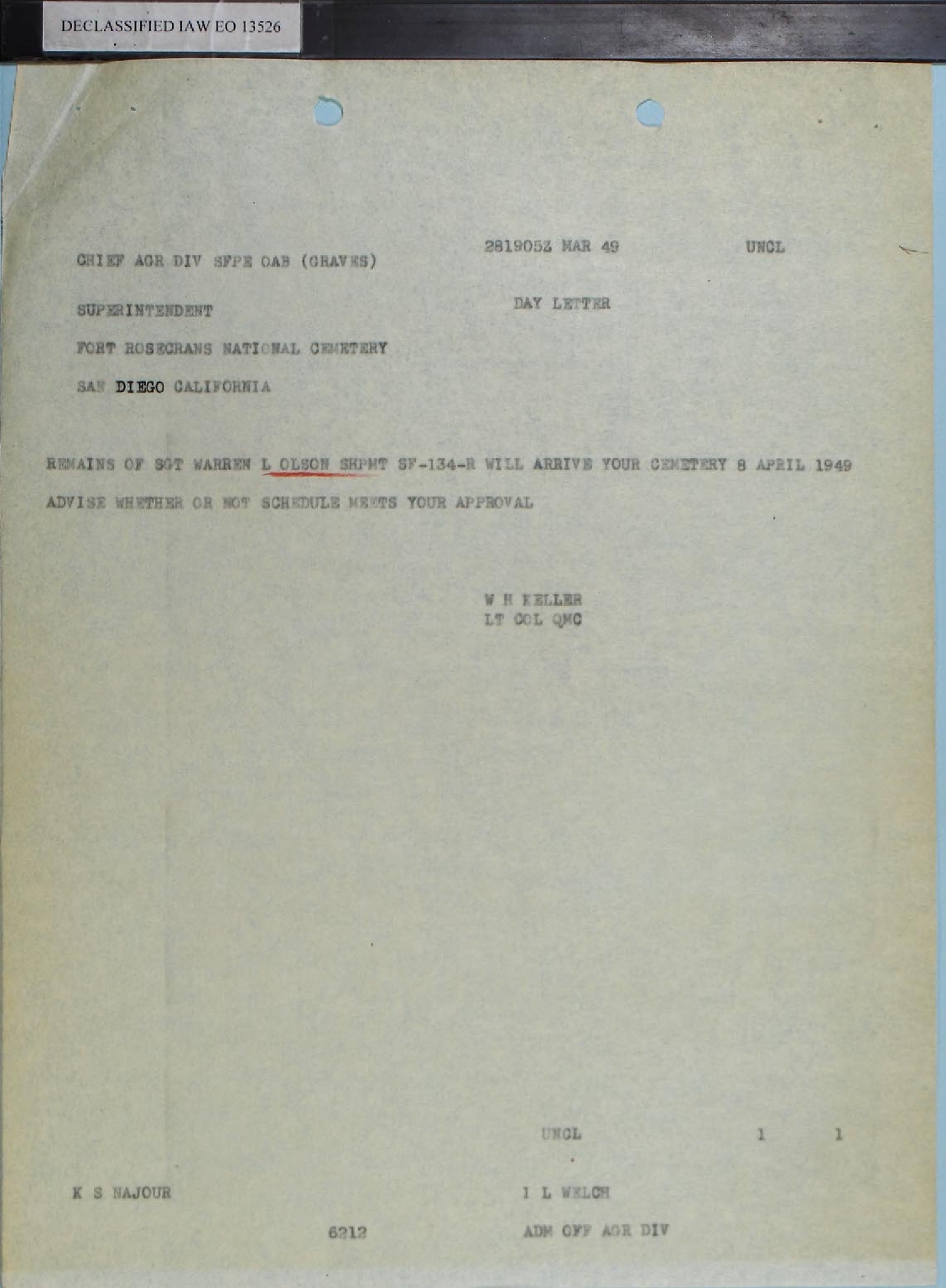 The last week of March 1949 was a busy one. A formal letter with this information was sent to Oscar Olson from On 28 March 1949 a Day Letter was sent to Fort Rosecrans with notification Also on 28 March 1949 a telegram was sent from the War Department