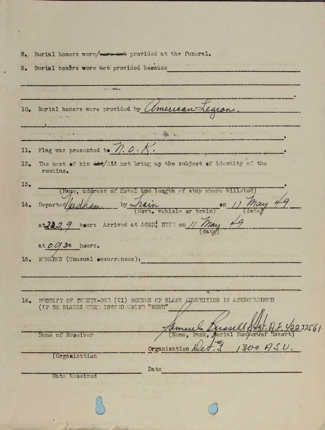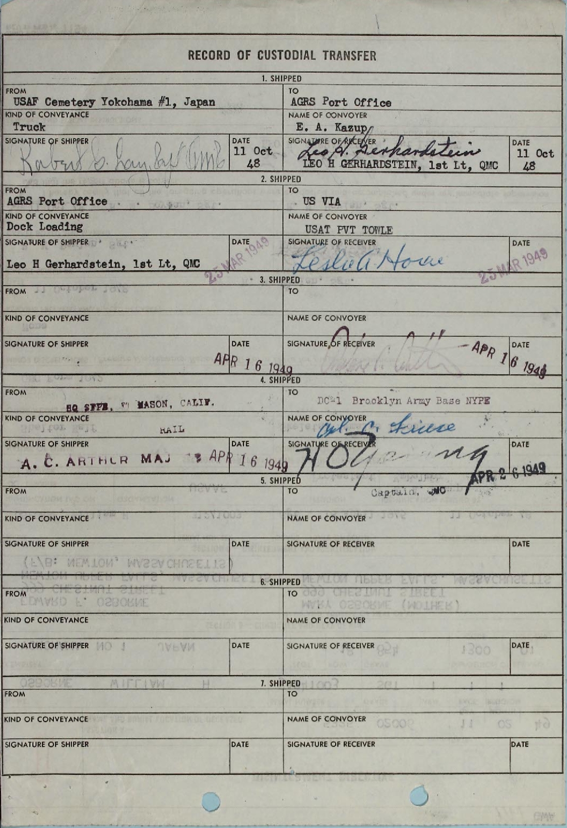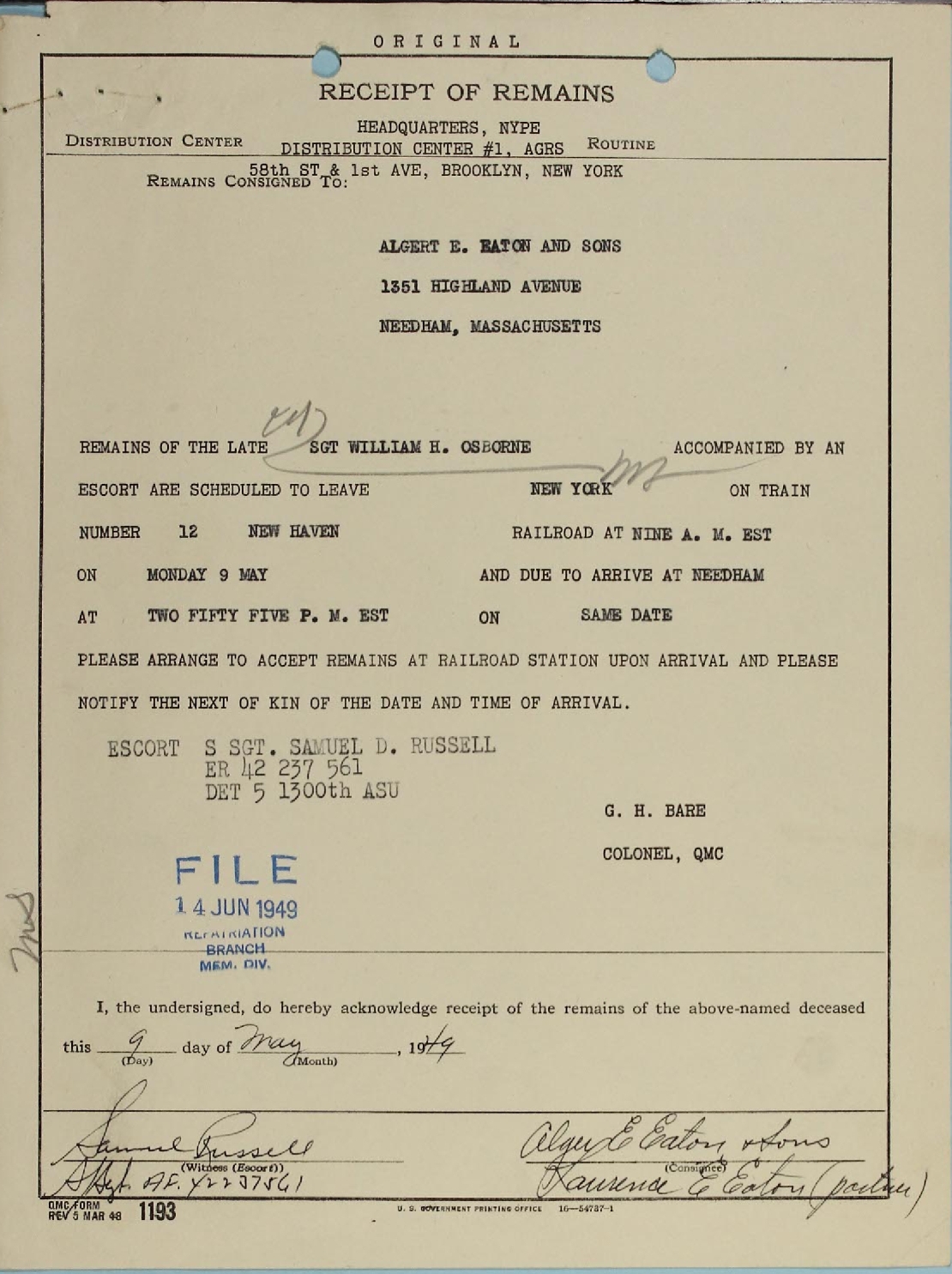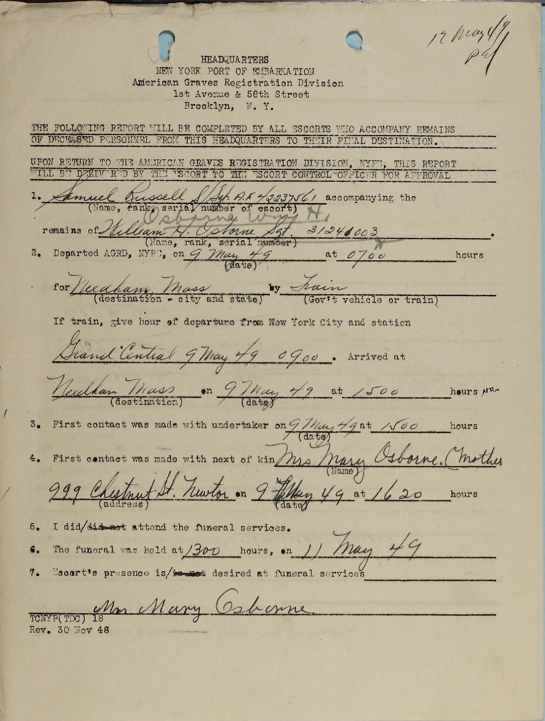 from Yokohama, Japan, to Newton, Massachusetts. The document seen in many of the POW Honor Roll pages, Receipt of Remains, is at the bottom. In addition, there are two handwritten pages documenting each step of handling Sgt Osborne's remains from the New York Port of Embarcation to Newton, Massachusetts |