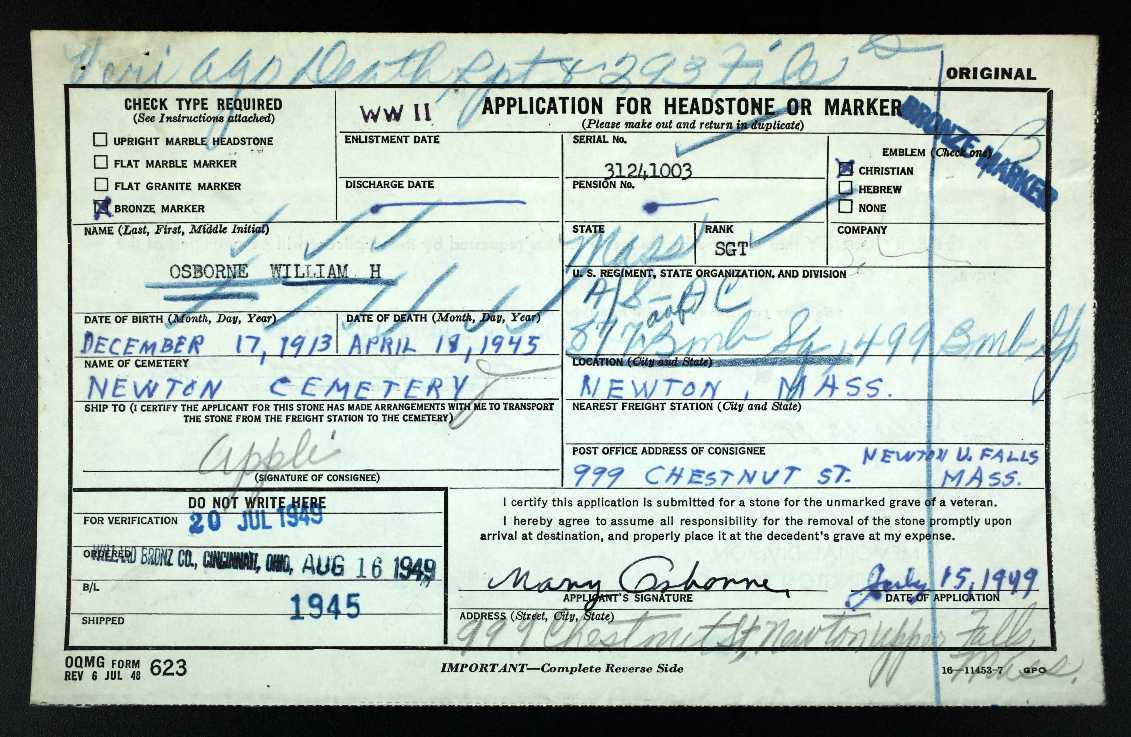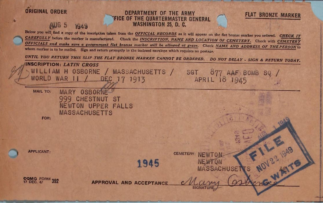 Newton Cemetery and Arboretum, Newton Massachusetts Below is his mother's Application for Headstone or Marker followed by the approval from The Office of the Quartermaster General |