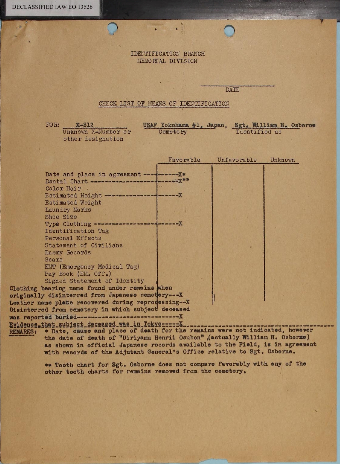 UNDATED CHECK LIST FOR IDENTIFICATION X-312 IDENTIFIED AS SGT WILLIAM H OSBORNE