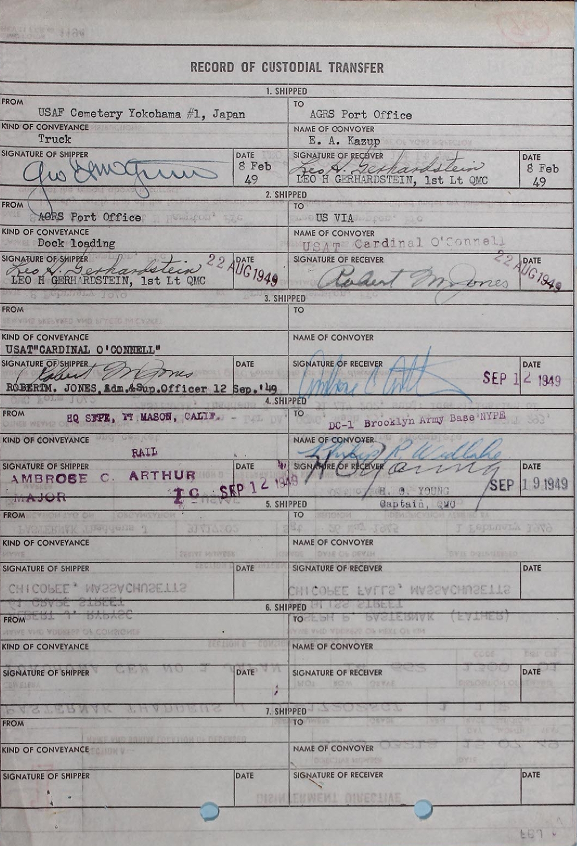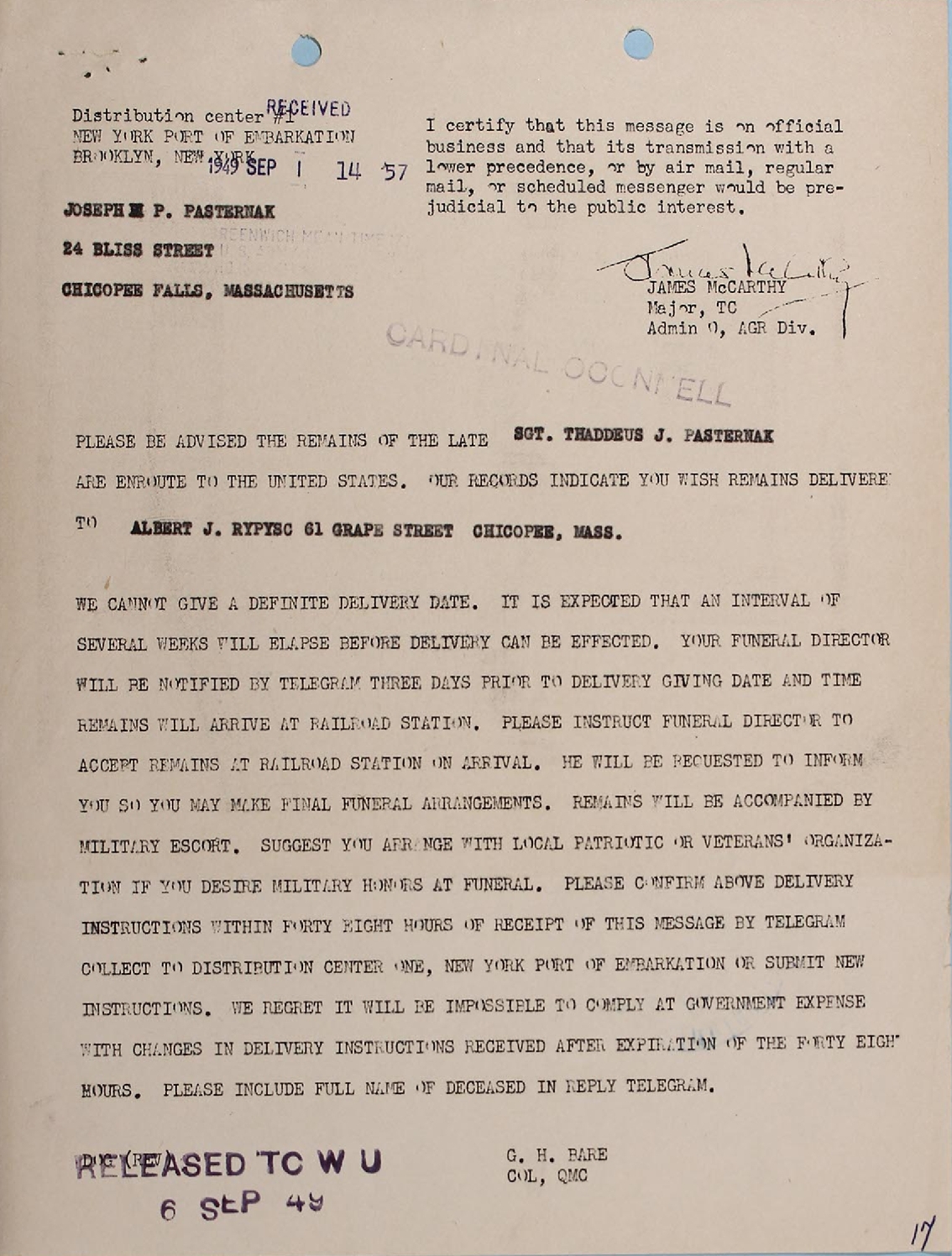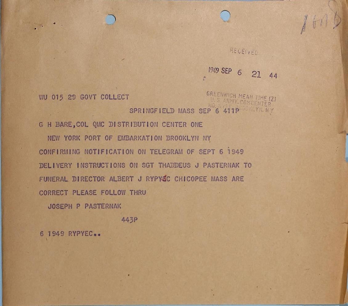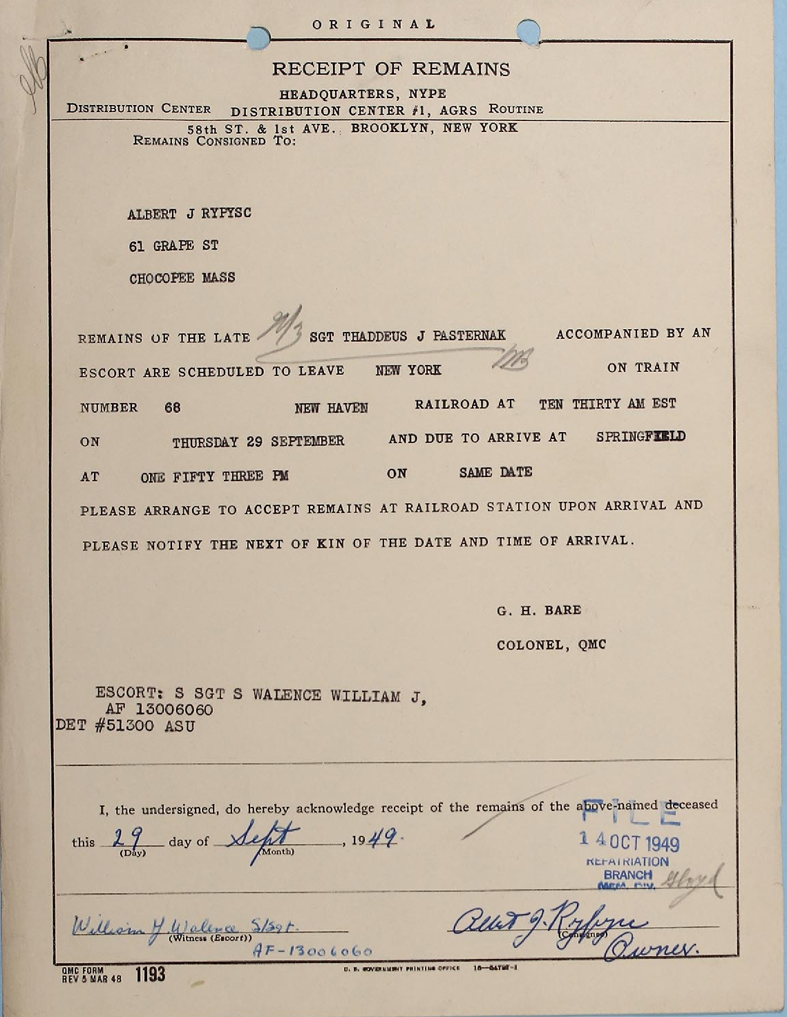 On 29 Sep 1949 Sgt Pasternak's remains were transported by