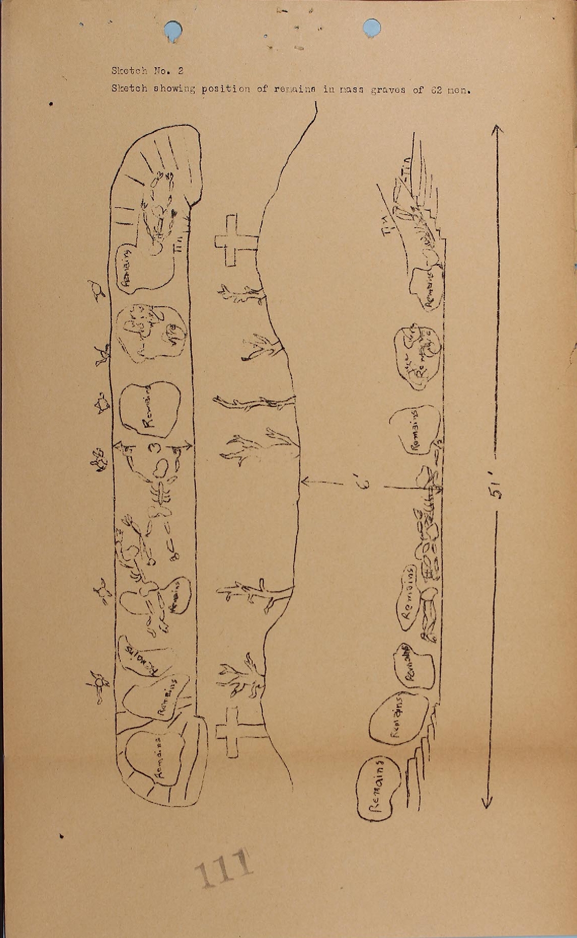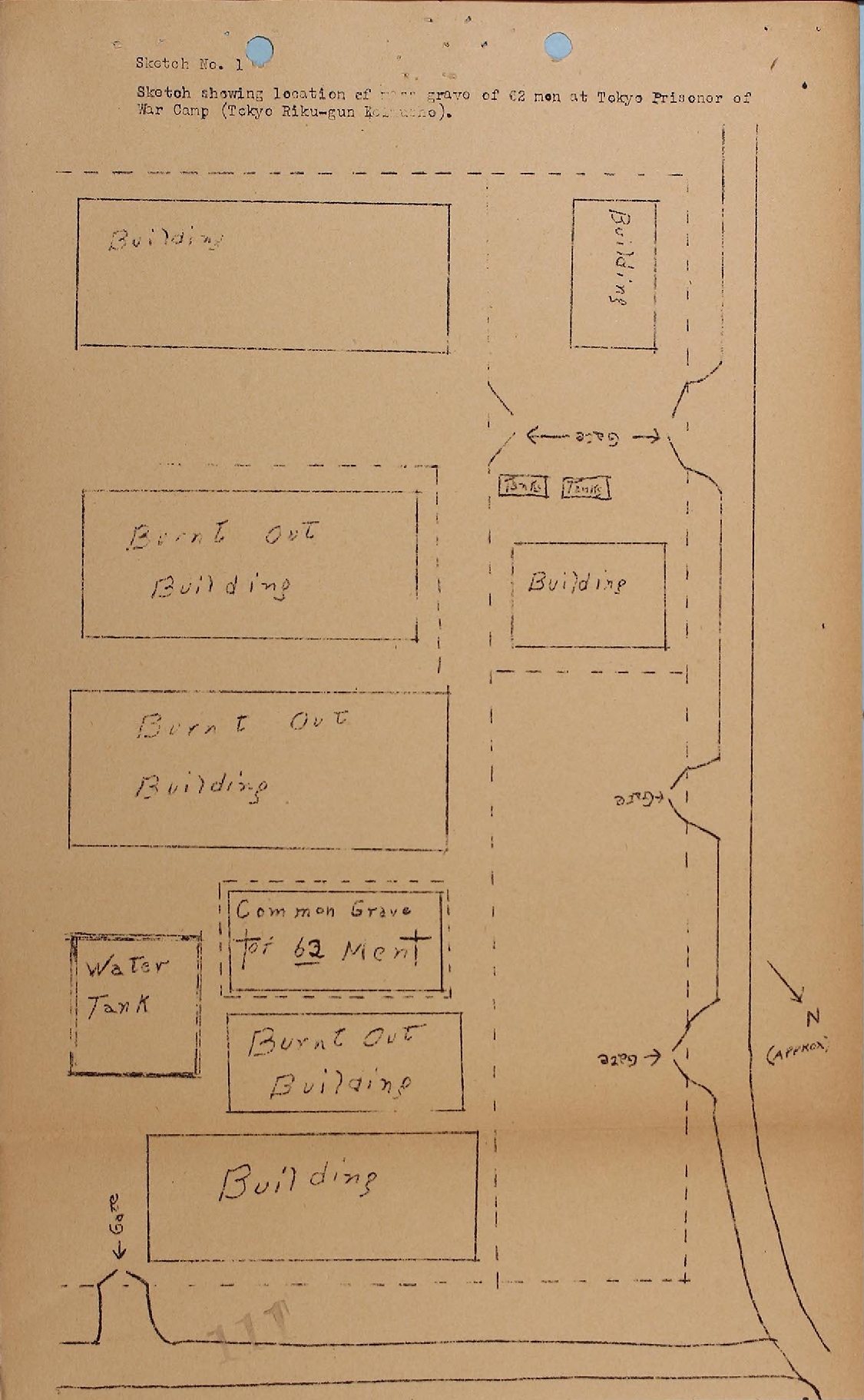 took place from 14-21 February 1946. Sgt Pasternak was not formally identified until April 1949. You will find overlaps between the Recovery and the Identification sections at this web site. There is also an overlap concerning several lists of names such as the below list of 46 men from Appendix 2. Case History 111 at the main page of the POW Honor Roll contains 213 pages and many of these lists can be found there. At the bottom of this page are two sketches of the Prison Layout from Case History 111. The sketch of the mass burial site does not indicate the location where each Unknown was recovered. |