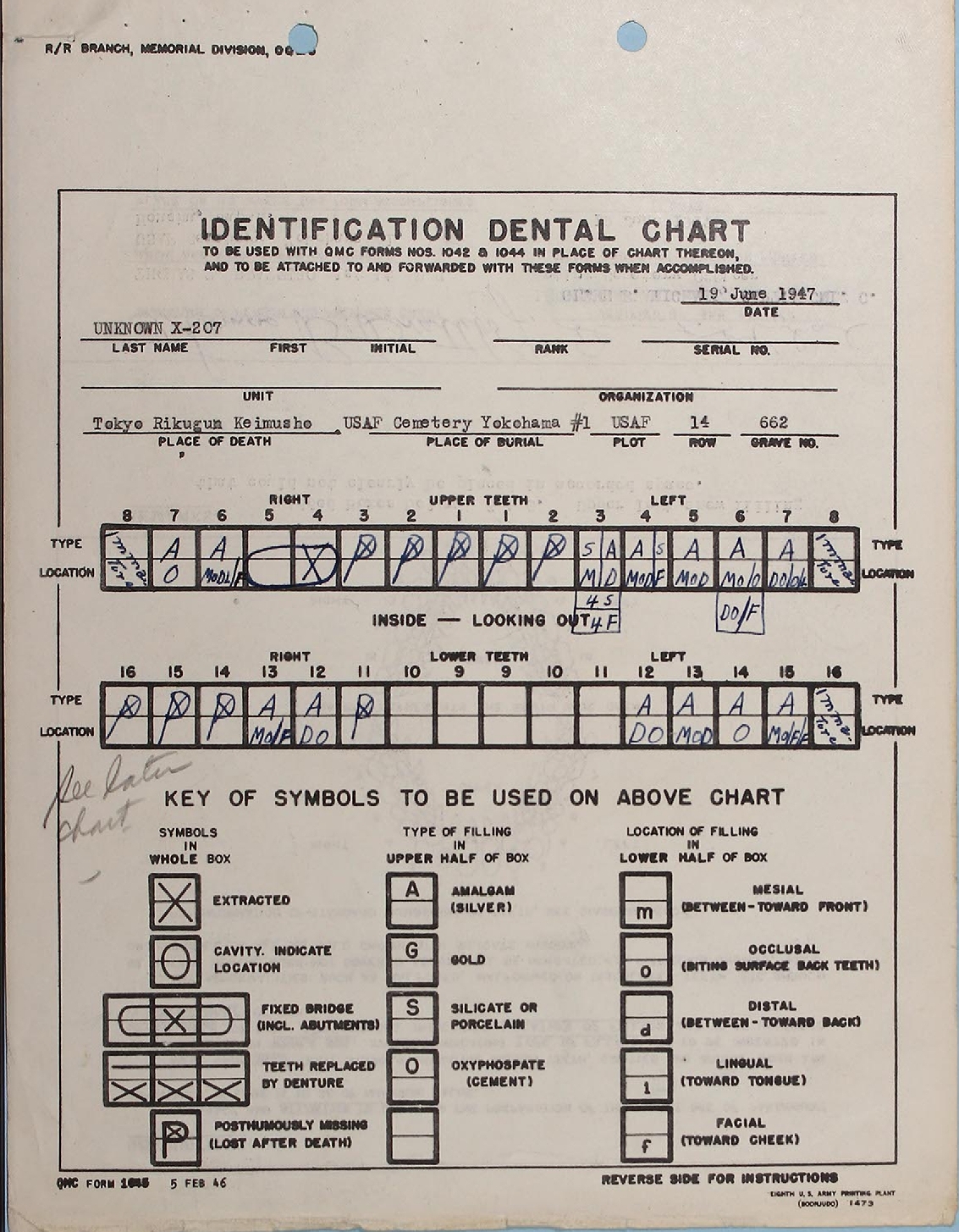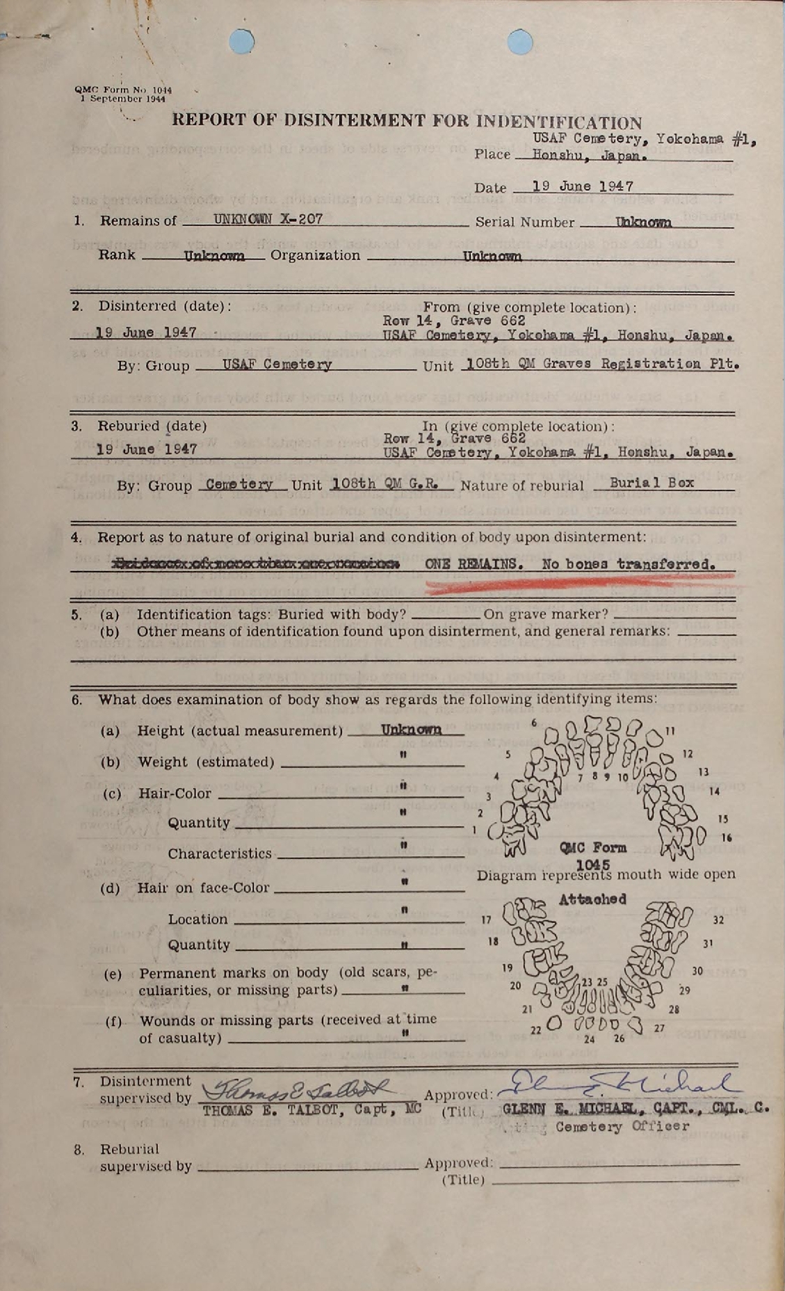 REPORT OF DISINTERMENT FOR IDENTIFICAION UNKNOWN X-Z : Tokyo Military Prison |