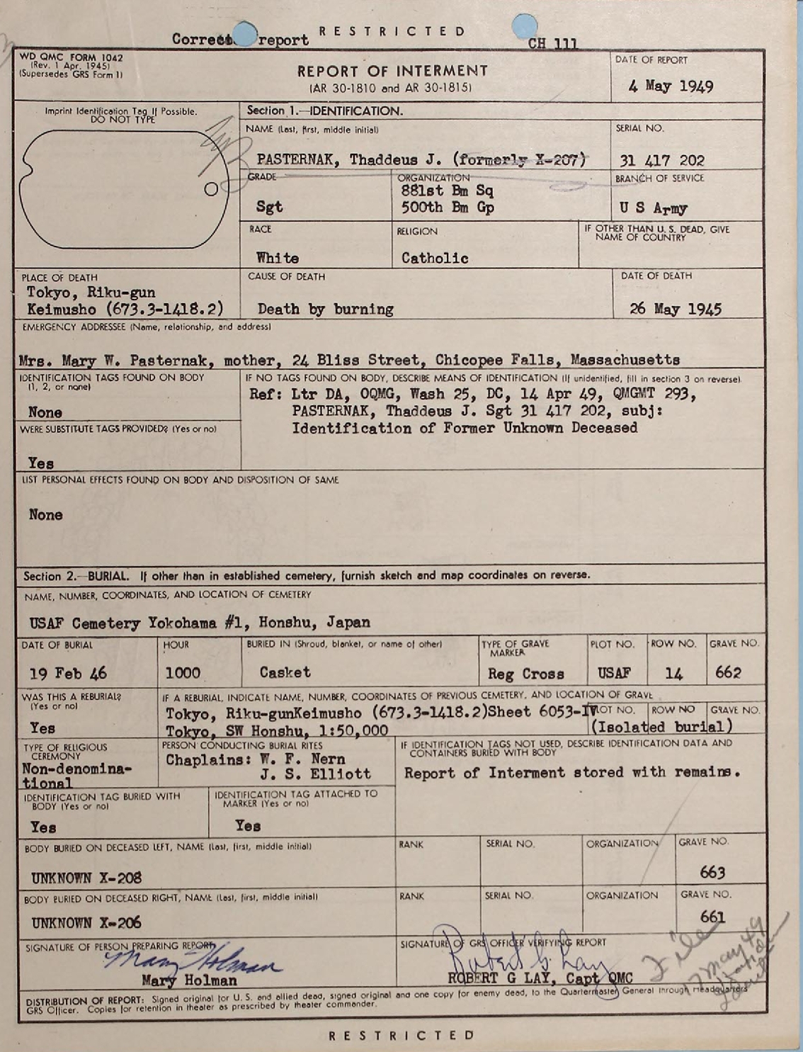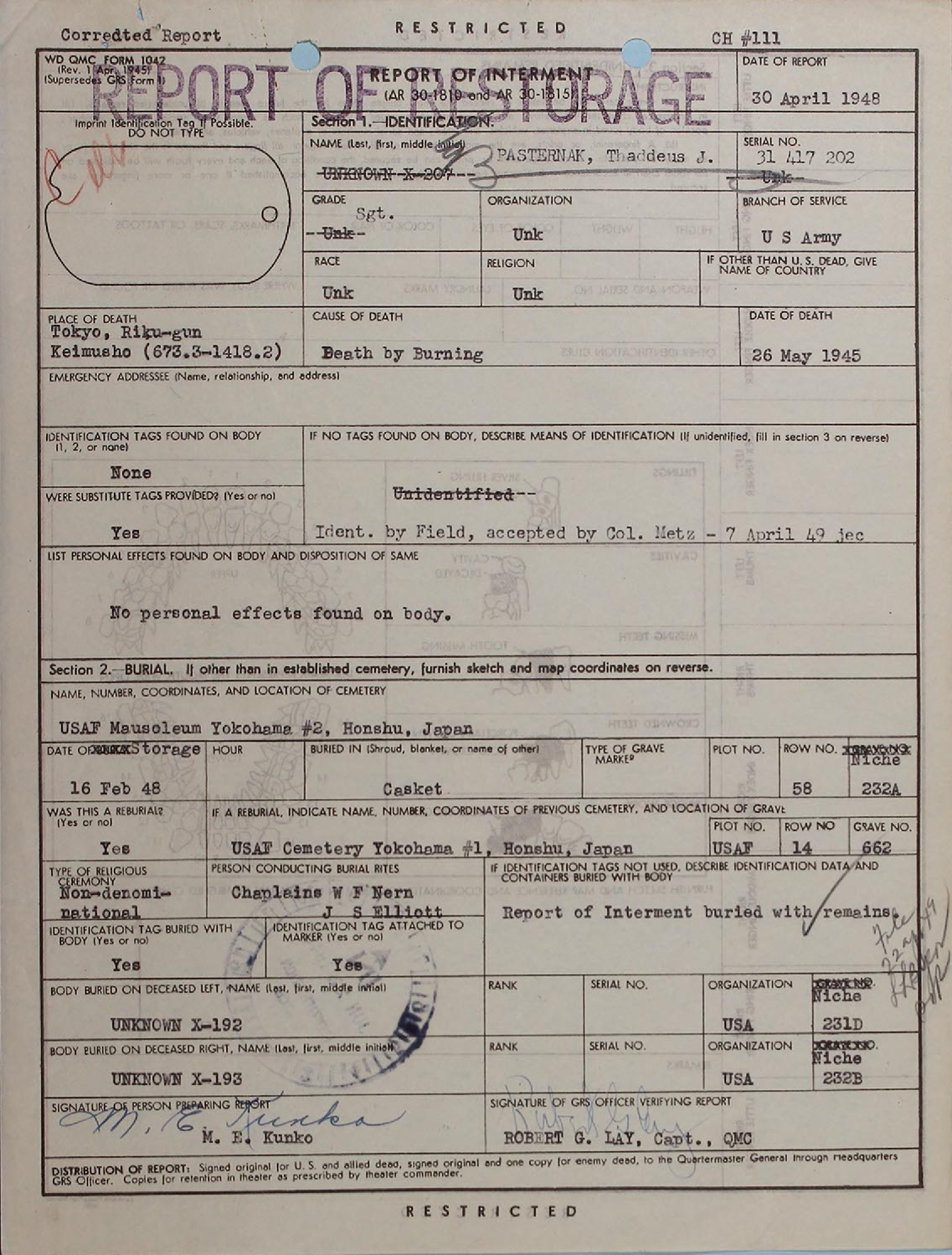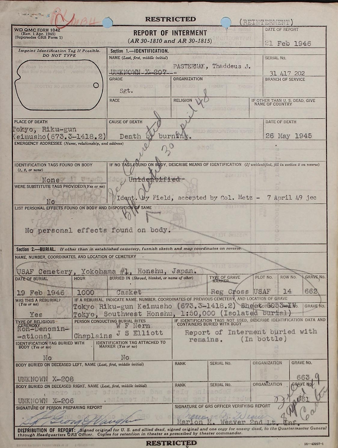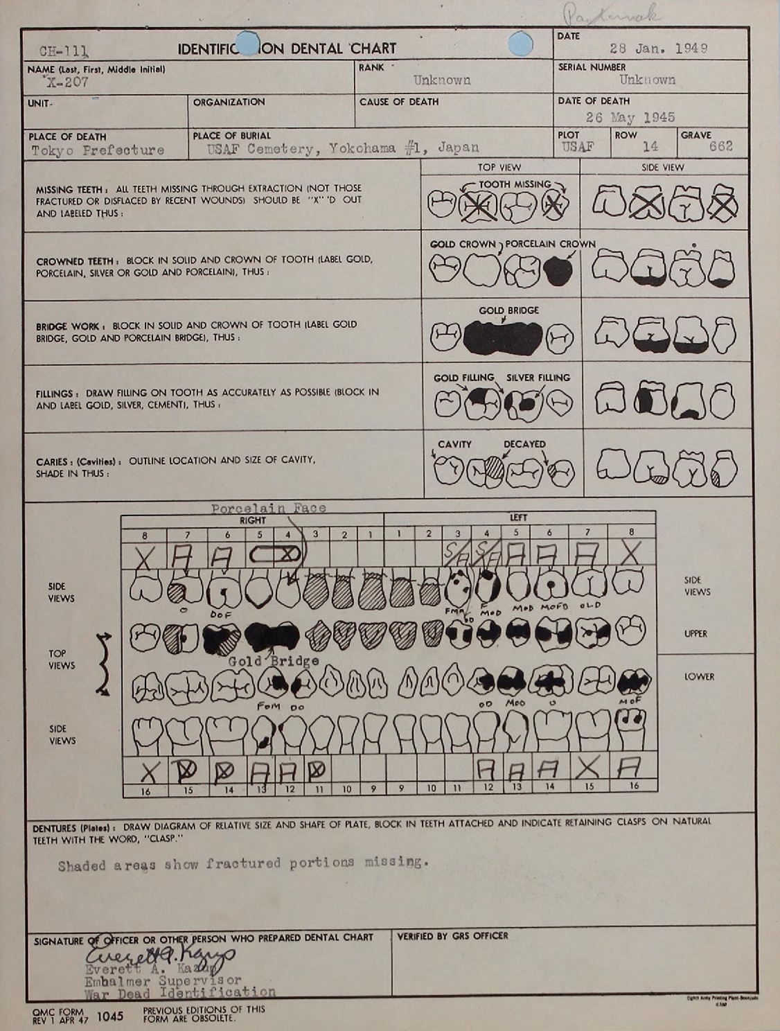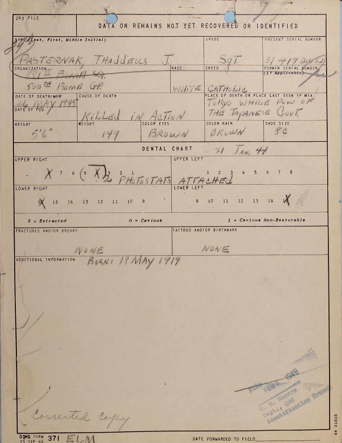 Below are three Corrected Reports of Interment These are followed by the Dental Chart used for Identification, a
