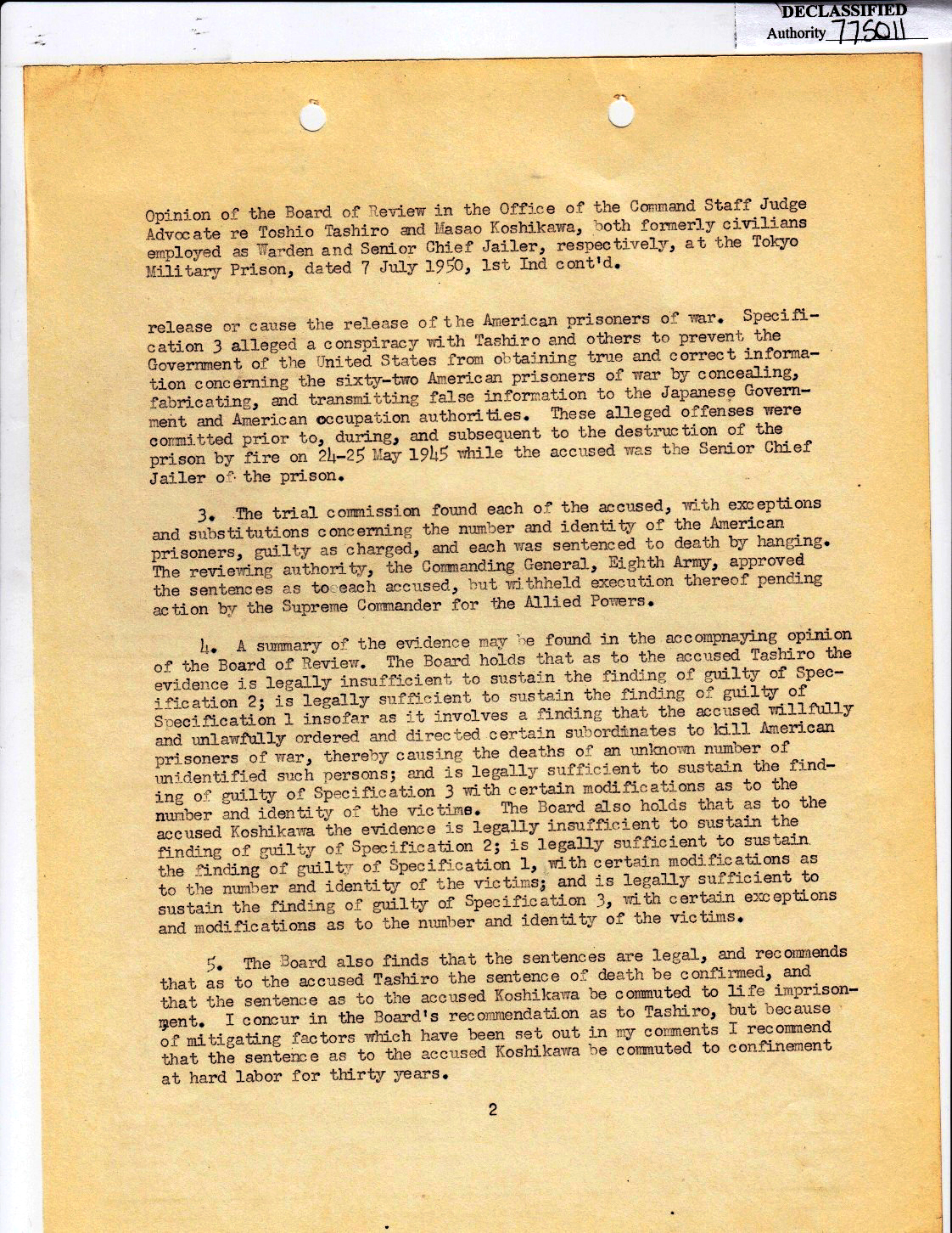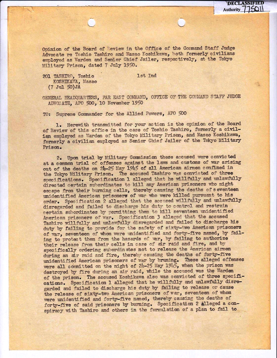 Final approval or disapproval of the Board's Opinion was made by the SUPREME COMMANDER FOR THE ALLIED POWERS. These three pages are followed by part of the document titled Opinion of the Board of Review in the Office of the Command Staff Judge Advocate |