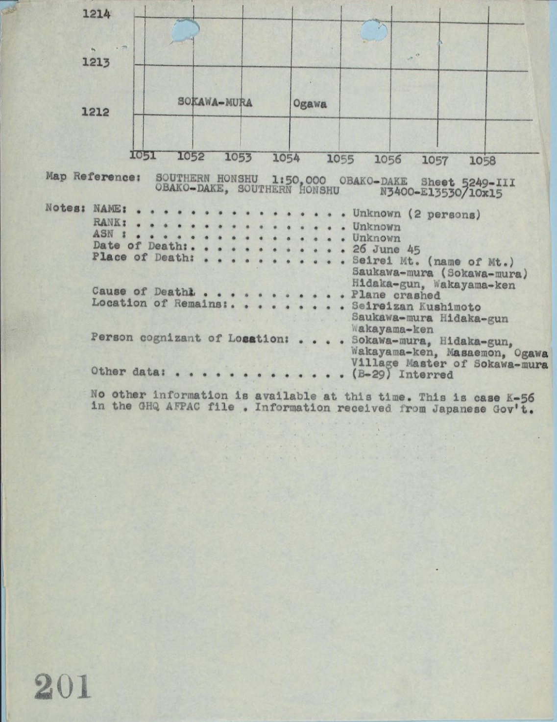One is a map of the crash location. Case History 201 concerns the two crew members who died in the crash: Capt James F Newell SSgt John S Combs |