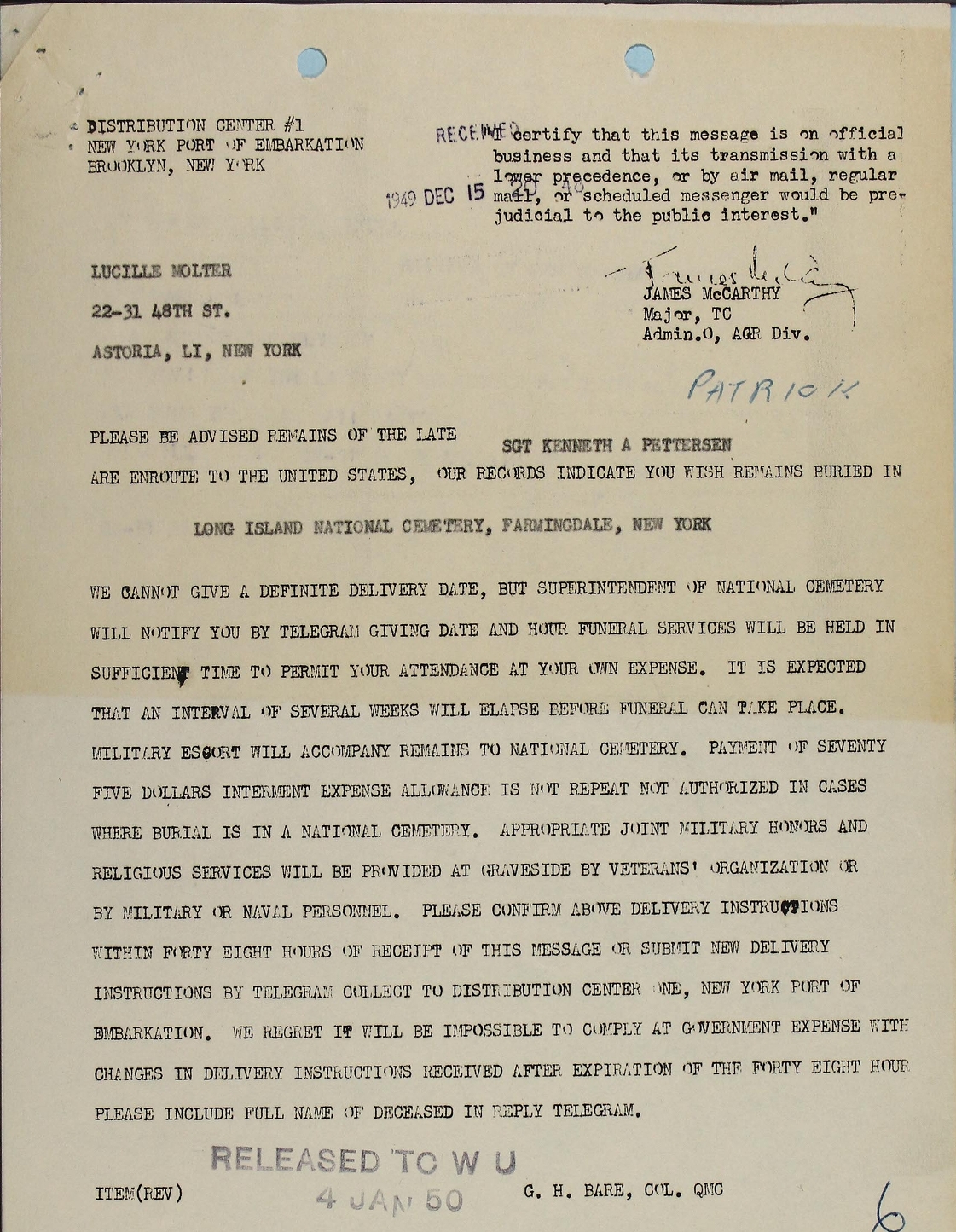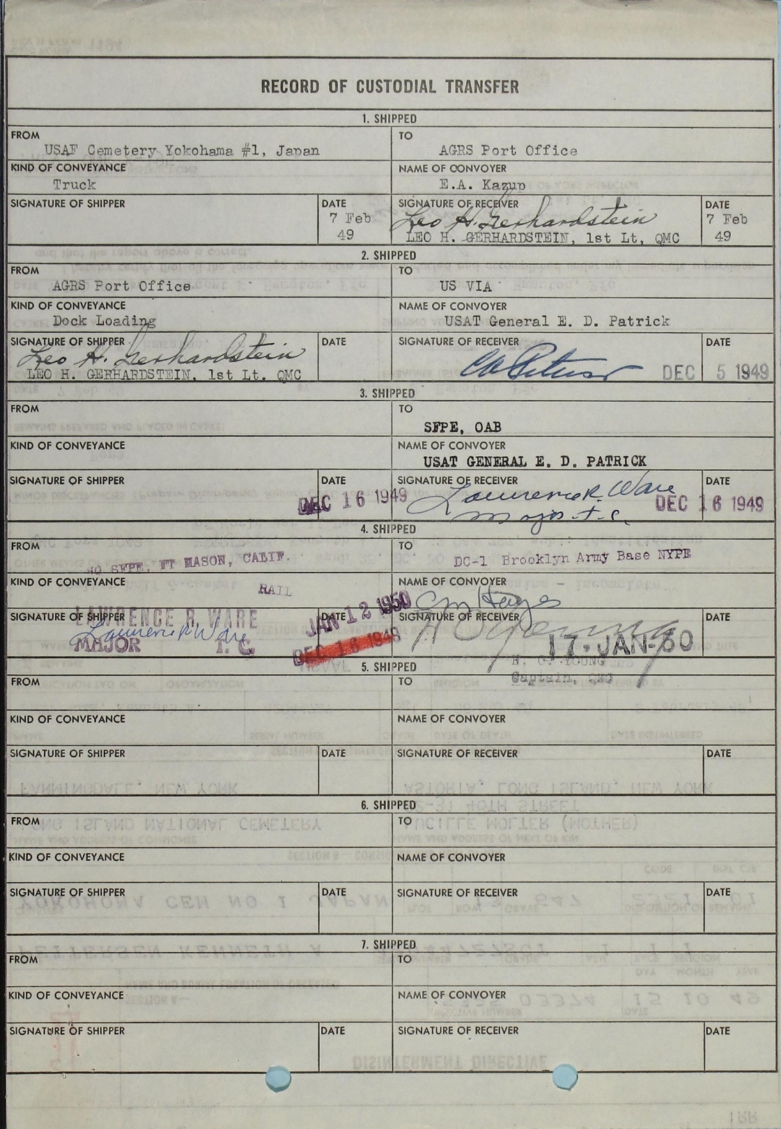 On 5 December 1949 his remains were placed on board the USAT Patrick