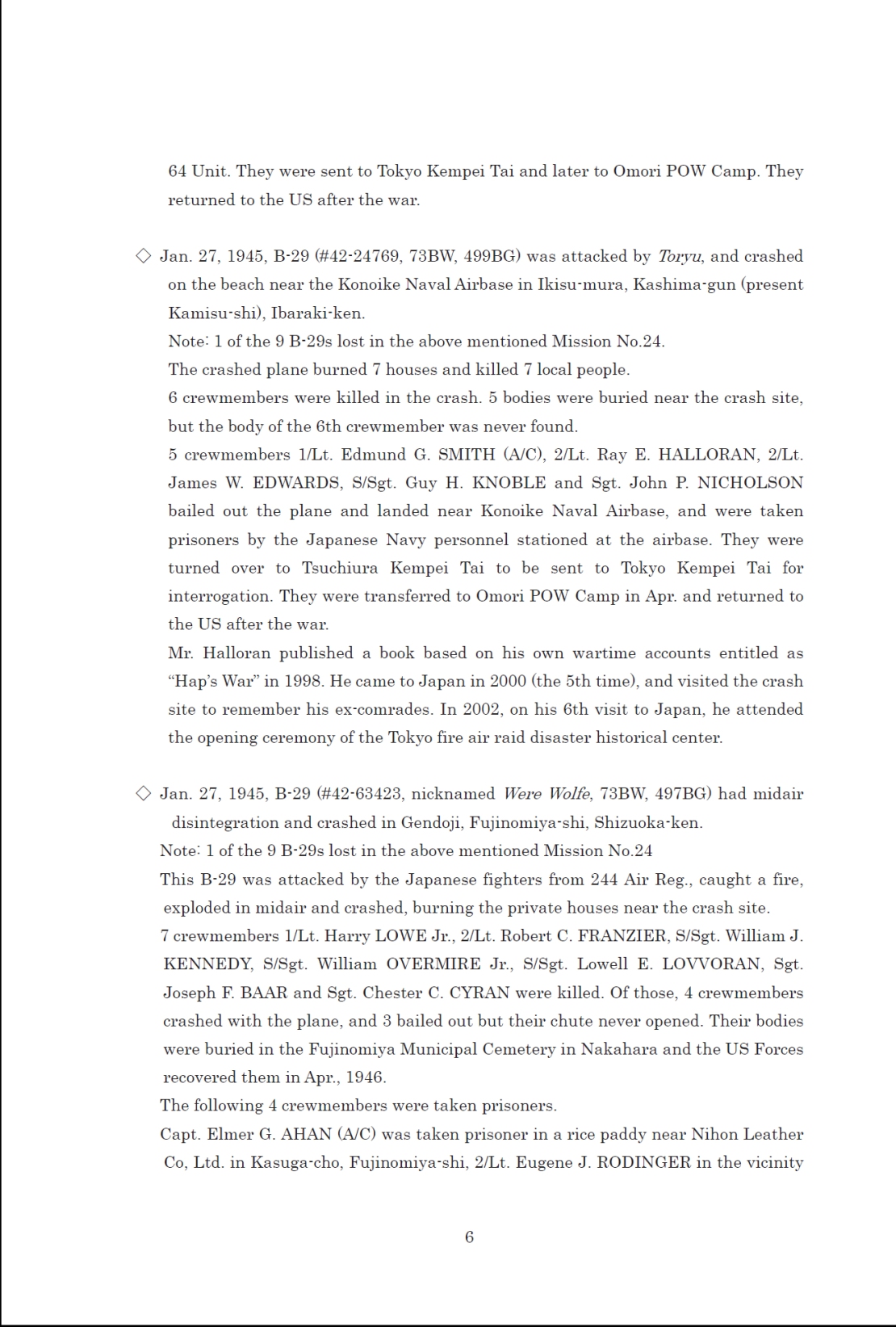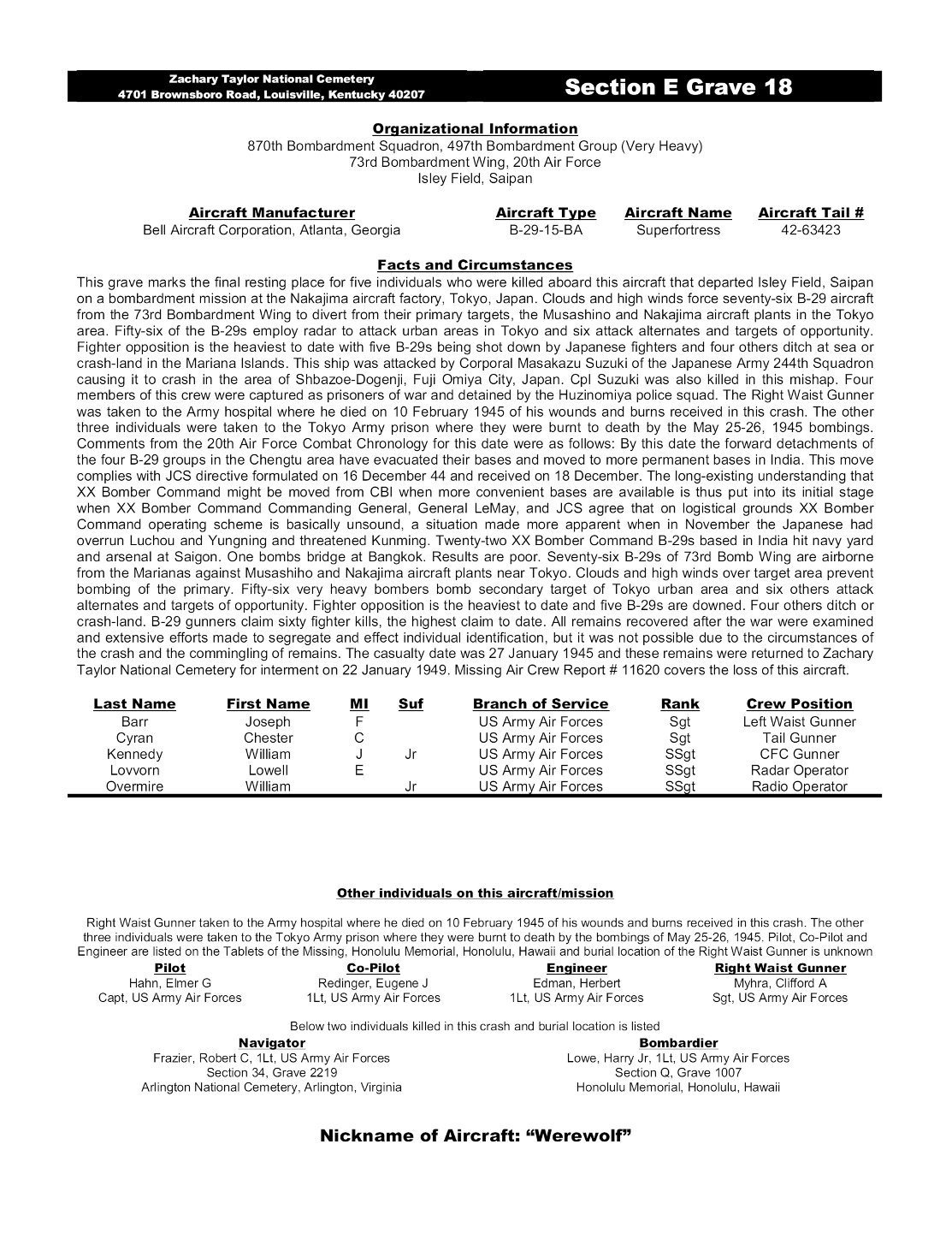 Capt Hahn's B-29 was attacked and crashed