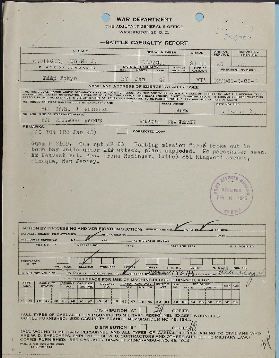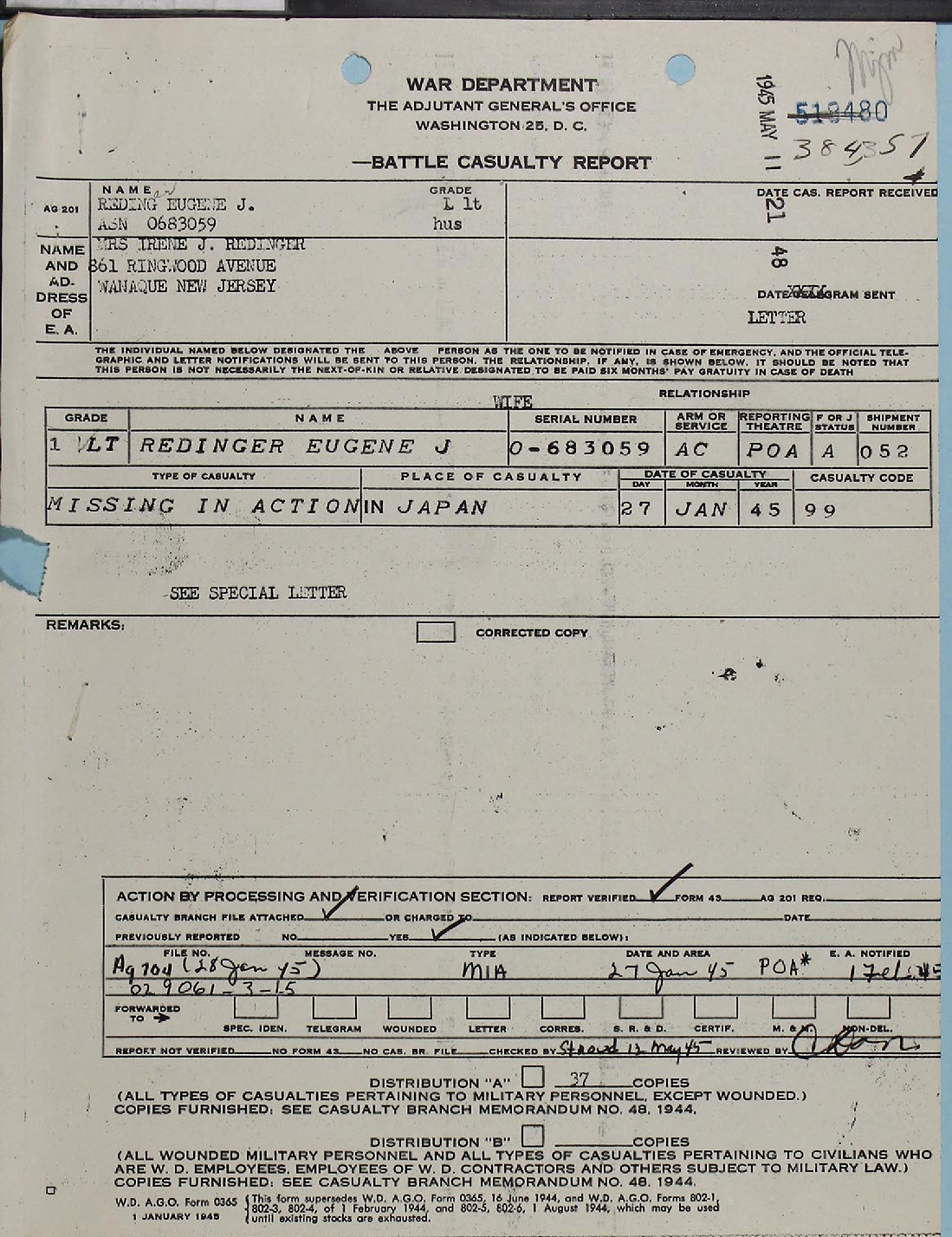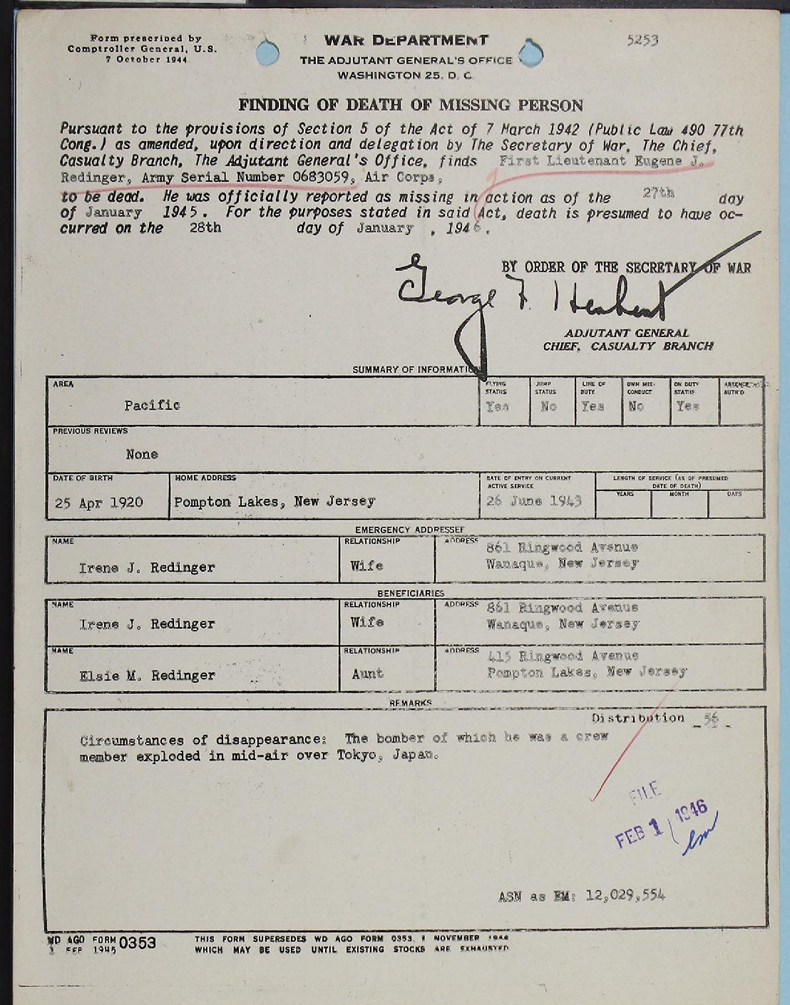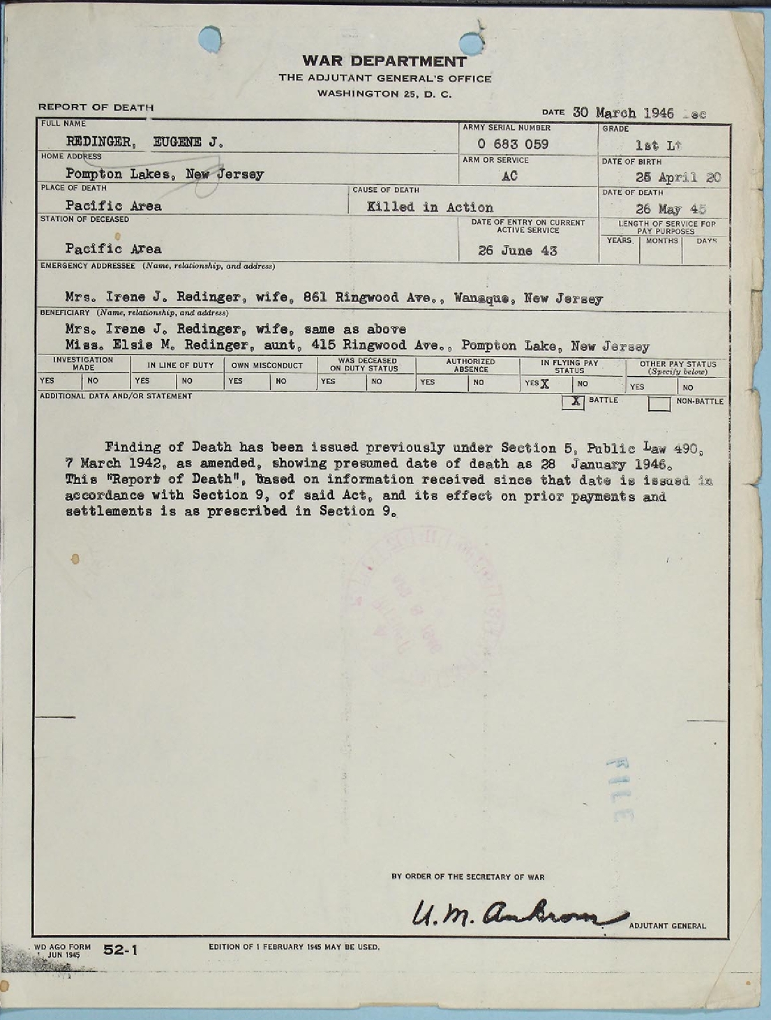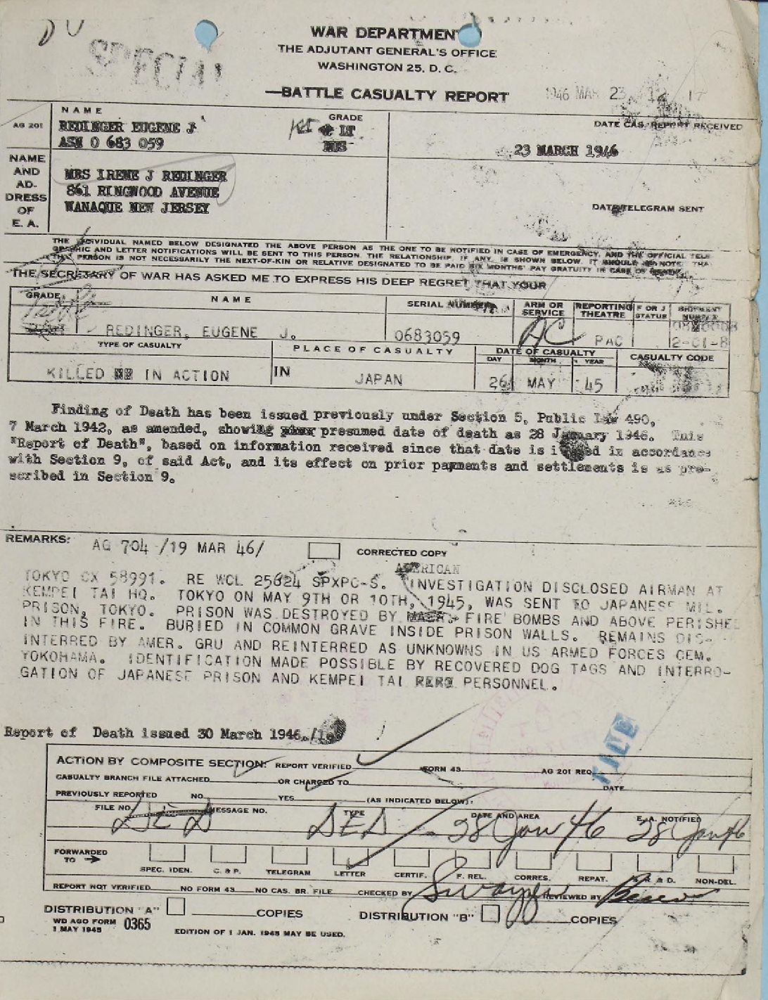 Lt Redinger's Report of Death was issued at the end of March 1946.