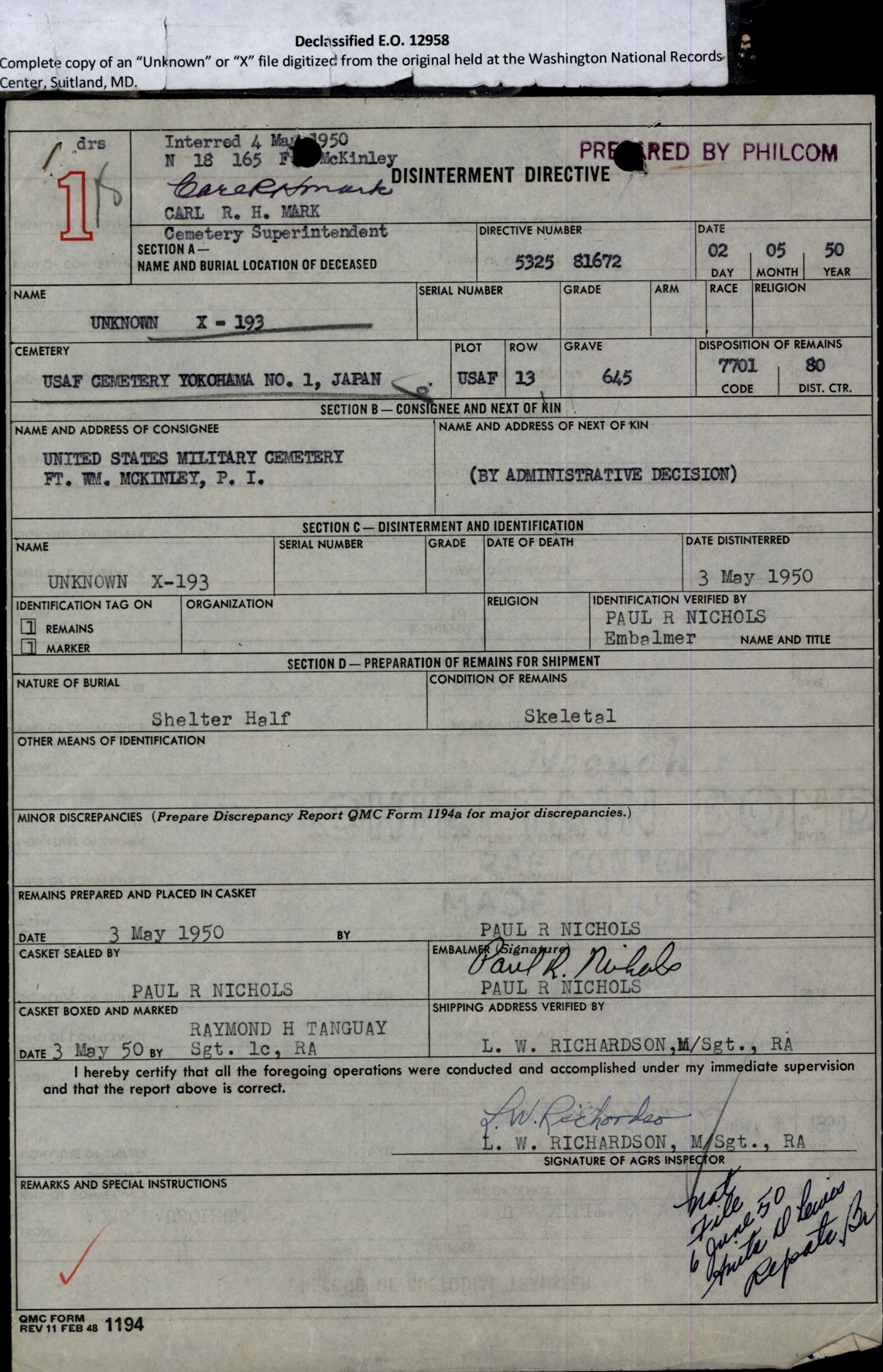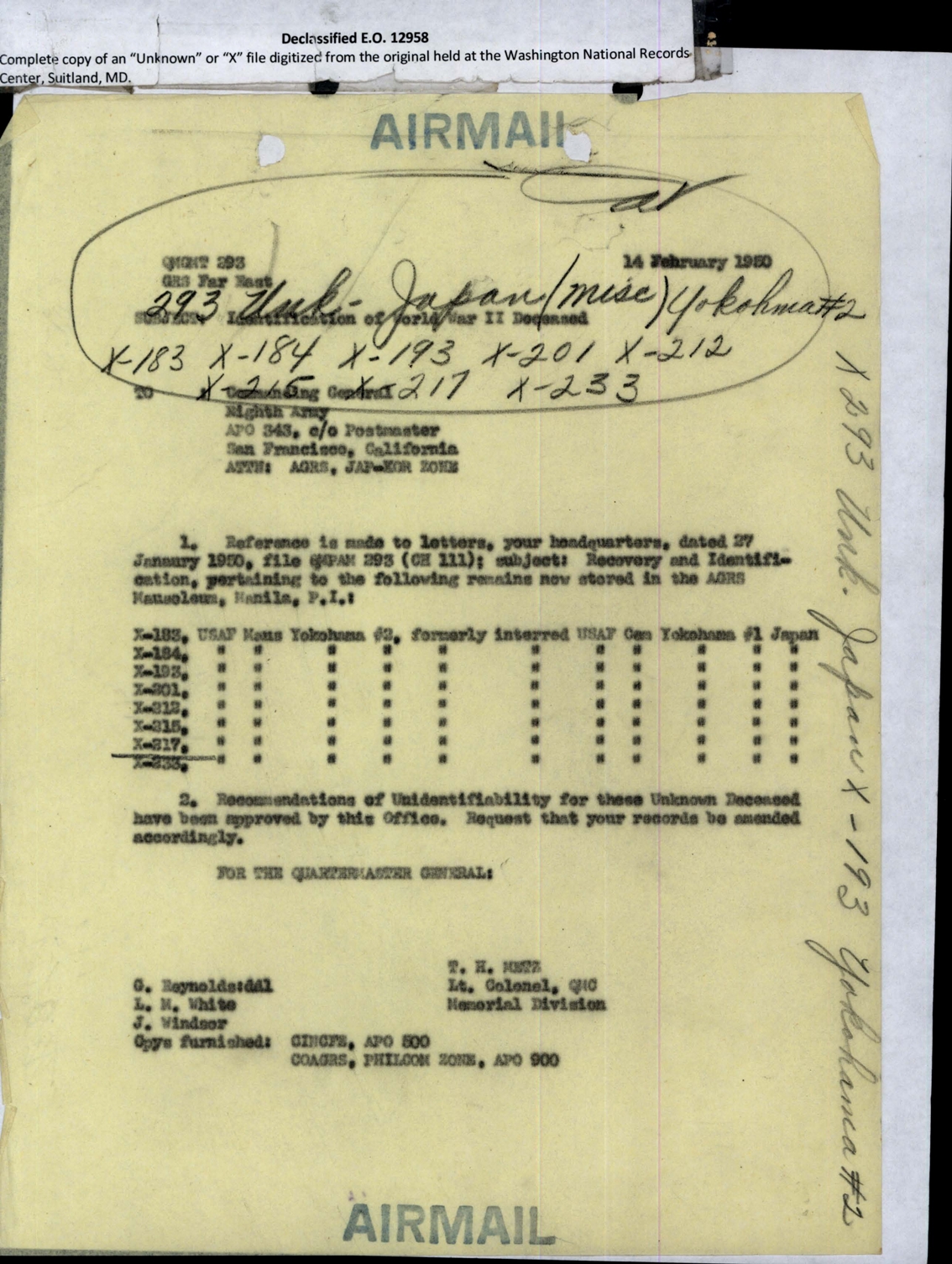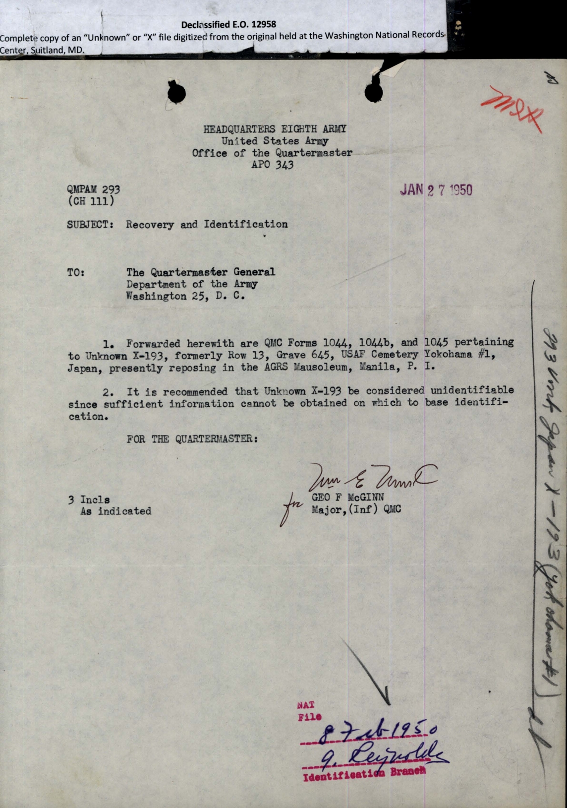 RECORD OF CUSTODIAL TRANSFER TO :U S MILITARY CEMETERY |