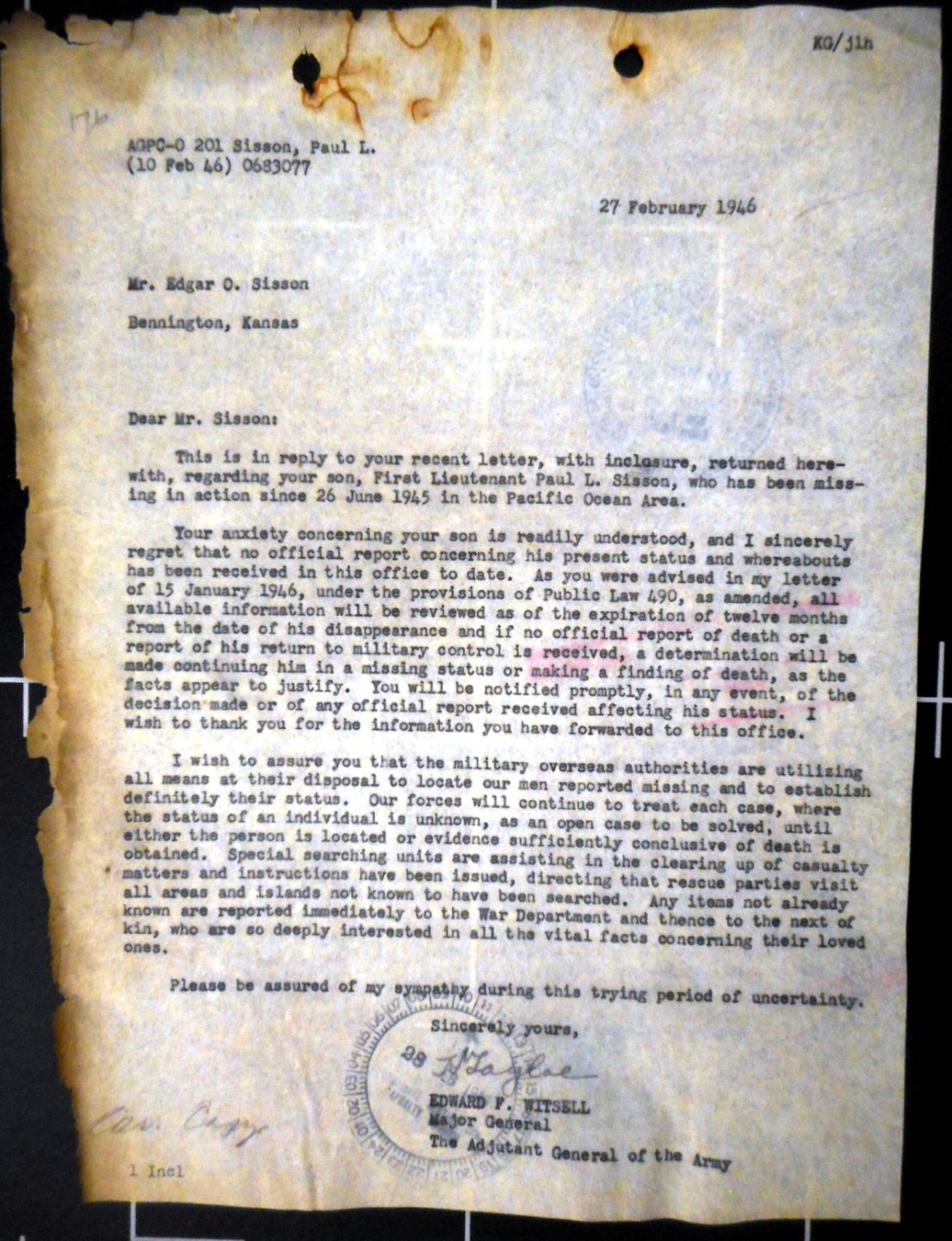27 FEBRUARY 1946 TO MR SISSON FROM MAJOR GENERAL EDWARD F WITSELL