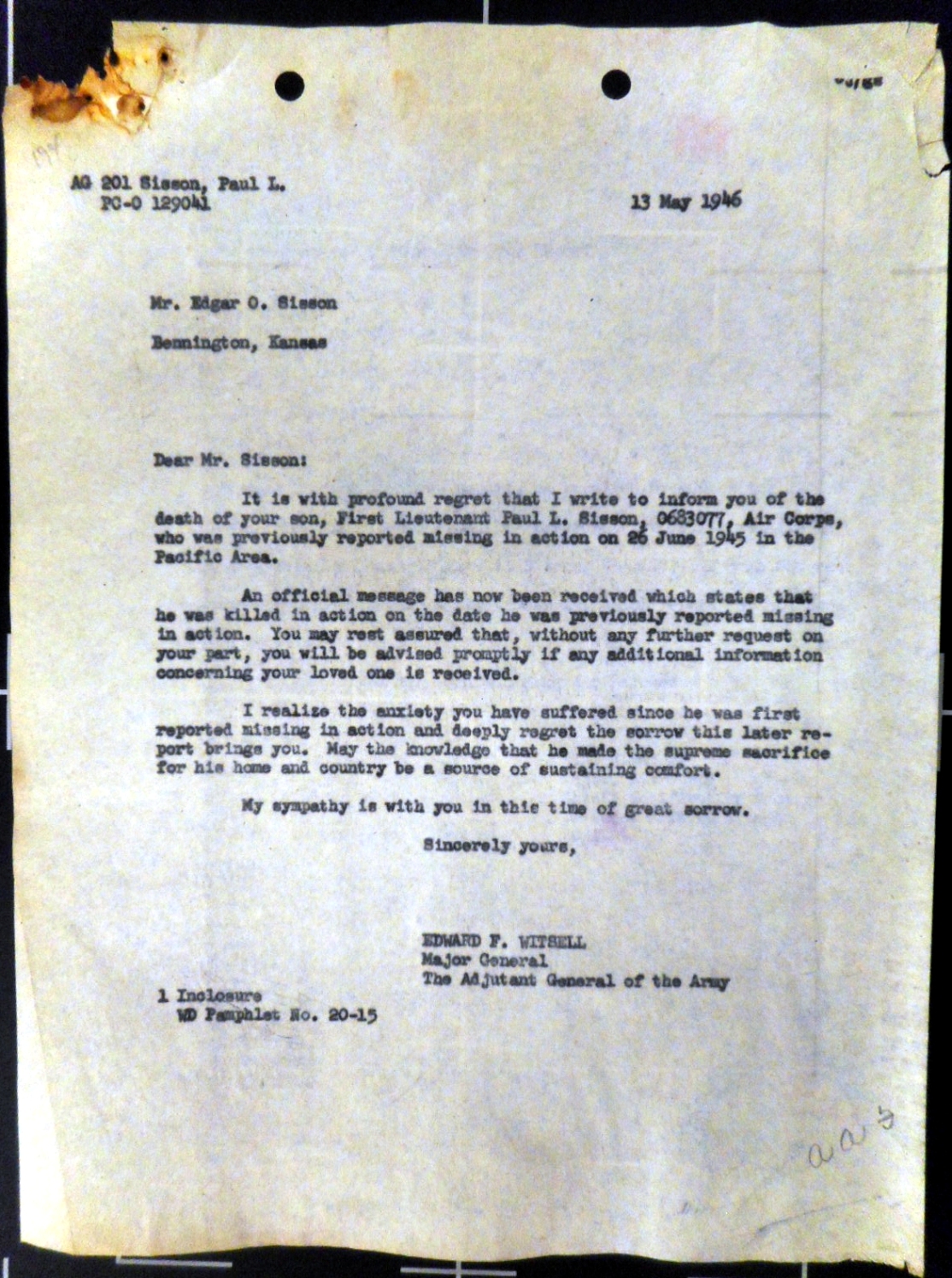 The below letters are from 1946. In the first one, General Witsell informed Mr Sisson that his son's status was unknown. Three months later, in May 1946, Mr Sisson was notified that his son was killed in action on the date of the crash, 26 June 1945.