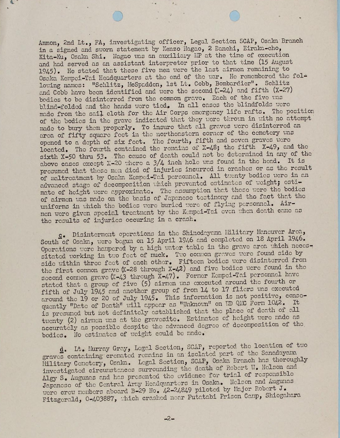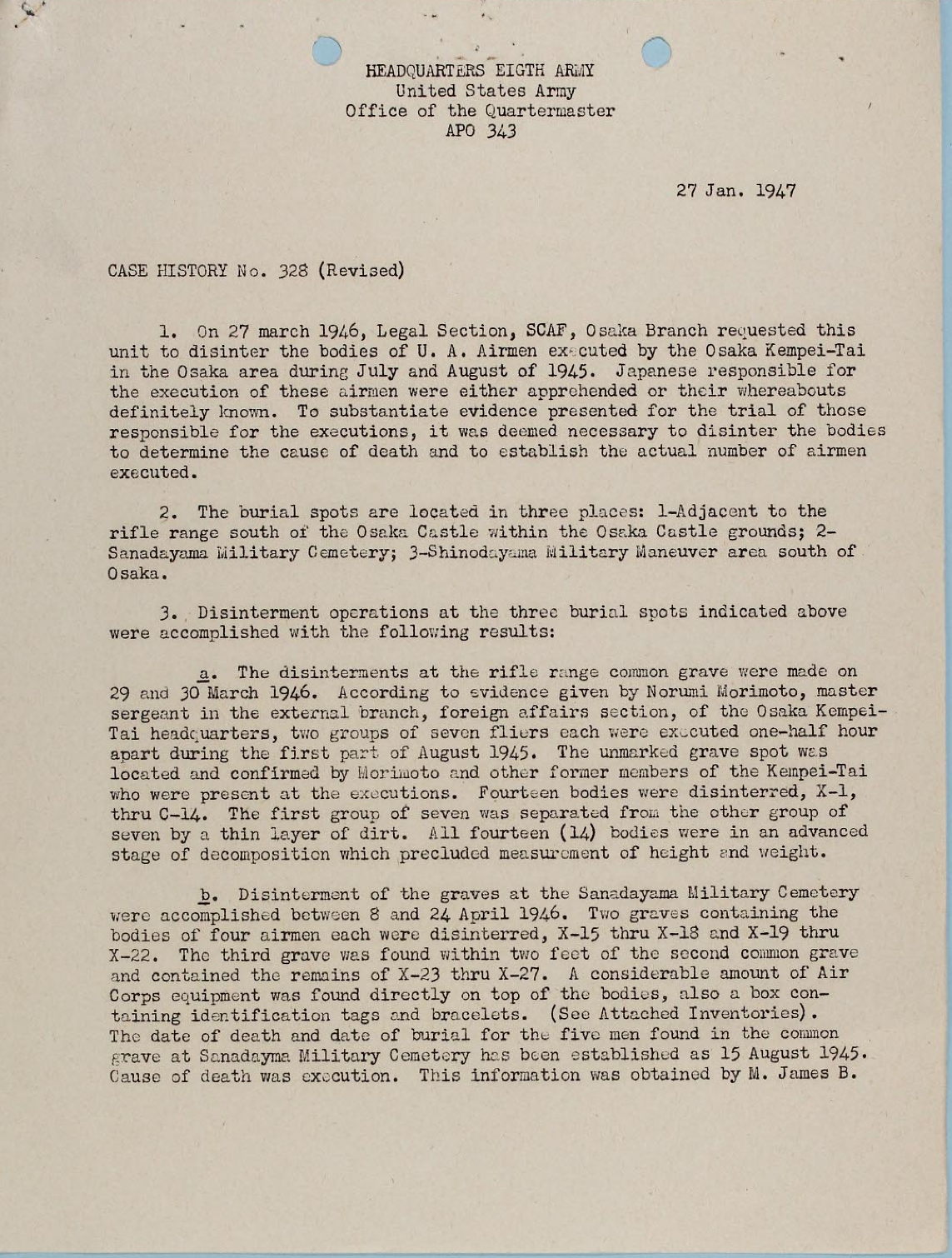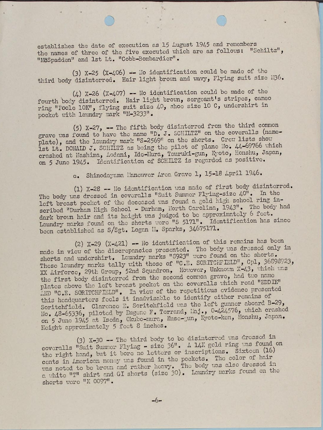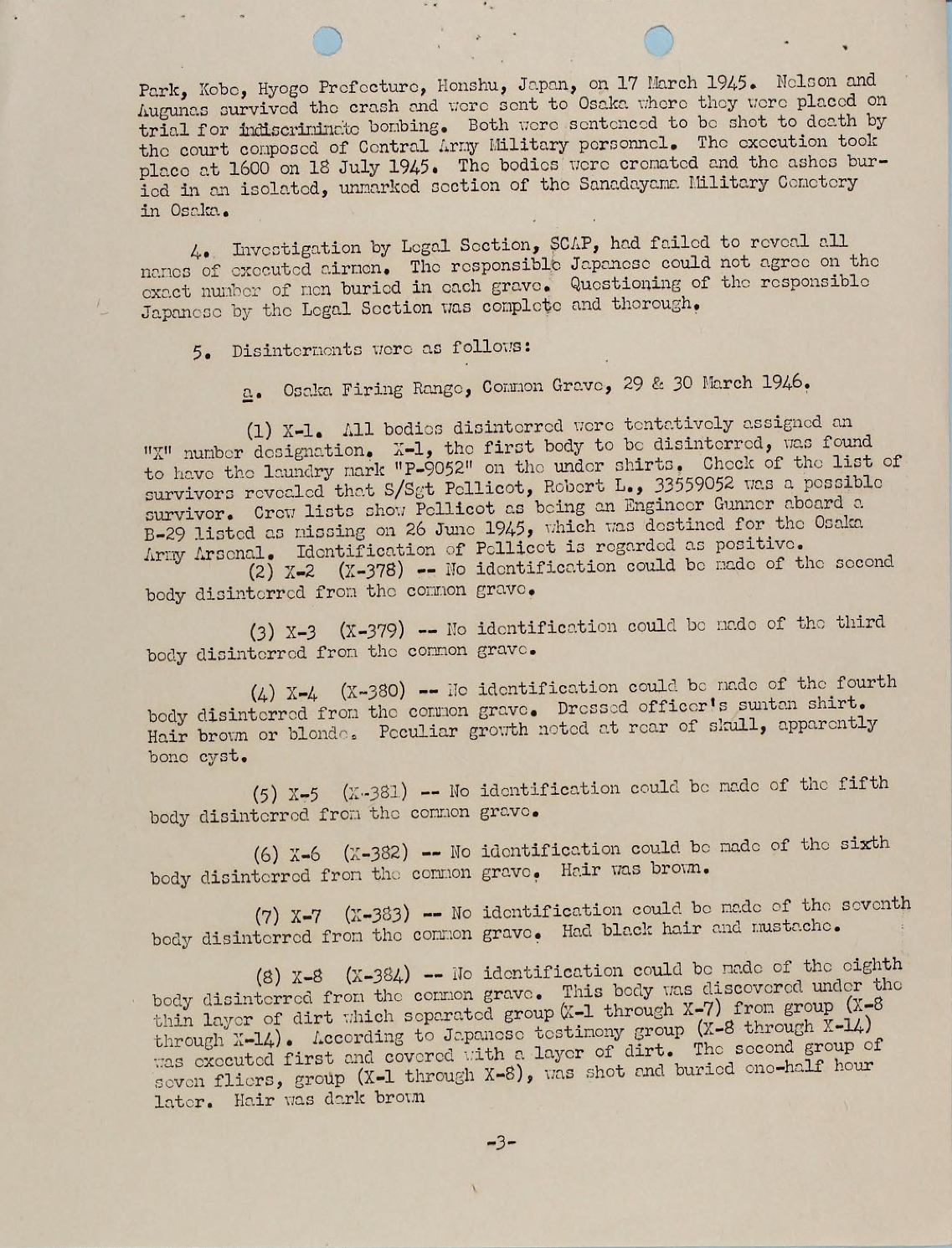 Details begin in page 3 and jump to page 6 where Unknown X-28 ( Sgt Sparks ) appears. You will notice that some of the recovered remains have one Unknown X number while others have two. Those identified in the field at Osaka have a single number. Those not identified were transfered to USAF Cemetery Yokohama #1 and have two. |