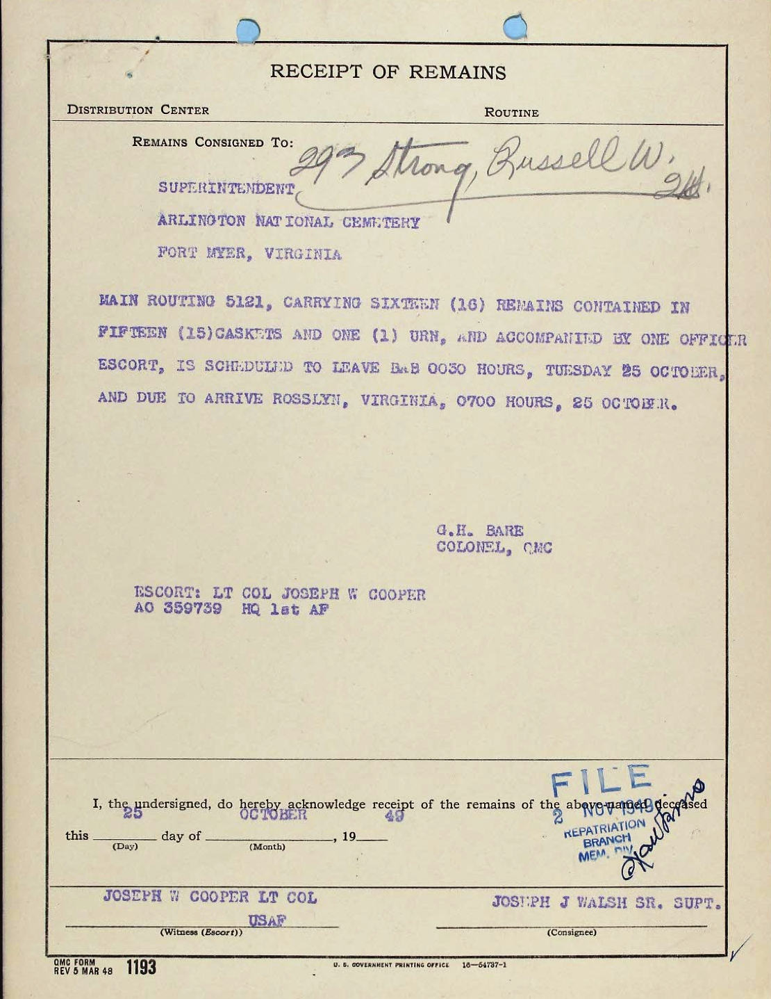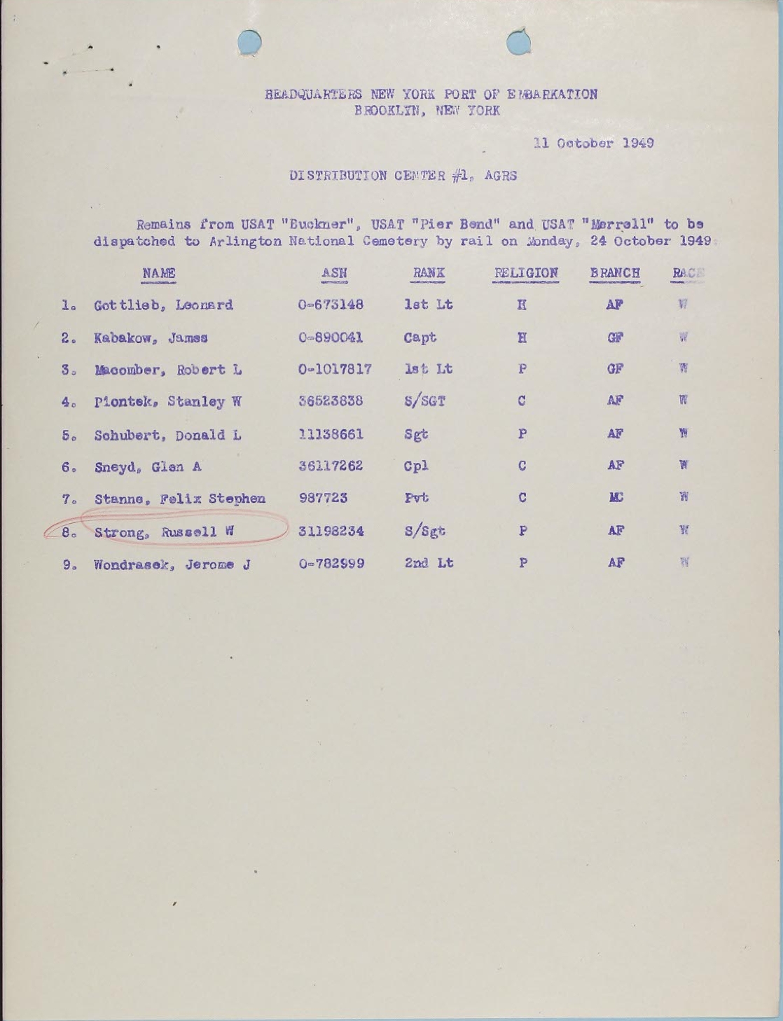 The photo of SSgt Russell W Strong's Grave Marker Below this is one of four mimeograph pages from the AGRS at Distribution