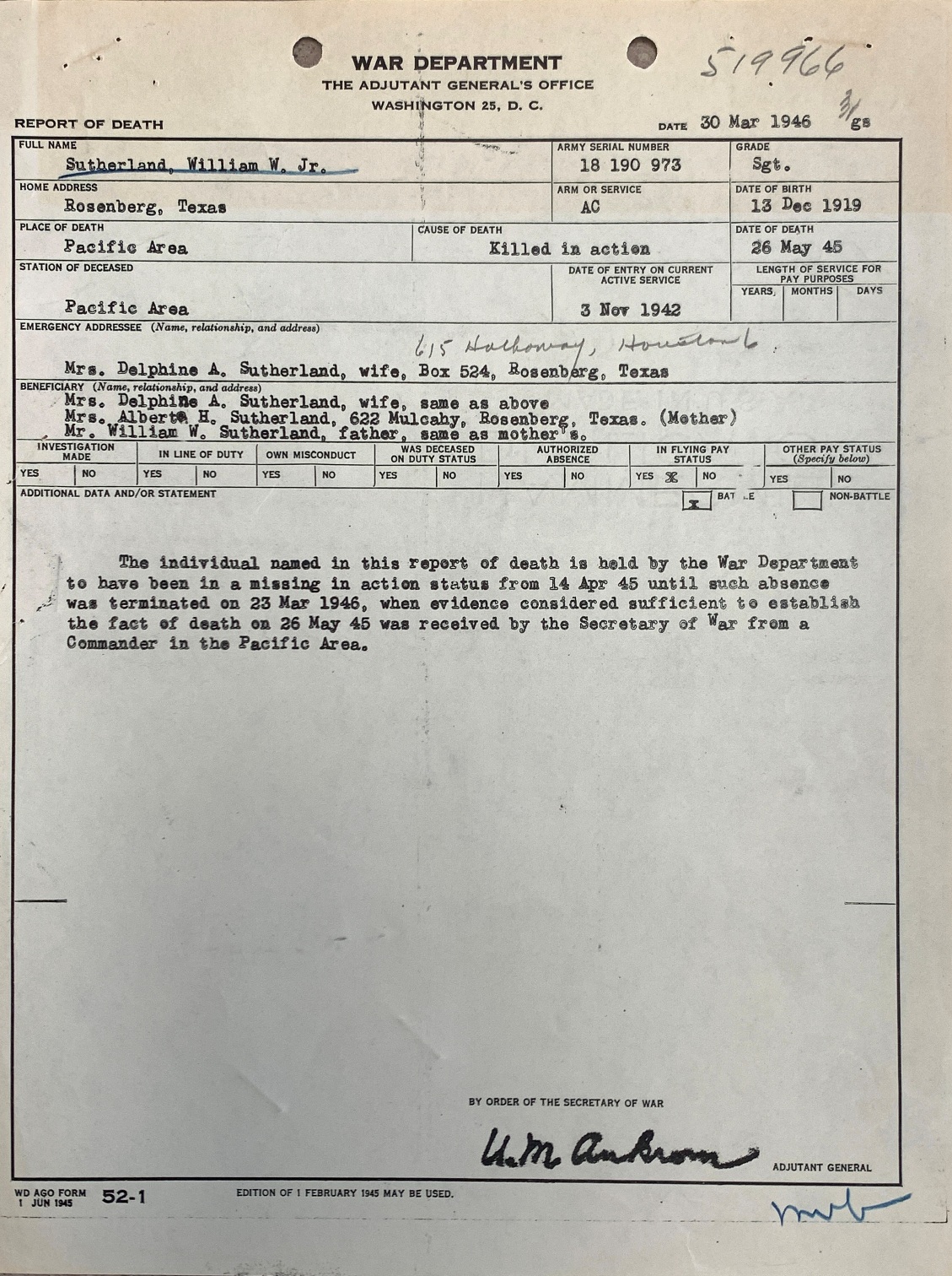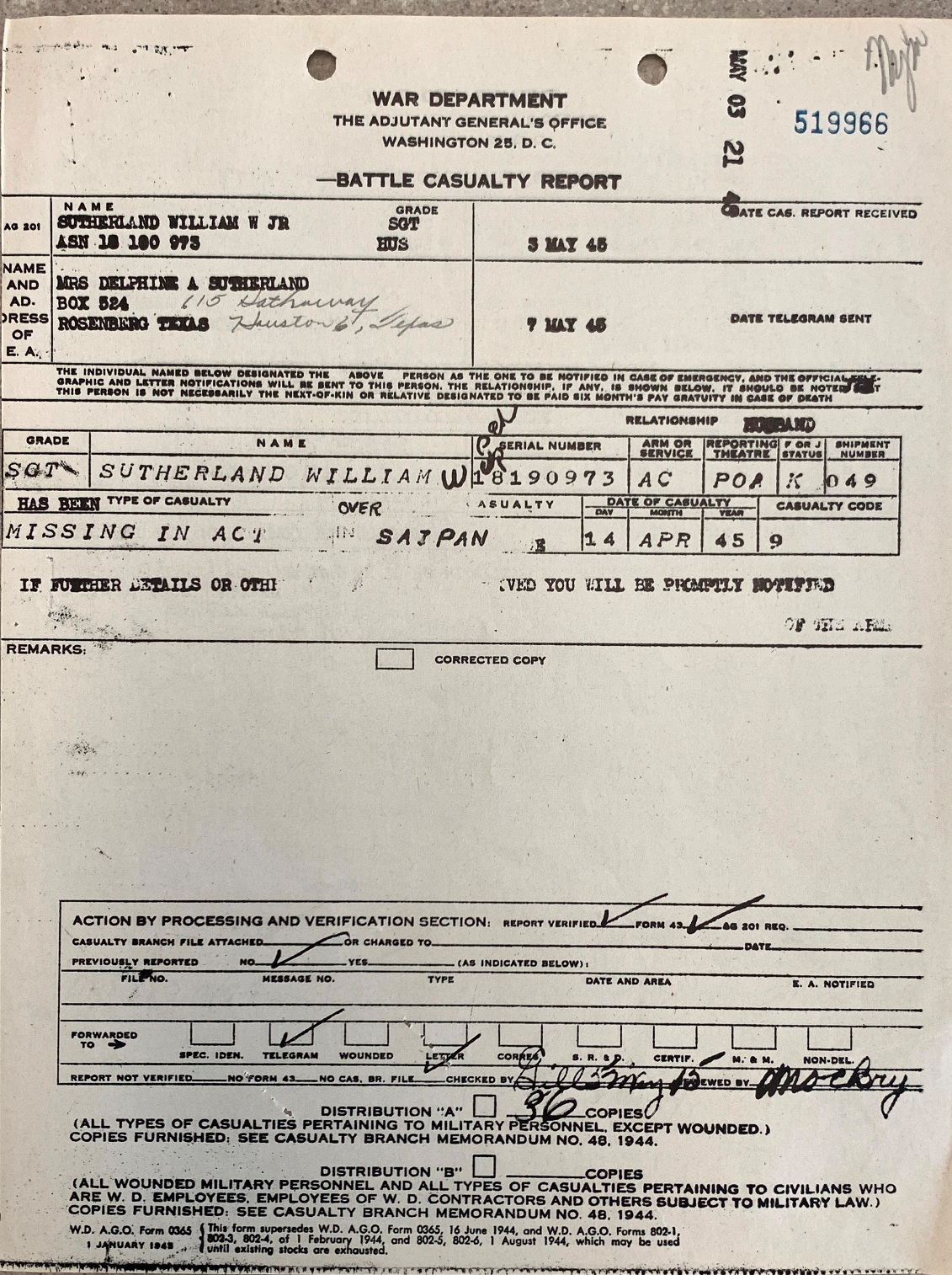 A telegram was sent to Mrs Delphine Sutherland on 7 May 1945.