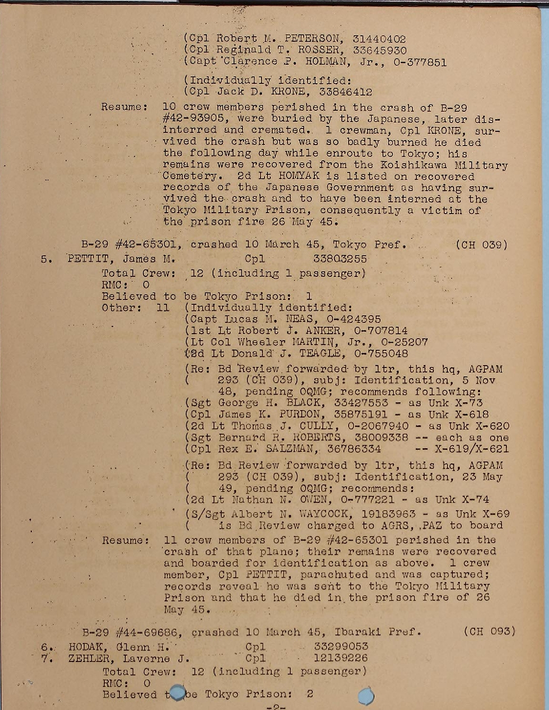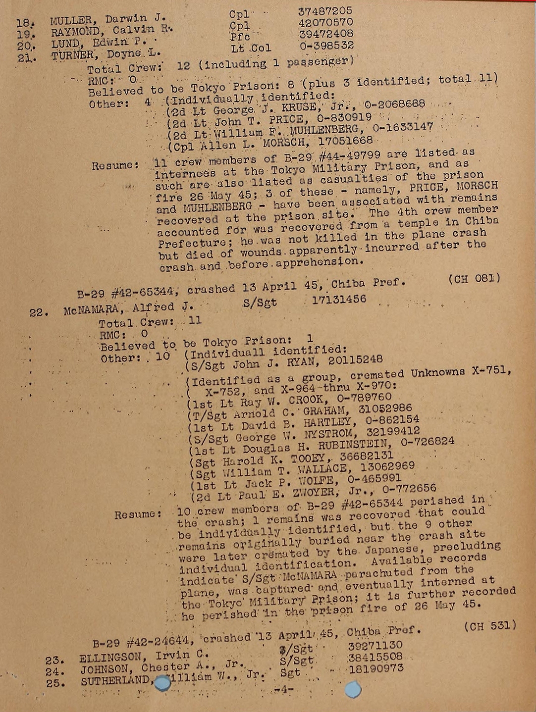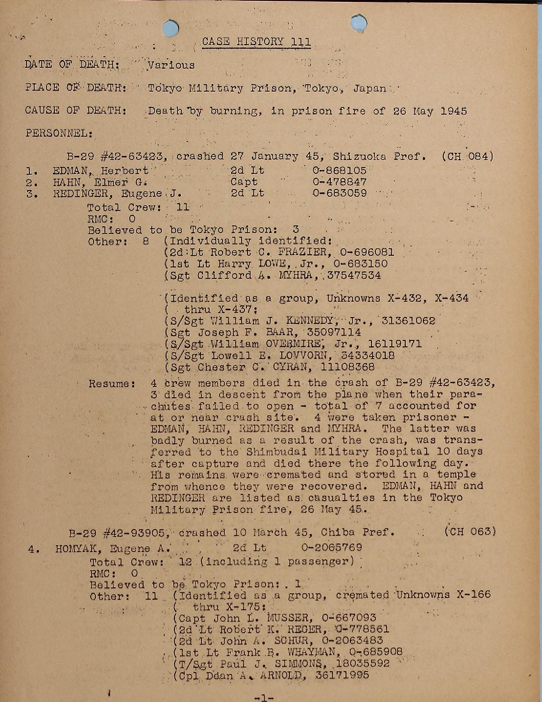 37 POWs whose remains were considered non-recoverable. This list is arranged by the date of crash and is followed by the B-29 Serial Number and the names of crew members who are in The 37. Also there is a summary of the other crew members and a brief resume of the crew. Pages 1-4 are below and Pages 5-9 are in Page 3. The Law Crew is below in Page 3, numbers 8-13. Lt Van Dever is #8. Sgt Ray Hopper's status was RMC ( Returned to Military Control ) following conclusion of hostilities. Suggested reading is in Sgt Ray Hopper's section |