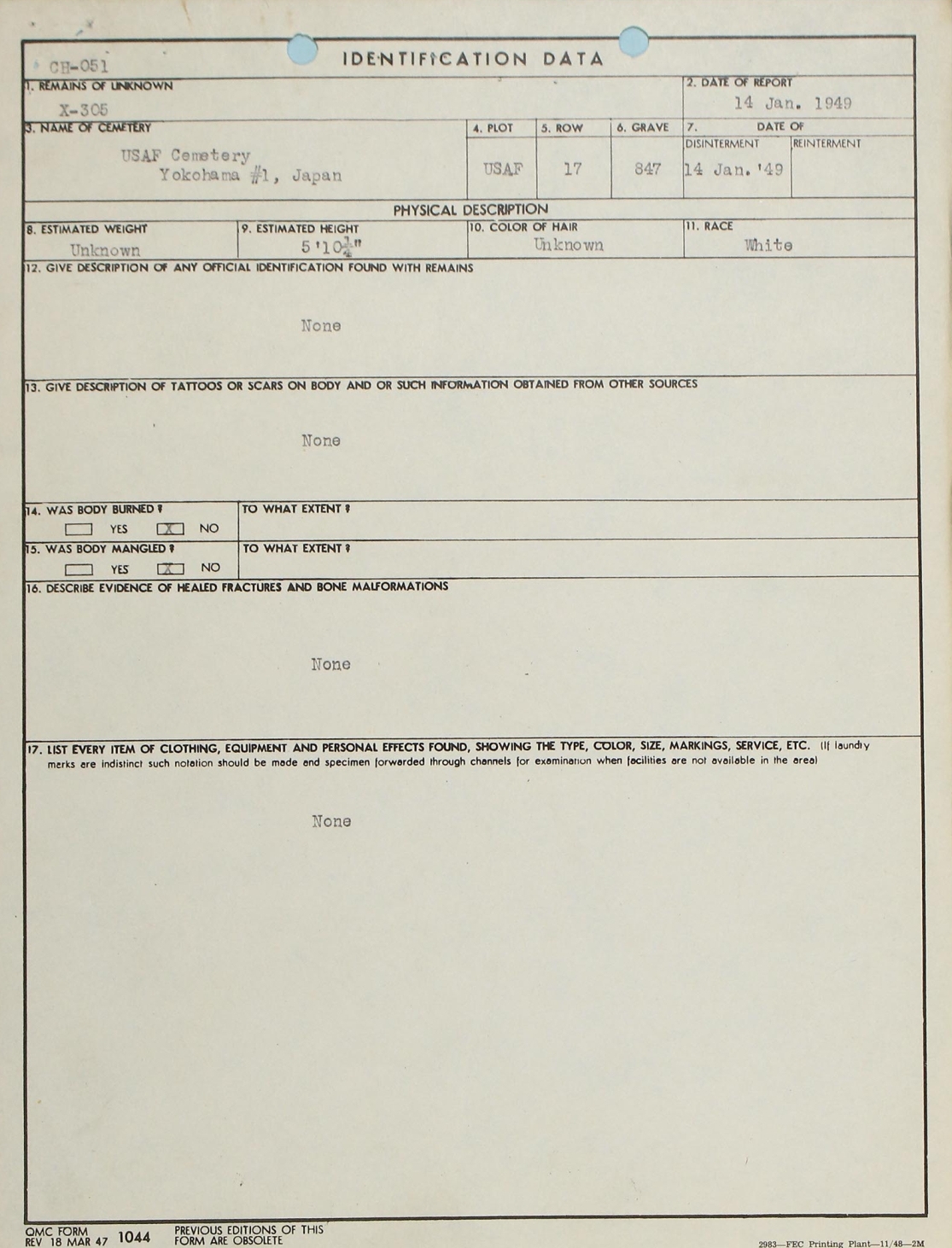 In January 1949 more formal work to identify Sgt Walk's remains was undertaken. The first document is Identification Data 14 Jan 1949 follwed by the Identification Dental Chart.