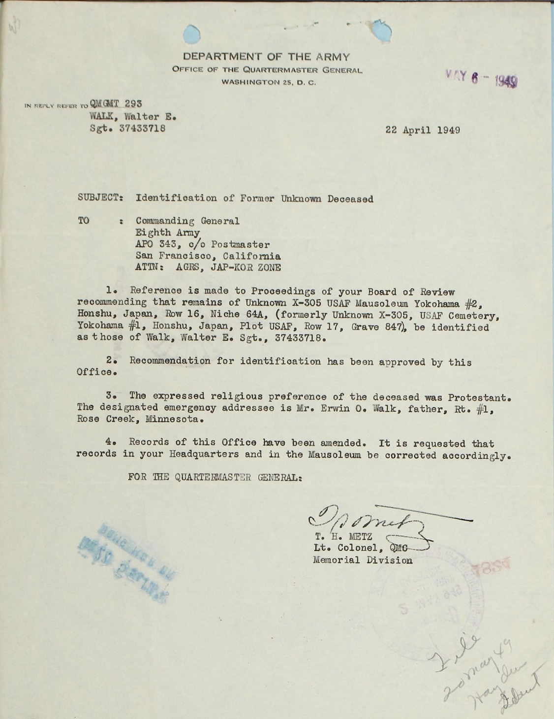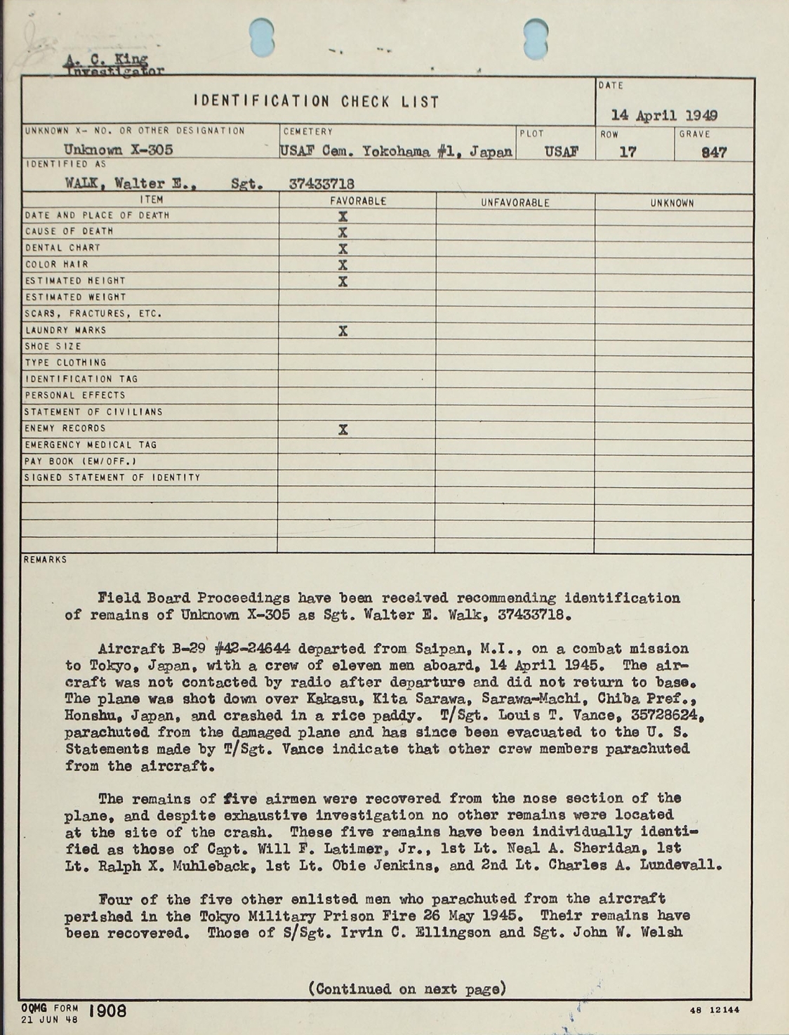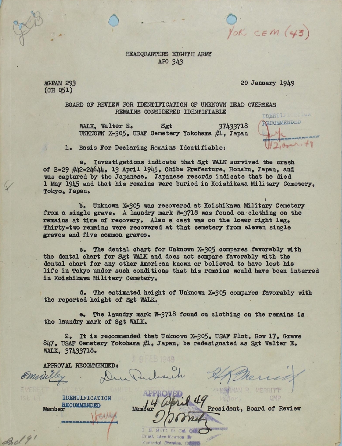 The below pages are the initial steps taken to On 20 Jan 1949 the Board of Review This is followed by two pages of Formal approval of Sgt Walk's identification |