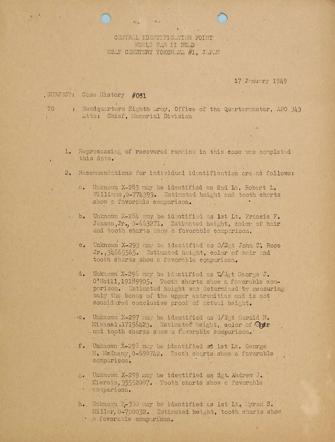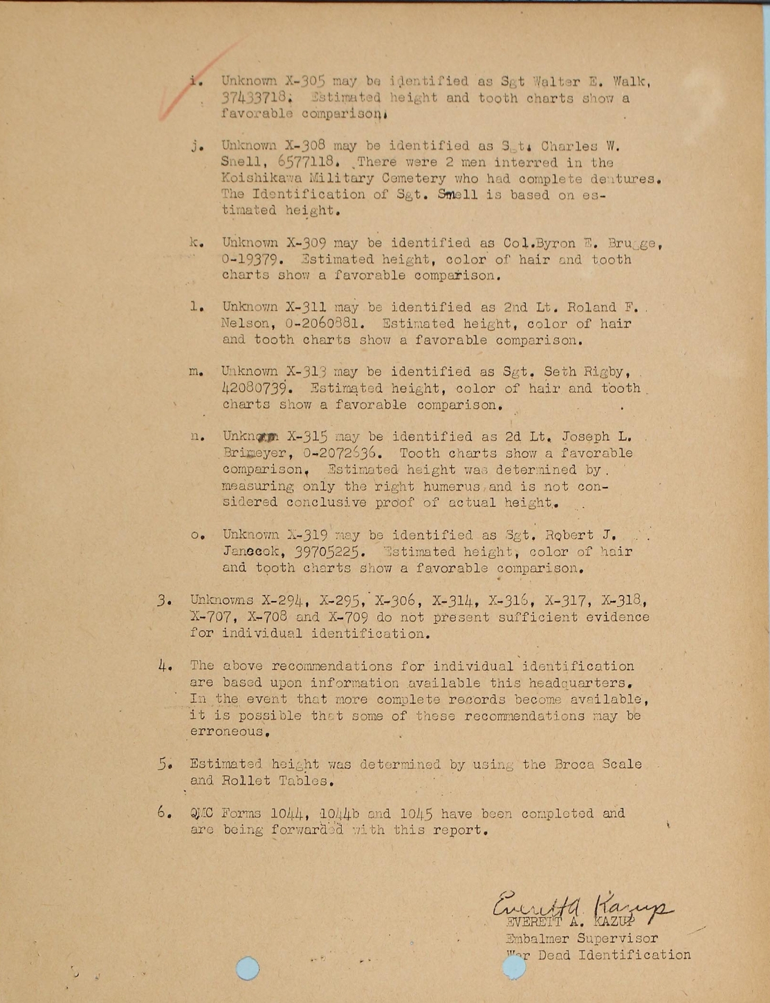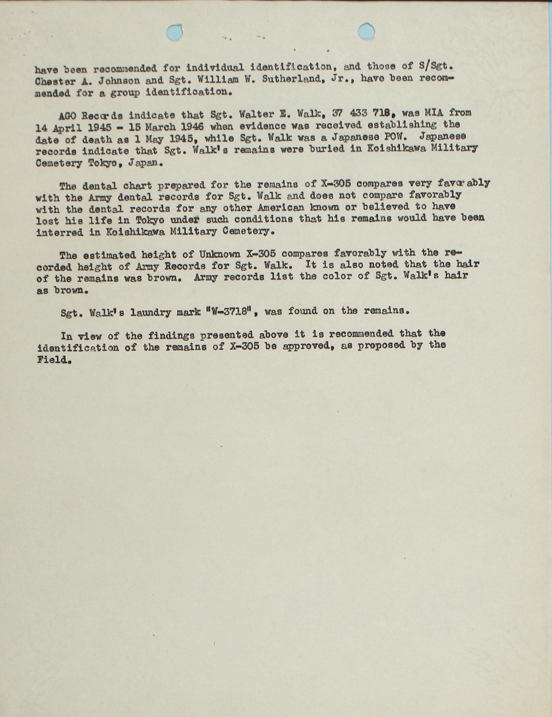 The below pages are the initial steps taken to On 20 Jan 1949 the Board of Review This is followed by two pages of Formal approval of Sgt Walk's identification |