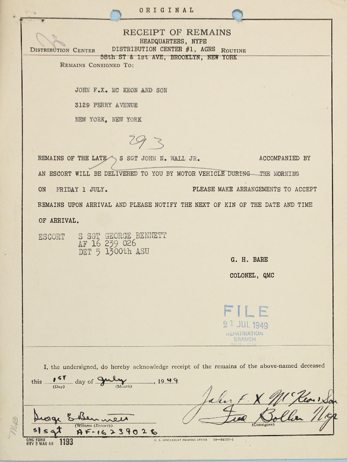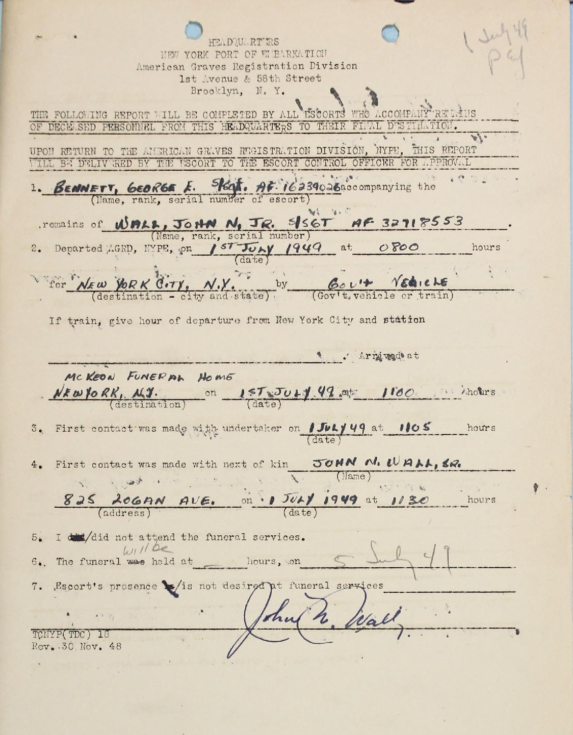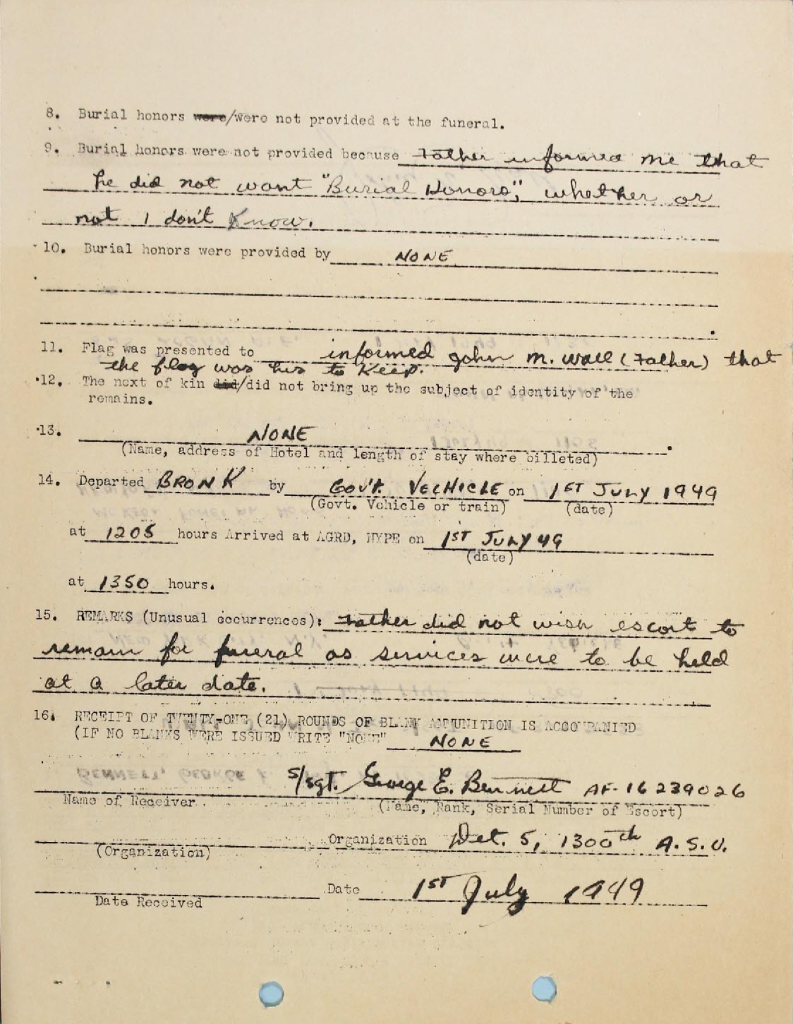 There is no information stating which railroad transported Sgt Wall's burial took place on 5 July 1949 and A two page report was required to be filled out |