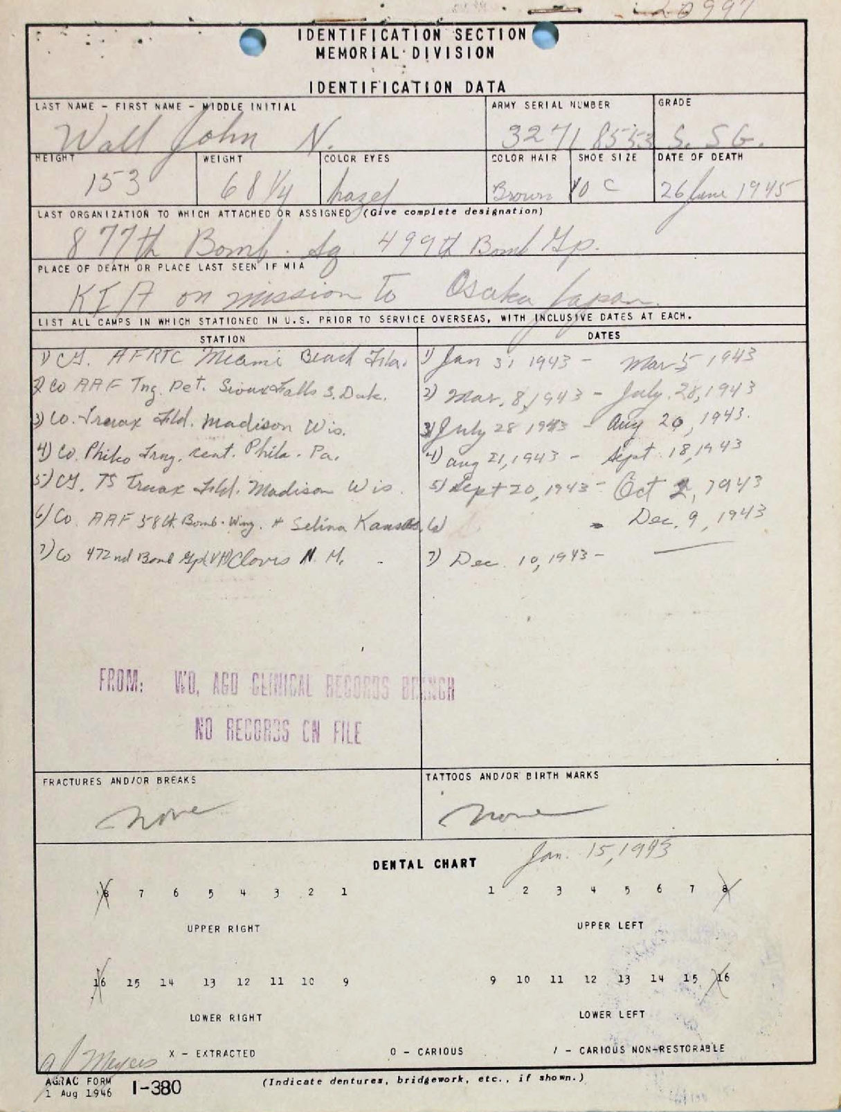 His time line begins with his Registration Card dated 30 June 1942, On 7 January 1943 Sgt Wall married Marion Dittman. Below is a partial list of his stations. Radio schools at Sioux Falls and Truax were followed by one month