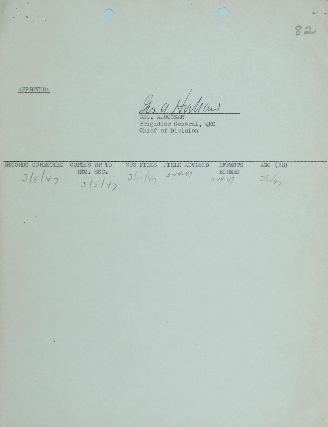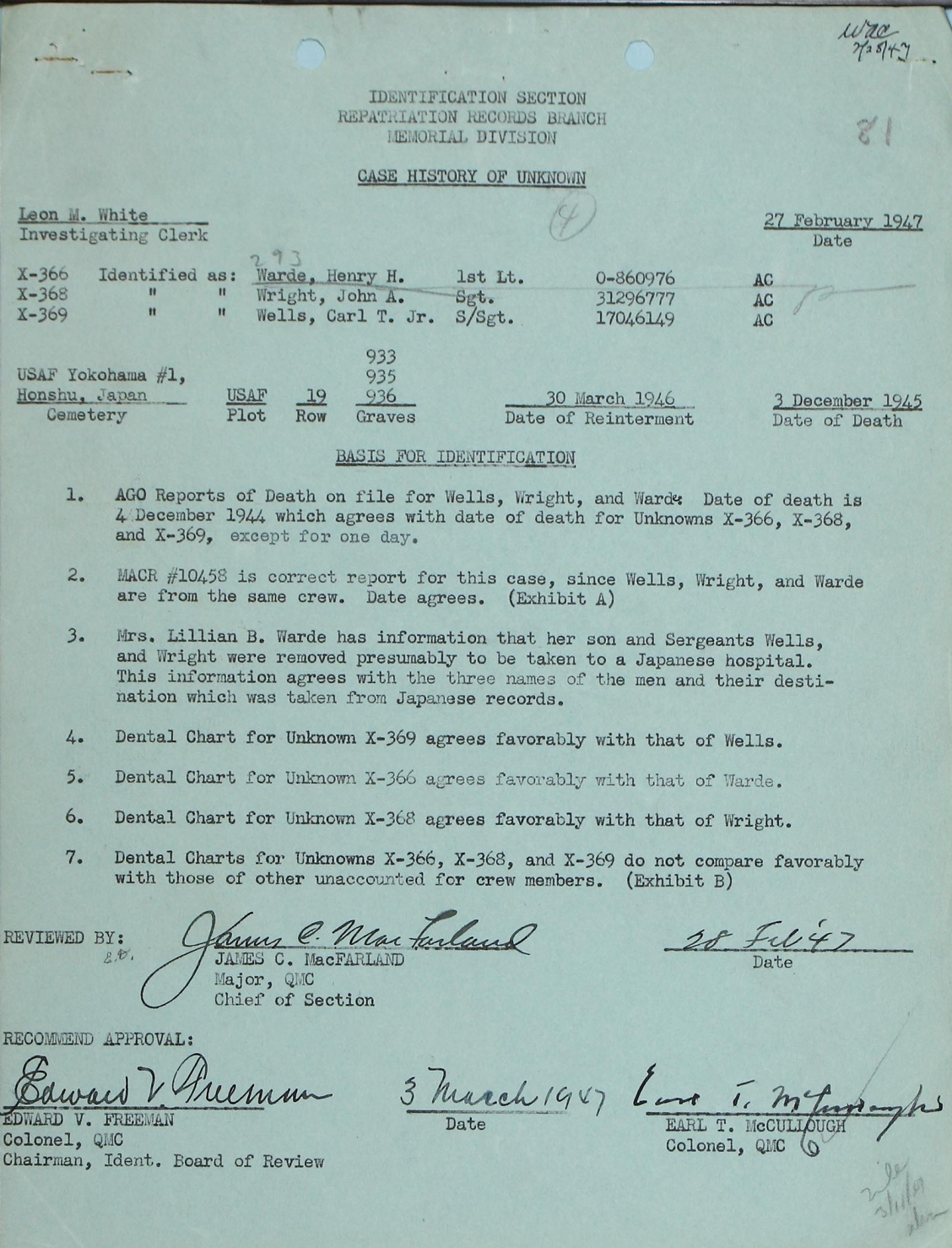 The first document was written by Leon M White, Investigating Clerk. Handwritten dates indicate that this recommendation Following this document is a letter from the At the bottom of the page is one version of the |
