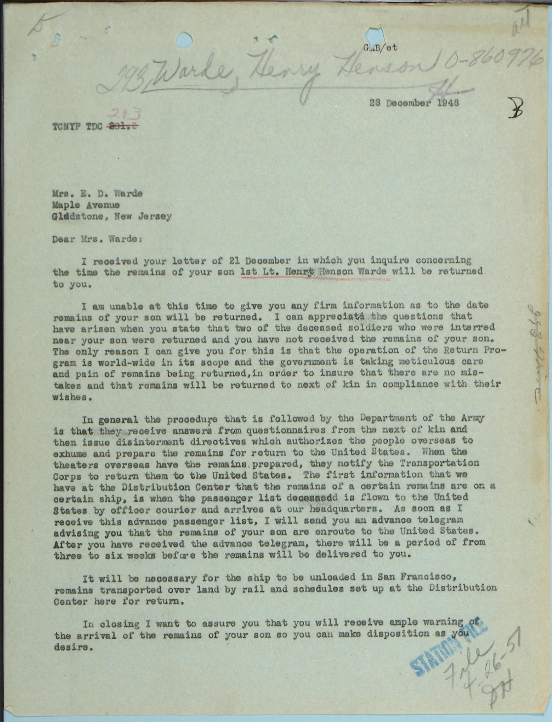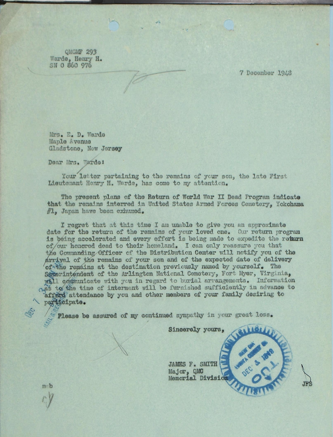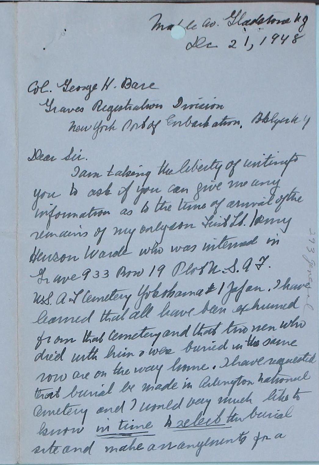 In a letter from Major Smith dated 7 December 1948, This is followed by a 21 December 1948 letter to Col Bare The reply from Col Bare was that he was unable to provide any information. |