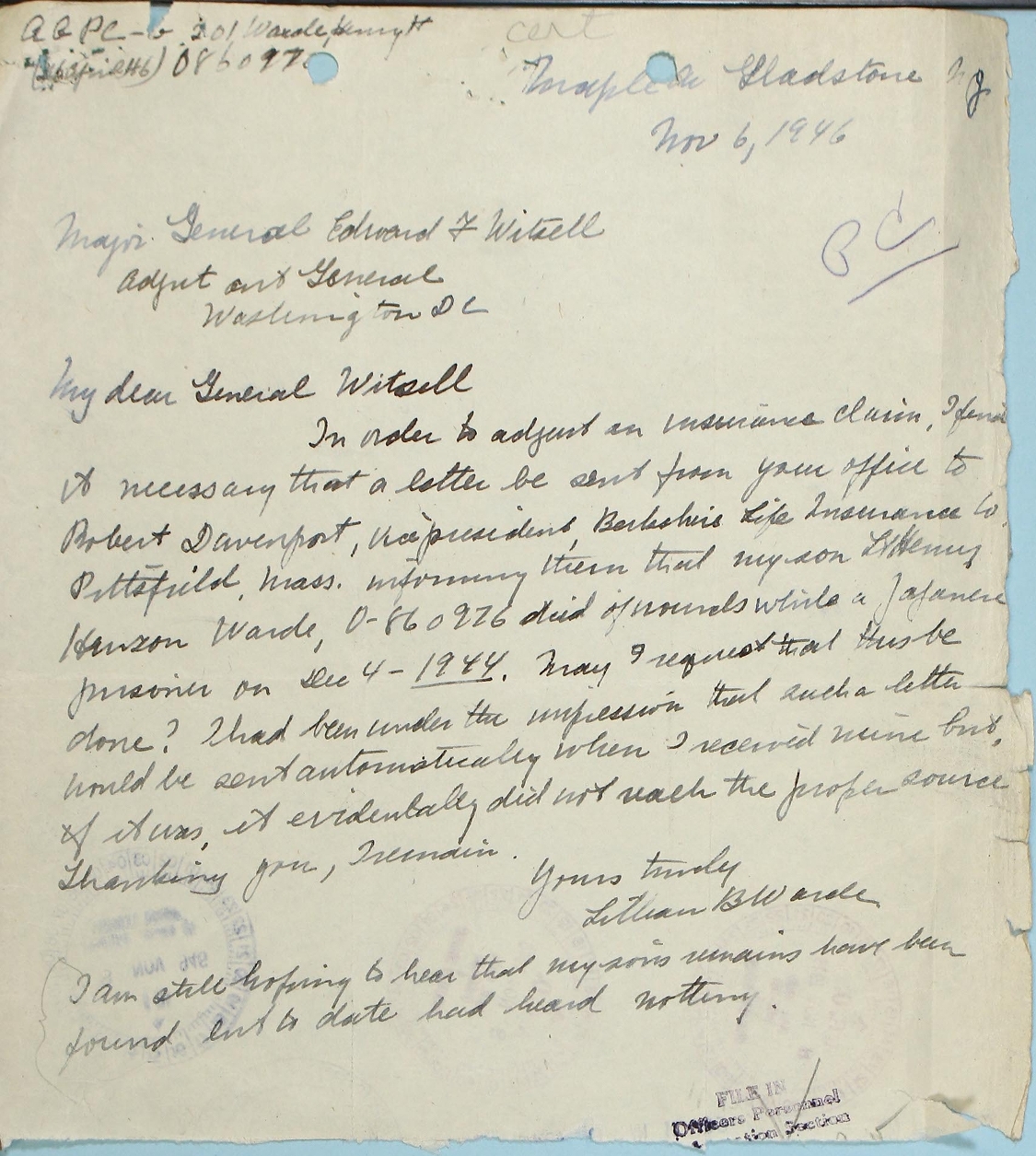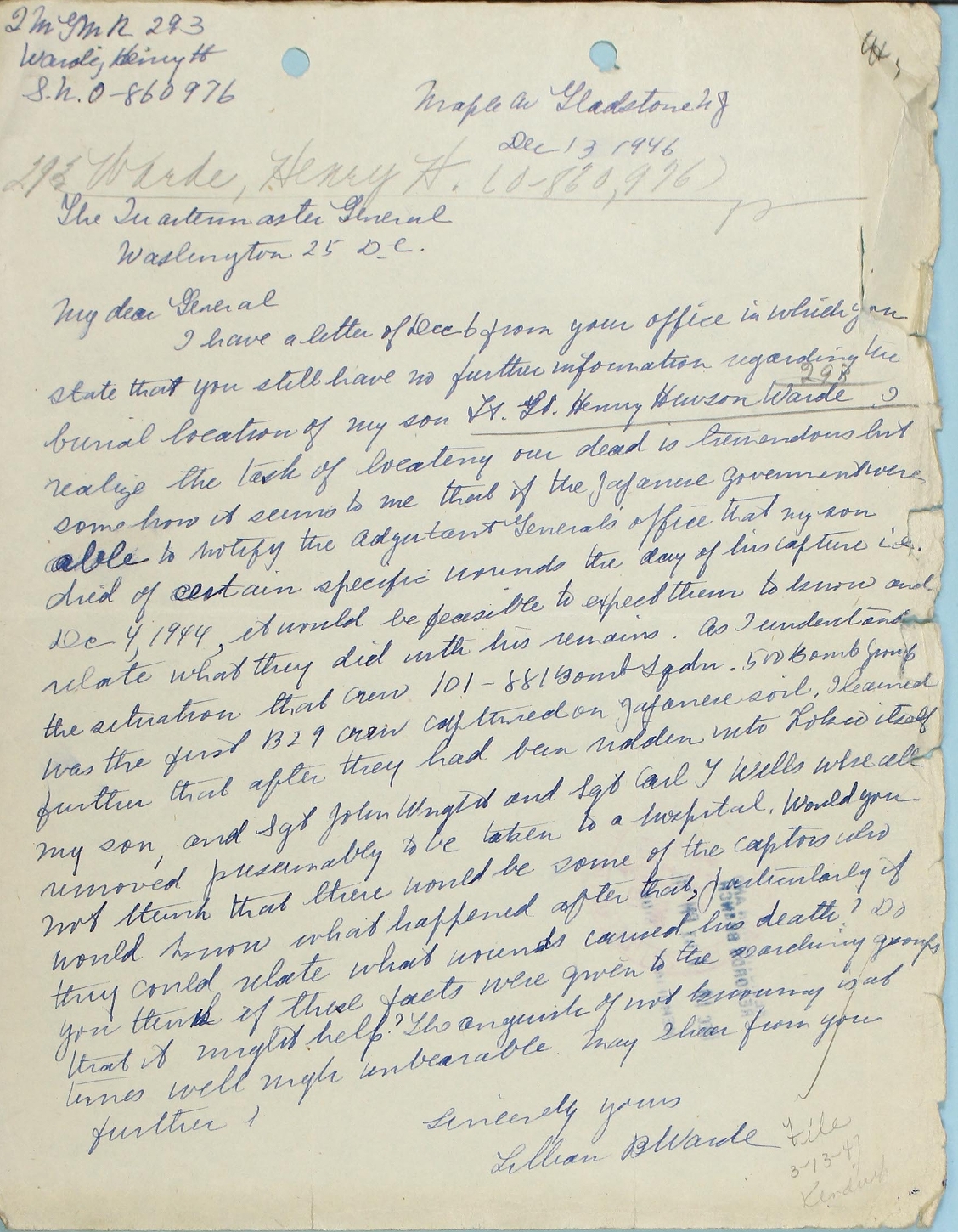 In the 2 Novmeber 1946 letter, Mrs Warde wrote