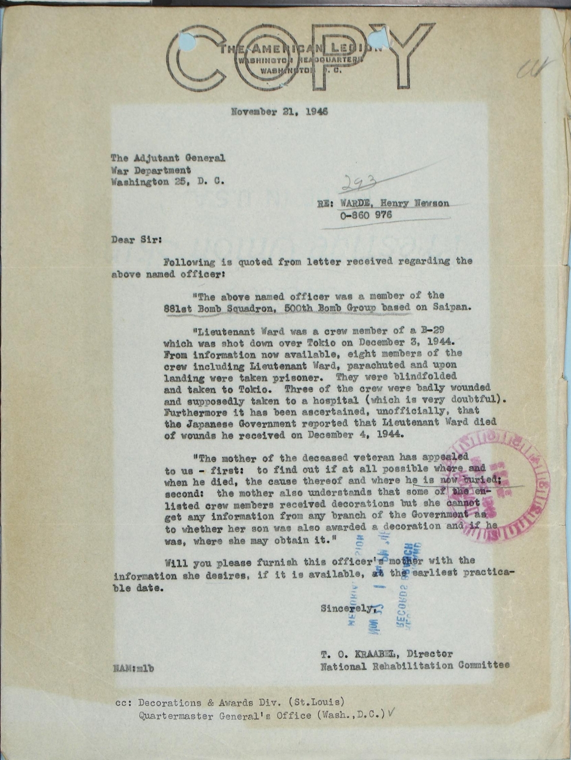 She requested that the Office of the Adjutant General send the letter.