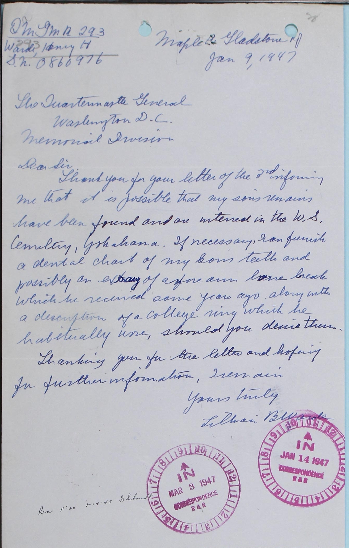 The first is from Major Prenn from the Memorial Division. He informed Mrs. Ward that there was no conclusive information available concerning the recovery and identification of her son. This is followed by a reply from Mrs. Warde on 9 January 1947. BACK TO TOP |