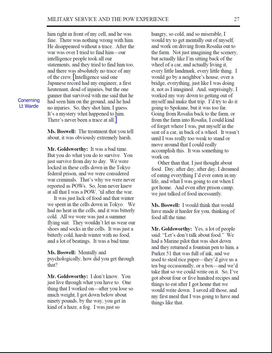 Following his comments concerning Lt Warde are |