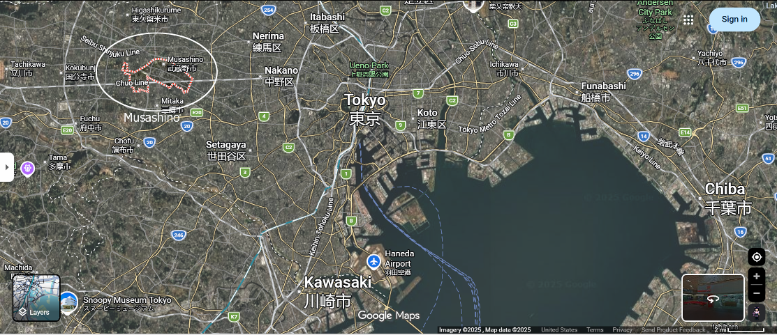 The focus of this page is maps and charts. At the top is a Google Map showing the location of Musashino. A sketch with the locations of the The vertical chart does not have as many details Last is a weather prognostic chart. |