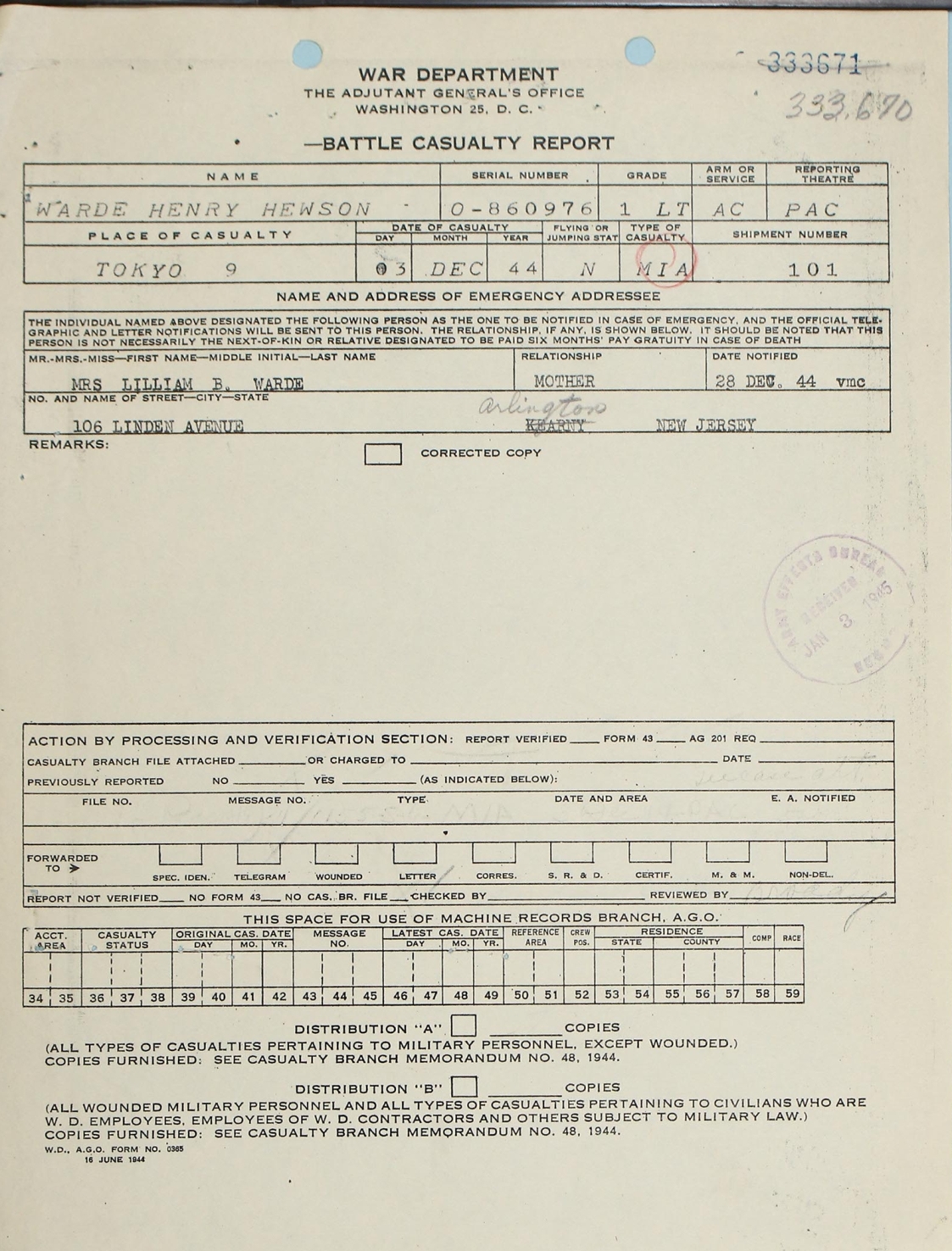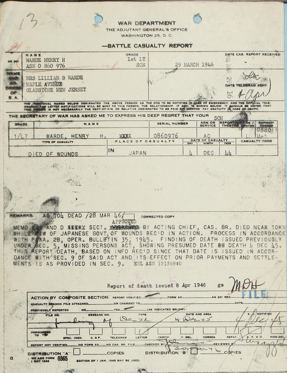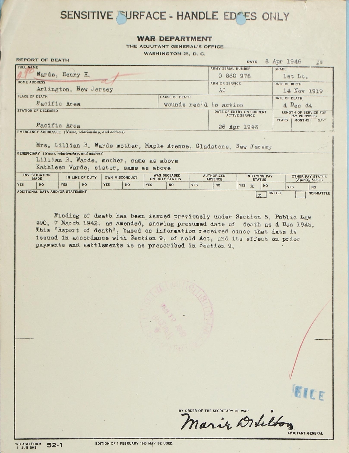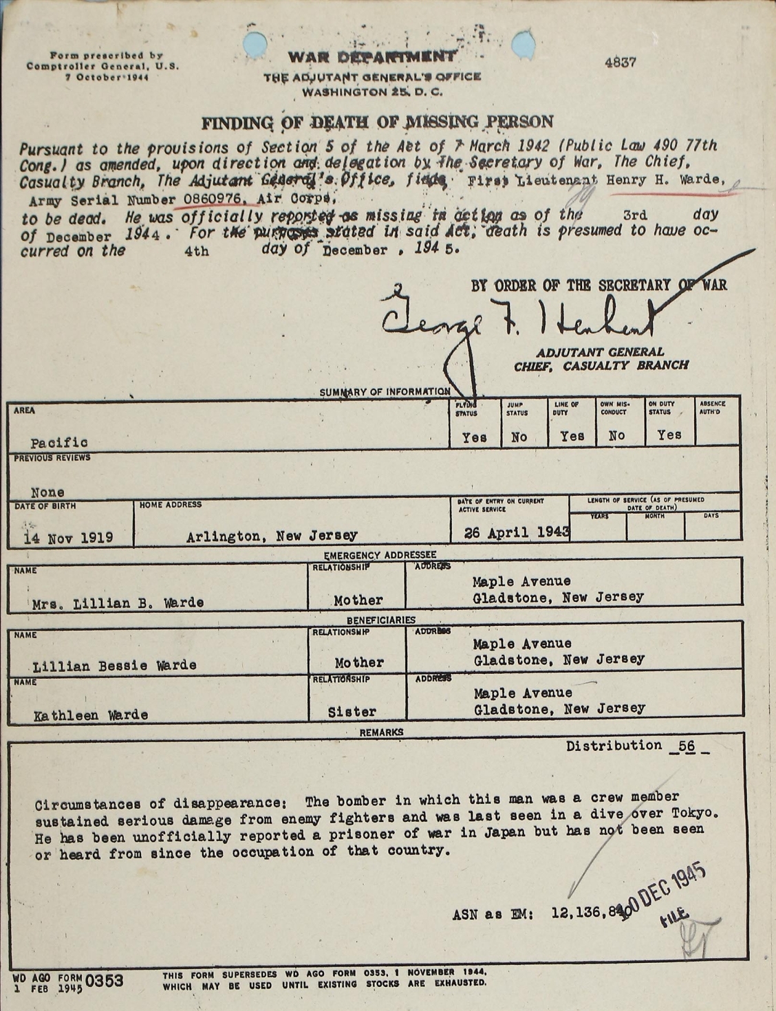 The first document is an undated One year and one day following the date of the crash, Lt Warde's presumed date of death was 4 December 1945. See the The final document is his Report of Death issued 8 April 1946. |