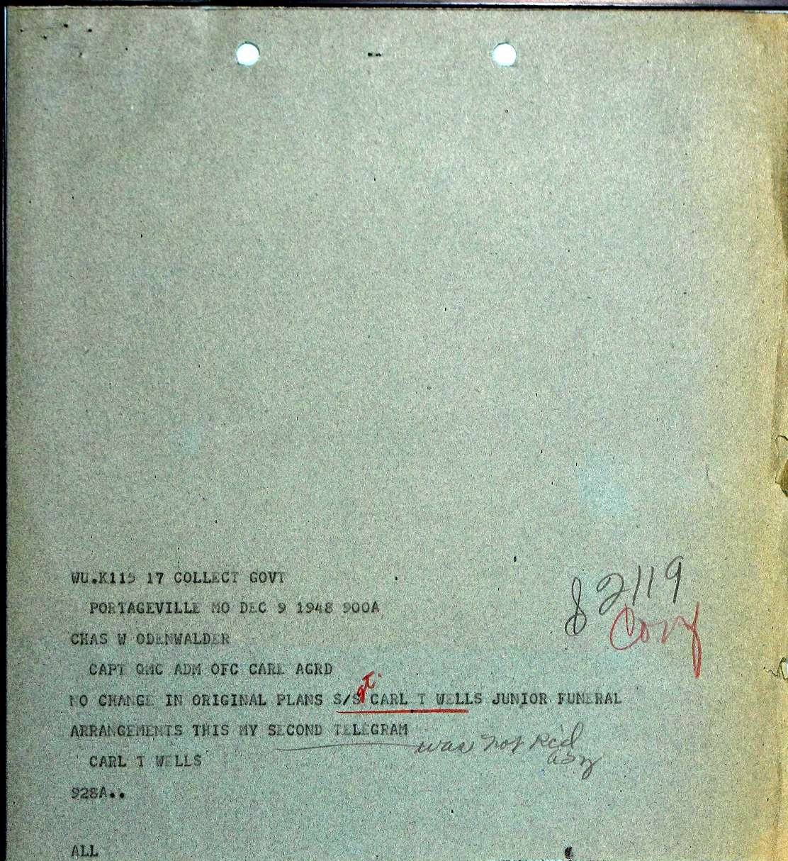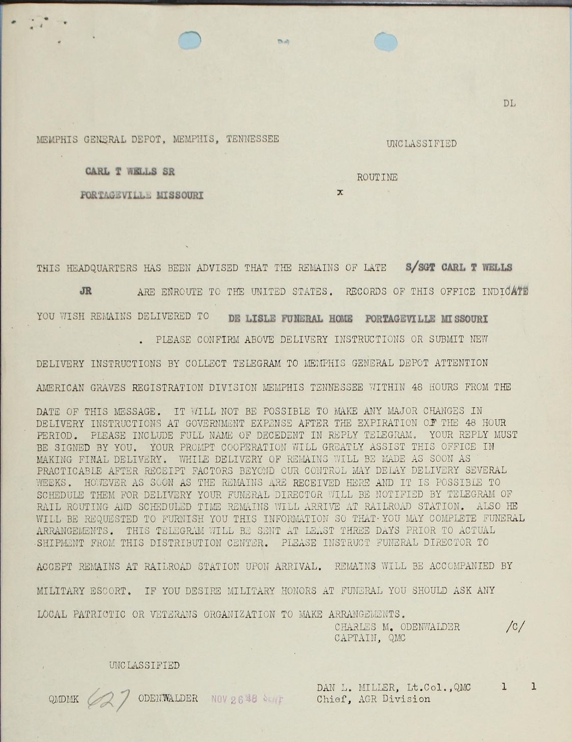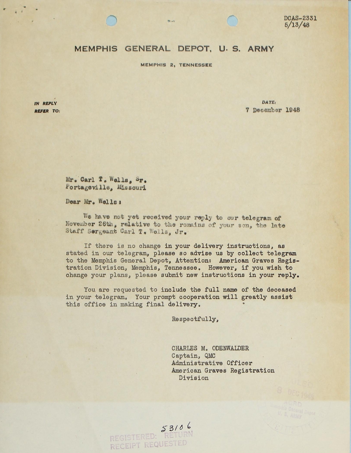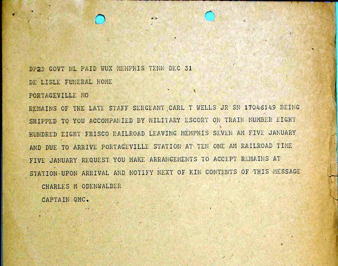 SSgt Wells' remains were scheduled to arrive on 5 January 1949.