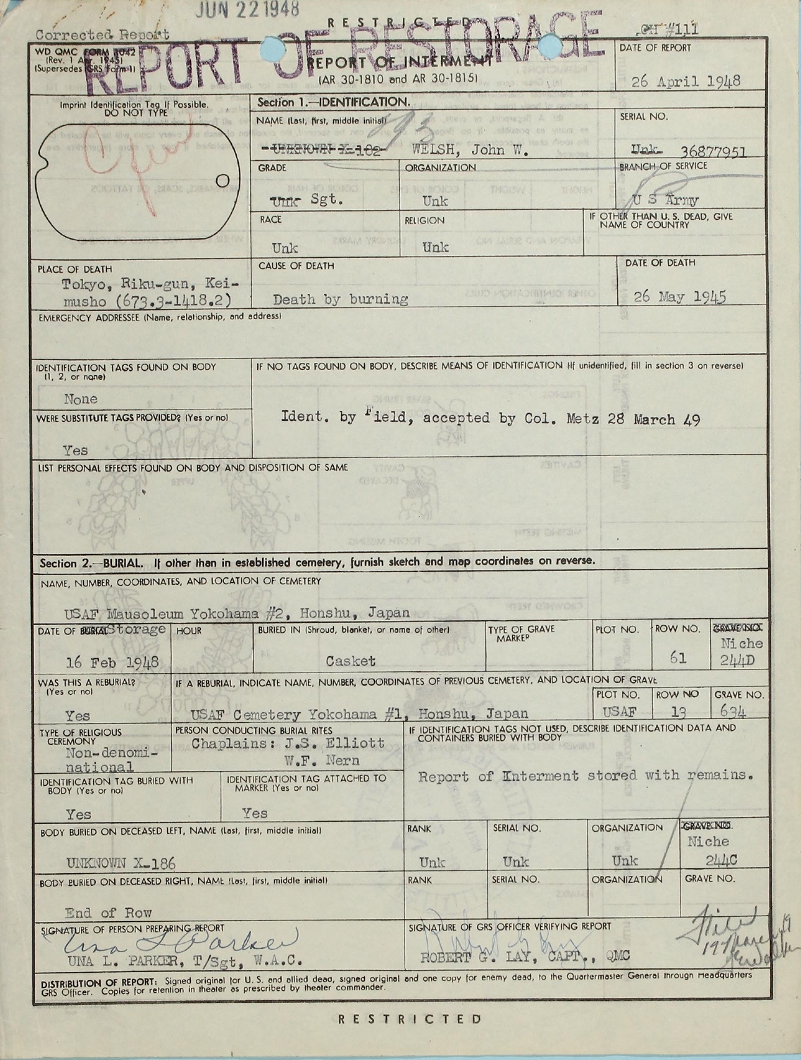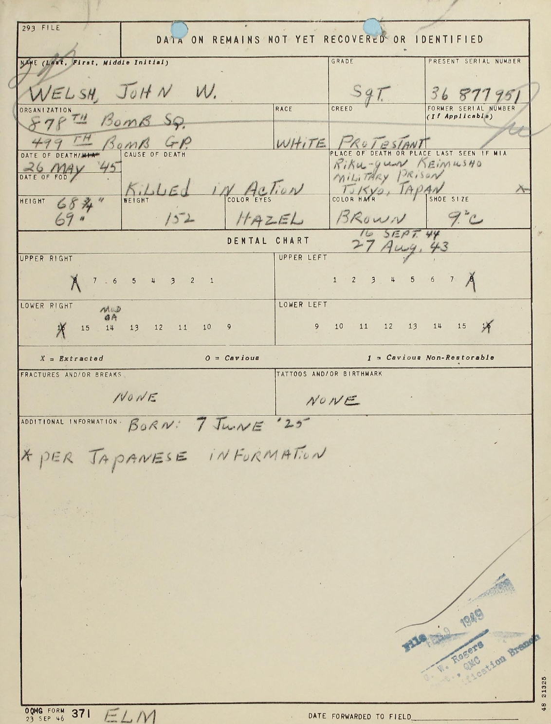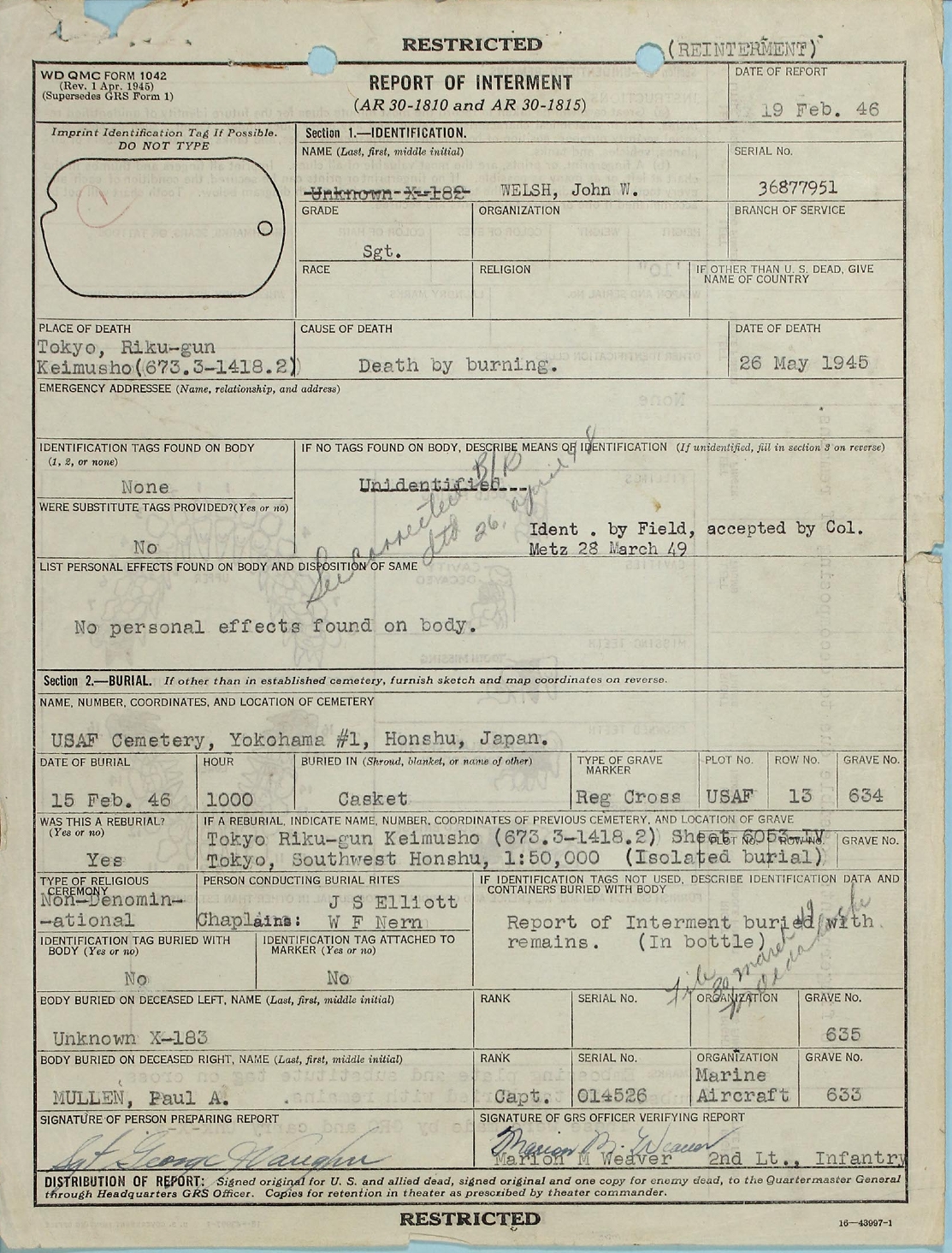 that his identification was accepted by Col Metz on 28 March 1949.