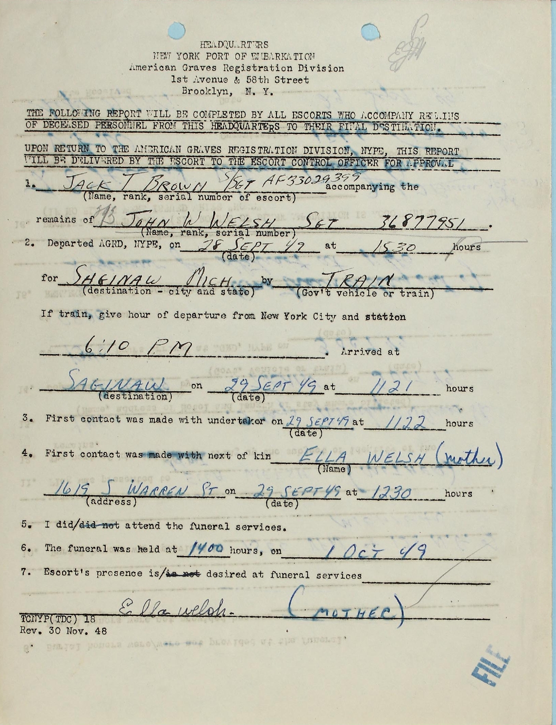 Receipt of Remains. Sgt Welsh's escort was SSgt Jack W Brown, United States Air Force. His signature appears in first document at the time he began his duties as escort. Details of his total time of travel and assistance with Sgt Welsh's remains are in the two handwritten pages. He began the afternoon of 28 September 1949 at the American Graves Registration Division at Brooklyn. His duties concluded the morning of 3 October 1949 back at Brooklyn. |
