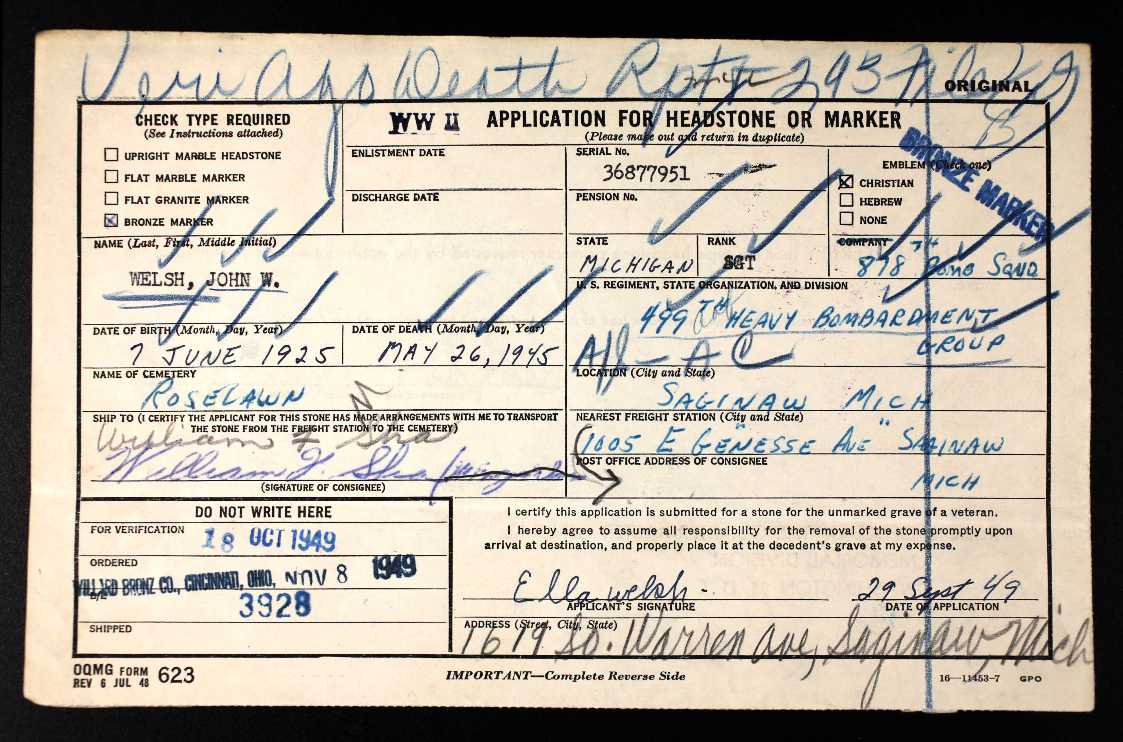 APPLICATION FOR HEADSTONE OR MARKER 29 SEPTEMBER 1949