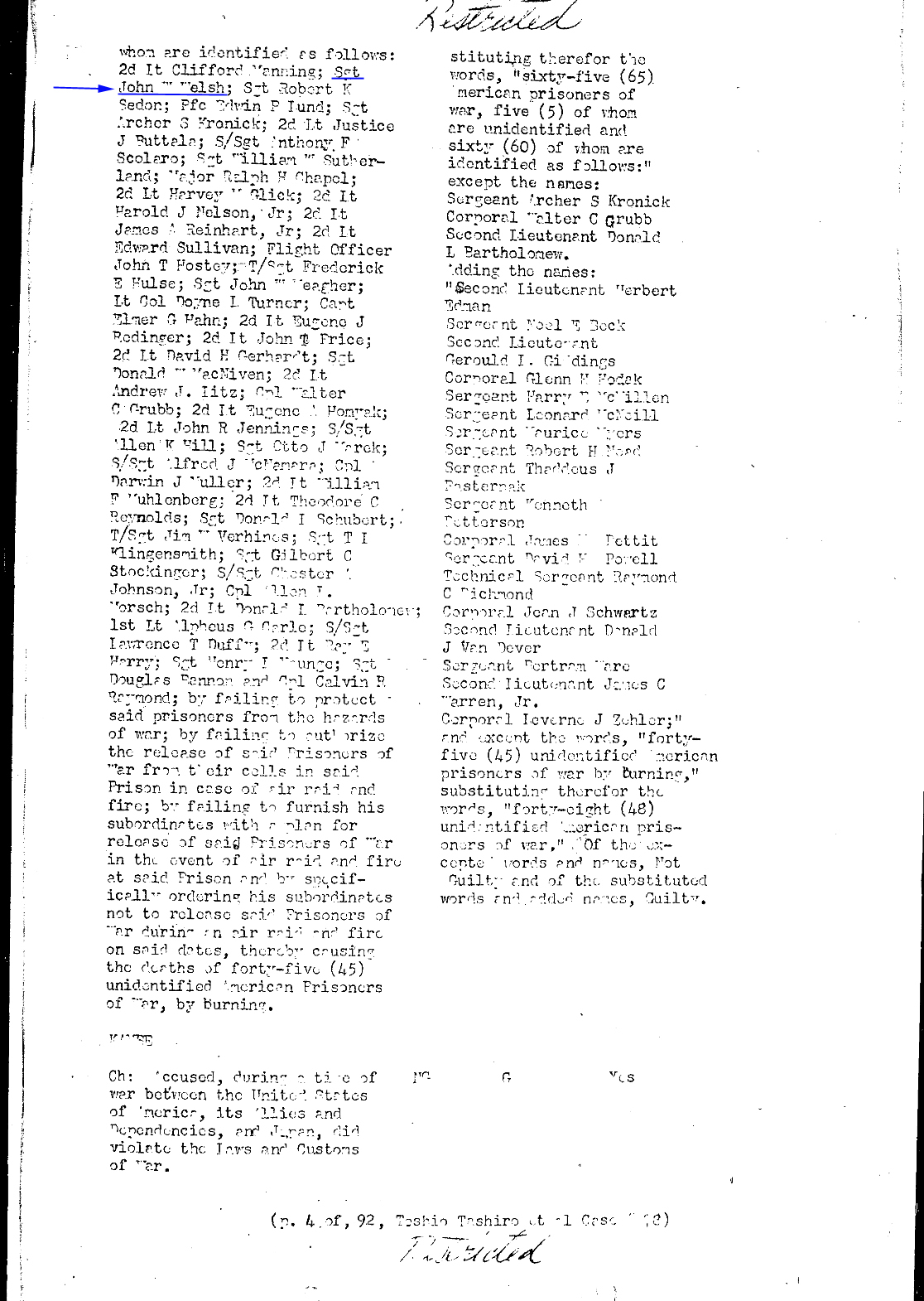 is avaiable in PDF format at the below link Presented below are the first four pages. In Pages 1 and 2 are the names and Personal Data of the five accused. Page 3 begins with Charges and Specifications against Toshio Tashiro. Sgt Welsh's name appears in the upper left corner of Page 4 |
