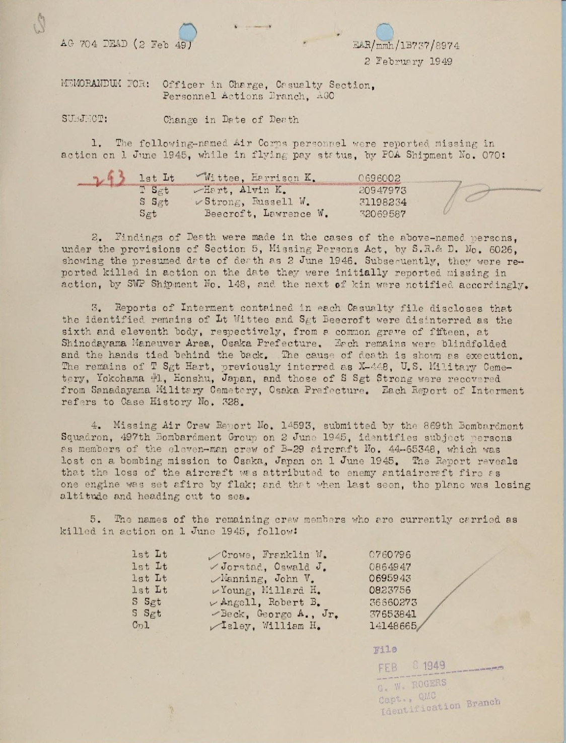 CHANGE IN DATE OF DEATH 2 FEBRUARY 1949 PAGE 1