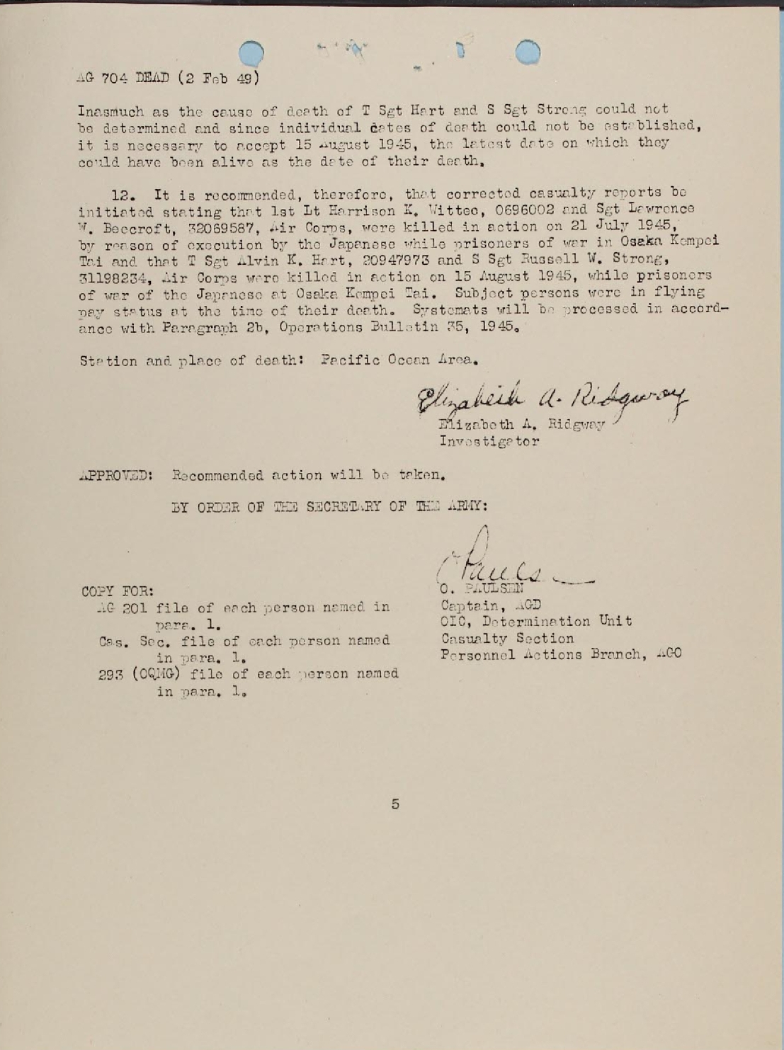 This was written by Elizabeth Ridgway on 2 February 1949. Her recommendation was approved by the Secretary of the Army. The date of this approval is not stated.