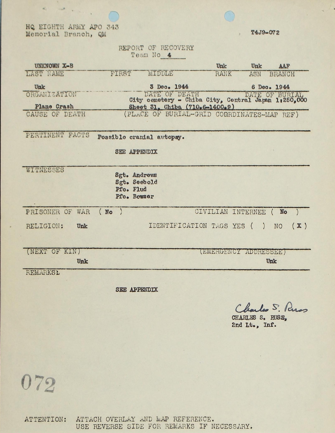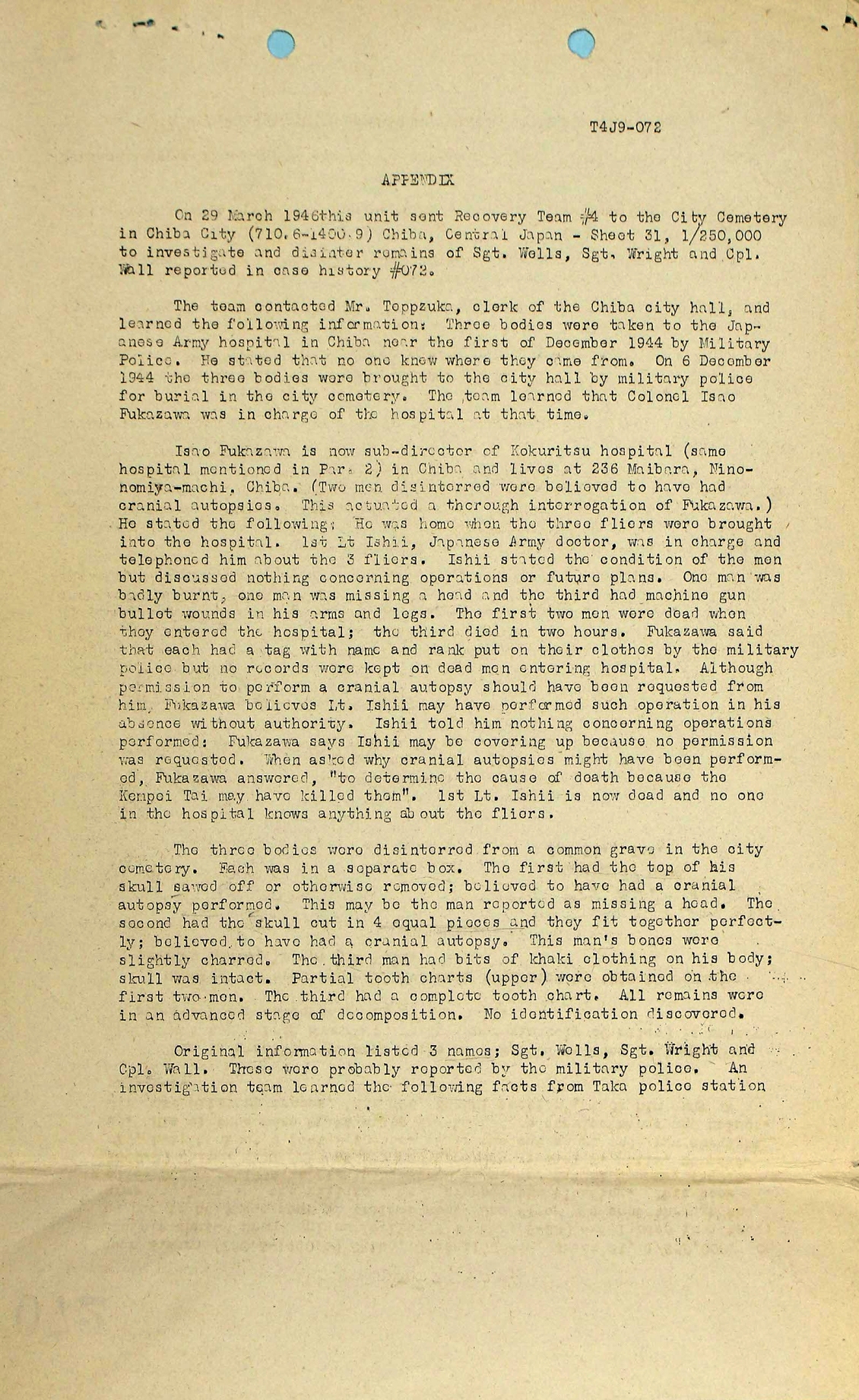 Sgt Wright's remains were recovered by Team 4 of the The two pages of the APPENDIX follow the Report of Recovery. This Appendix is written by Team 4 |